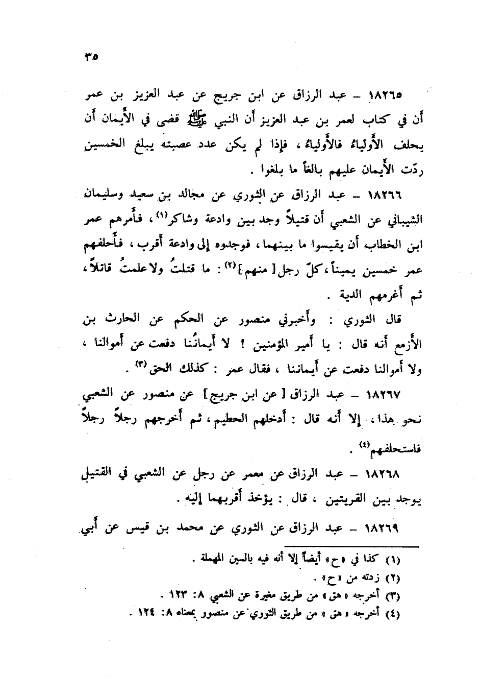 ١٨٢٦٦ - عَنِ الثَّوْرِيِّ , عَنْ مُجَالِدِ بْنِ سَعِيدٍ , وَسُلَيْمَانَ الشَّيْبَانِيِّ , عَنِ الشَّعْبِيِّ , أَنَّ قَتِيلًا وُجِدَ بَيْنَ وَادِعَةَ وَشَاكِرٍ فَأَمَرَهُمْ عُمَرُ بْنُ الْخَطَّابِ أَنْ يَقيسُوا مَا بَيْنَهُمَا , فَوَجَدُوهُ إِلَى وَادِعَةَ أَقْرَبَ «فَأَحْلَفَهُمْ عُمَرُ خَمْسِينَ يَمِينًا , كُلُّ رَجُلٍ مِنْهُمْ , مَا قَتَلْتُ , وَلَا عَلِمْتُ قَاتِلًا , ثُمَّ أَغْرَمَهُمُ الدِّيَةَ» قَالَ الثَّوْرِيُّ: وَأَخْبَرَنِي مَنْصُورٌ , عَنِ الْحَكَمِ , عَنِ الْحَارِثِ بْنِ الْأَزْمَعِ أَنَّهُ قَالَ: يَا أَمِيرَ الْمُؤْمِنِينَ , لَا أَيْمَانُنَا دَفَعَتْ عَنْ أَمْوَالِنَا وَلَا أَمْوَالُنَا دَفَعَتْ عَنْ أَيْمَانِنَا , فَقَالَ عُمَرُ: «كَذَلِكَ الْحَقُّ»
