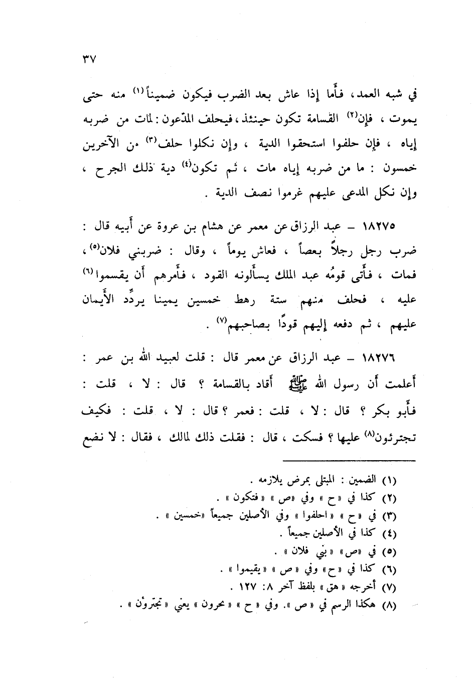 ١٨٢٧٦ - عَنْ مَعْمَرٍ , قَالَ: قُلْتُ لِعُبَيْدِ اللَّهِ بْنِ عُمَرَ: «أَعَلِمْتَ أَنَّ رَسُولَ اللَّهِ صَلَّى اللهُ عَلَيْهِ وَسَلَّمَ أَقَادَ بِالْقَسَامَةِ؟» قَالَ: «لَا» , قُلْتُ: فَأَبُو بَكْرٍ؟ قَالَ: «لَا» , قُلْتُ: فَعُمَرُ؟ قَالَ: «لَا» , قُلْتُ: فَكَيْفَ تَجْتَرِئُونَ عَلَيْهَا؟ فَسَكَتْ قَالَ: فَقُلْتُ ذَلِكَ لِمَالِكٍ فَقَالَ: «لَا نَضَعُ ⦗٣٨⦘ أَمْرَ النَّبِيِّ صَلَّى اللهُ عَلَيْهِ وَسَلَّمَ عَلَى الخَتْلِ لَوِ ابْتُلِيَ بِهَا أَقَادَ بِهَا»