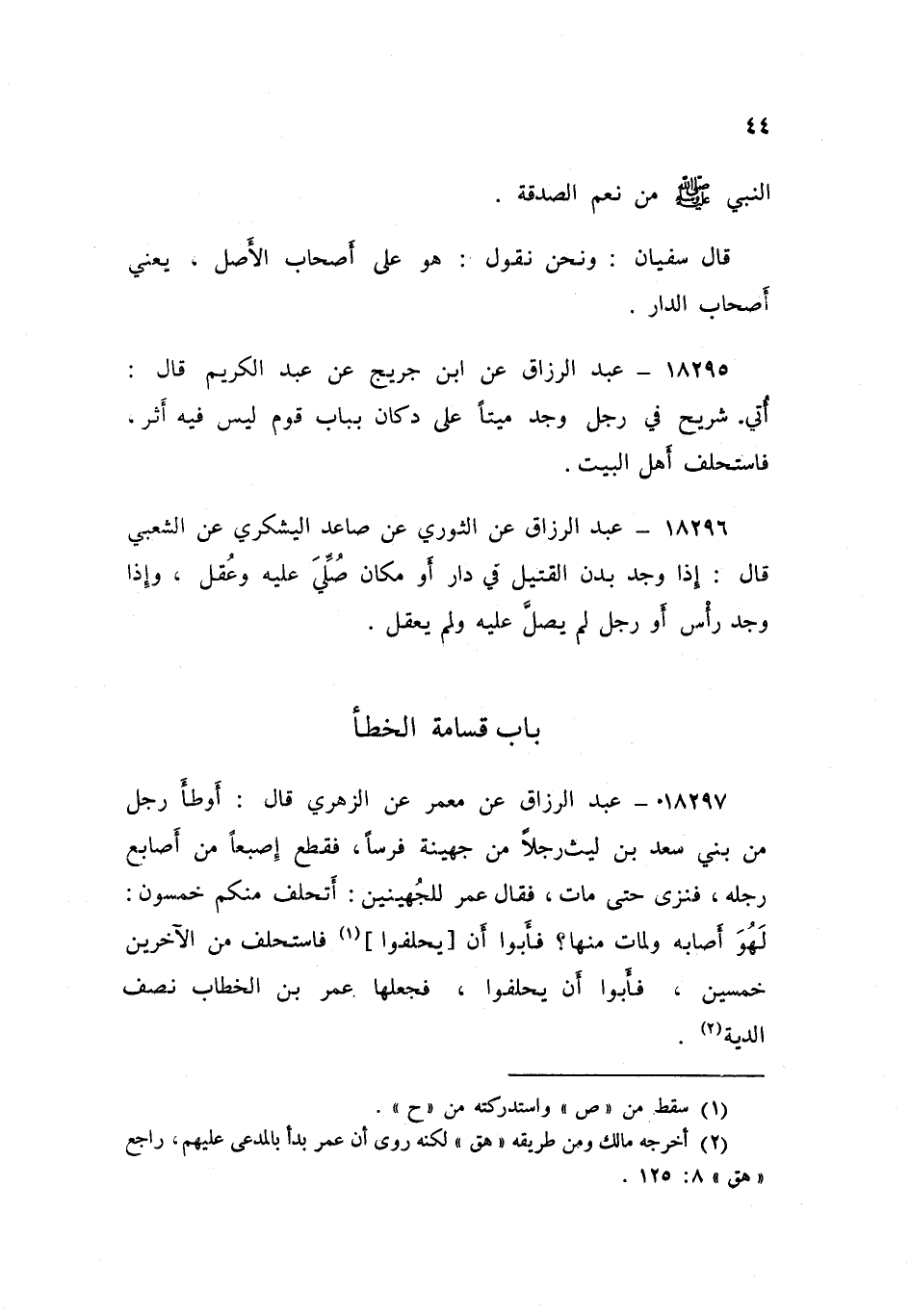 ١٨٢٩٧ - عَنْ مَعْمَرٍ , عَنِ الزُّهْرِيِّ , قَالَ: أَوْطَأَ رَجُلٌ مِنْ بَنِي سَعْدِ بْنِ لَيْثٍ رَجُلًا مِنْ جُهَيْنَةَ فَرَسًا , فَقَطَعَ إِصْبَعًا مِنْ أَصَابِعِ رِجْلِهِ , فَنَزَى حَتَّى مَاتَ , فَقَالَ عُمَرُ لِلْجُهَيْنِيِّنَ: «أَتَحْلِفُ مِنْكُمْ خَمْسُونَ لَهُوَ أَصَابَهُ , ولَمَاتَ مِنْهَا؟» فَأَبَوْا أَنْ يَحْلِفُوا , فَاسْتَحْلَفَ مِنَ الْآخَرِينَ خَمْسِينَ فَأَبَوْا أَنْ يَحْلِفُوا , فَجَعَلَهَا عُمَرُ بْنُ الْخَطَّابِ نِصْفَ الدِّيَةِ، عَبْدُ الرَّزَّاقِ،