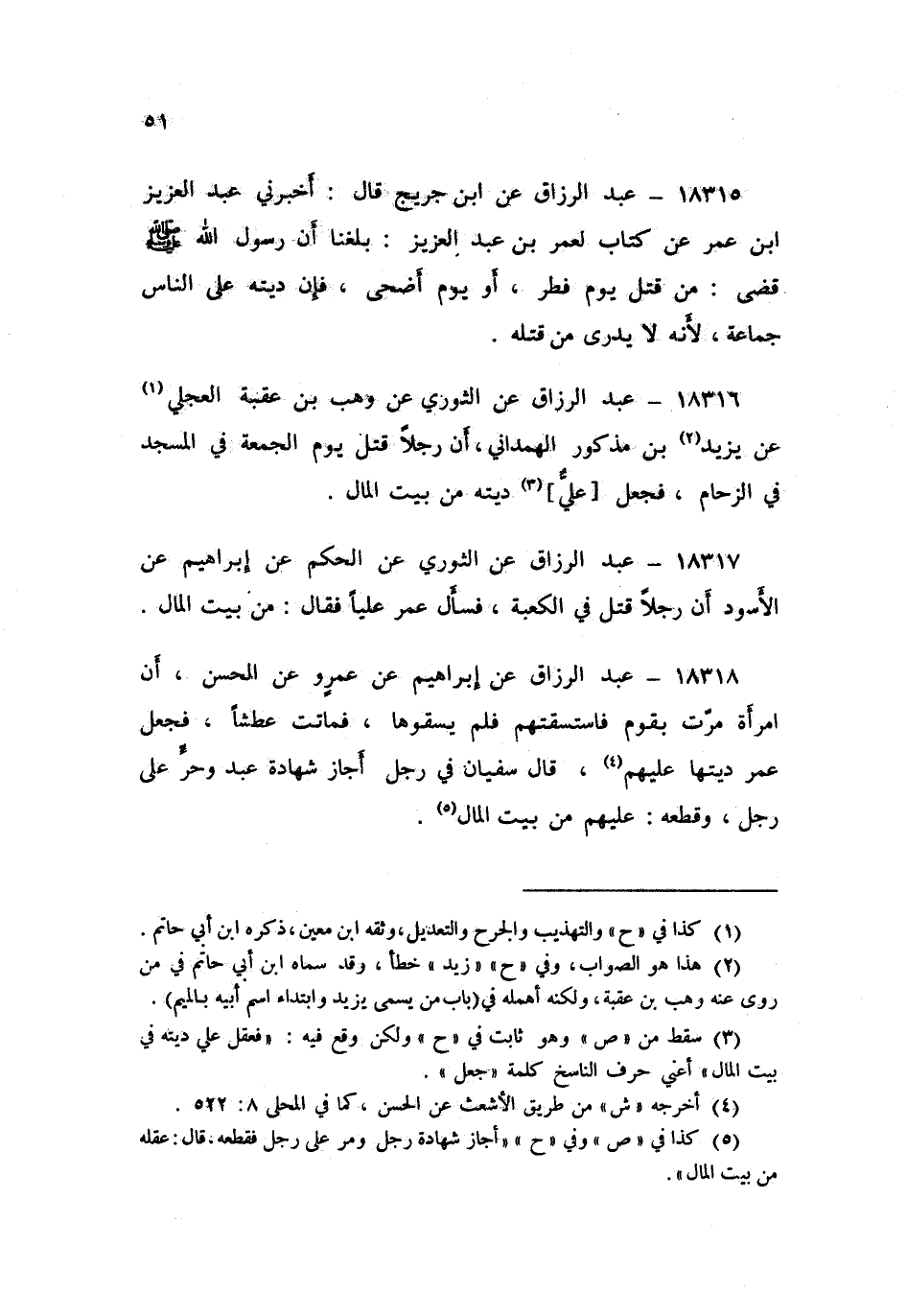 ١٨٣١٧ - عَنِ الثَّوْرِيِّ , عَنِ الْحَكَمِ , عَنْ إِبْرَاهِيمَ , عَنِ الْأَسْوَدِ , أَنَّ رَجُلًا قُتِلَ فِي الْكَعْبَةِ فَسَأَلَ عُمَرُ عَلِيًّا فَقَالَ: «مِنْ بَيْتِ الْمَالِ»