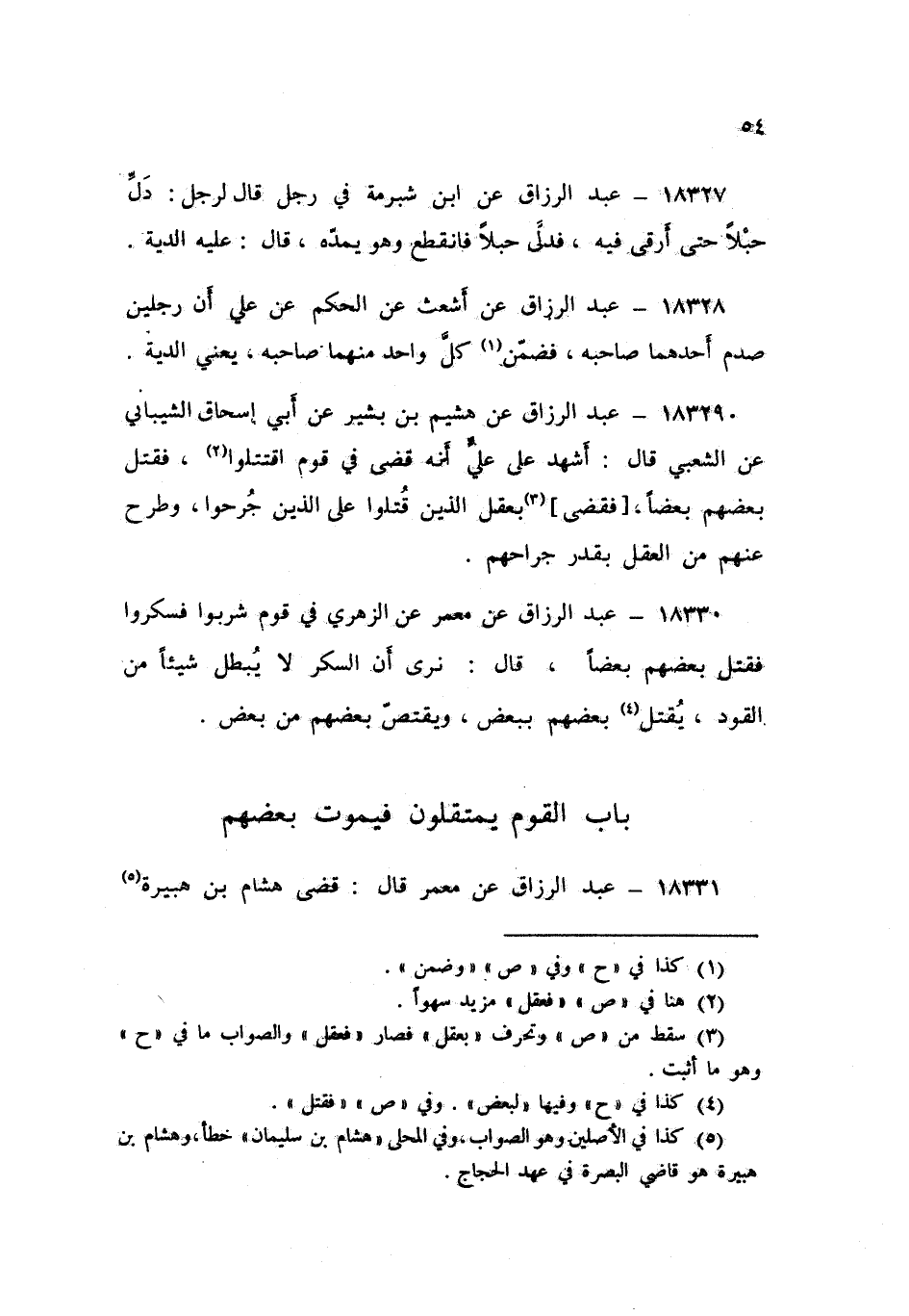 ١٨٣٣١ - عَنْ مَعْمَرٍ , قَالَ: قَضَى هِشَامُ بْنُ هُبَيْرَةَ فِي قَوْمٍ كَانُوا فِي مَاءٍ , فَتَمَاقَلُوا فَمَاتَ بَيْنَهُمْ وَاحِدٌ مِنْهُمْ فِي الْمَاءِ , فَشَهِدَ اثْنَانِ عَلَى ثَلَاثَةٍ , وَشَهِدَ ثَلَاثَةٌ عَلَى اثْنَيْنِ , «فَقَضَى بِدِيَتِهِ عَلَيْهِمْ جَمِيعًا»