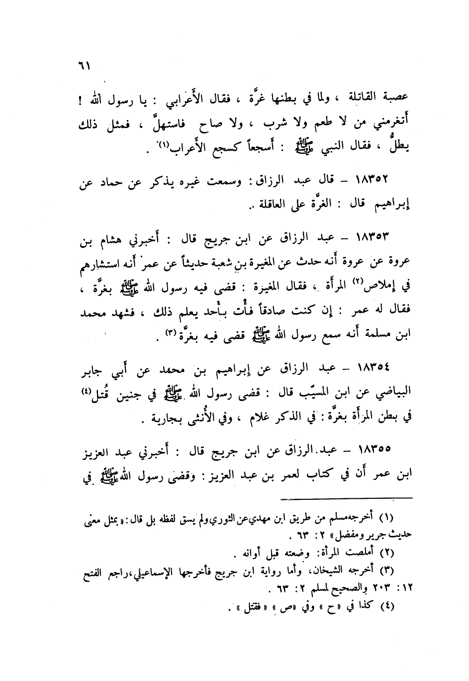 ١٨٣٥٣ - عَنِ ابْنِ جُرَيْجٍ , قَالَ: أَخْبَرَنِي هِشَامُ بْنُ عُرْوَةَ , عَنْ عُرْوَةَ , أَنَّهُ حَدَّثَ عَنِ الْمُغِيرَةِ بْنِ شُعْبَةَ , حَدِيثًا عَنْ عُمَرَ أَنَّهُ اسْتَشَارَهُمْ فِي إِمْلَاصِ الْمَرْأَةِ , فَقَالَ الْمُغِيرَةُ: «قَضَى فِيهِ رَسُولُ اللَّهِ صَلَّى اللهُ عَلَيْهِ وَسَلَّمَ بِغُرَّةٍ» فَقَالَ لَهُ عُمَرُ: إِنْ كُنْتُ صَادِقًا فَأْتِ بِأَحَدٍ يَعْلَمُ ذَلِكَ: فَشَهِدَ مُحَمَّدُ بْنُ مَسْلَمَةَ أَنَّهُ سَمِعَ رَسُولَ اللَّهِ صَلَّى اللهُ عَلَيْهِ وَسَلَّمَ «قَضَى فِيهِ بِغُرَّةٍ»
