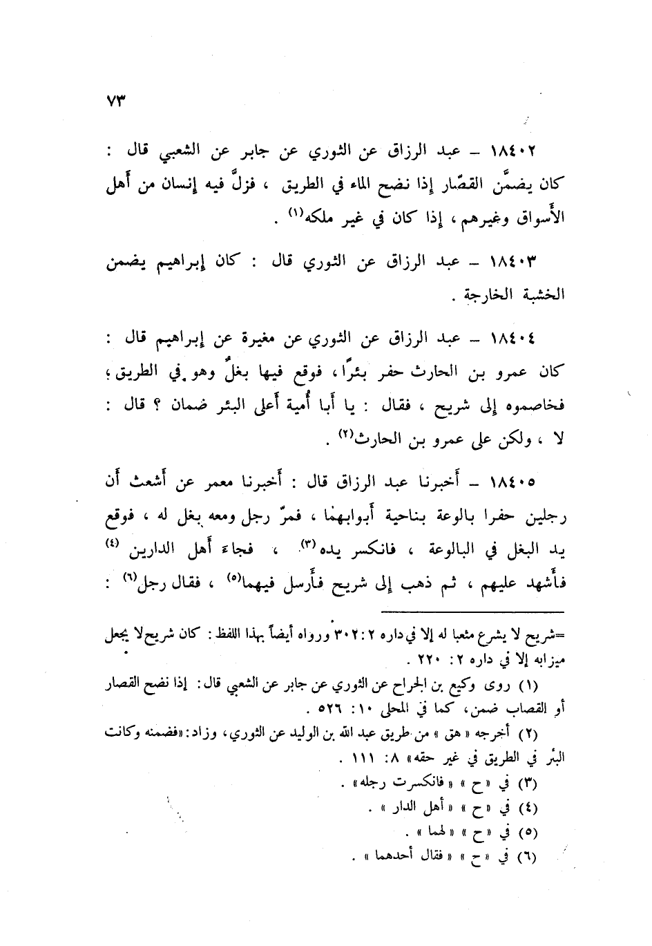 ١٨٤٠٥ - عَبْدُ الرَّزَّاقِ، أَخْبَرَنَا مَعْمَرٌ , عَنْ أَشْعَثَ , أَنَّ رَجُلَيْنِ حَفَرَا بَالُوعَةً بِنَاحِيَةِ أَبْوَابِهِمَا , فَمَرَّ رَجُلٌ وَمَعَهُ بَغْلٌ لَهُ , فَوَقَعَ يَدُ الْبَغْلِ فِي البَالُوعَةِ , فانْكَسَرَ يَدُهُ , فَجَاءَ أَهْلُ الدَّارَيْنِ , فَأَشْهَدَ عَلَيْهِمْ , ثُمَّ ذَهَبَ إِلَى شُرَيْحٍ فَأَرْسَلَ لَهُمَا , فَقَالَ رَجُلٌ ⦗٧٤⦘: يَا شُرَيْحُ: إِنِّي رَجُلٌ مِسْكِينُ وَإِنَّ هَذَيْنِ عَيْنَانِ فَقَالَ أَحَدُهُمَا: مَا كُنْتُ أَظُنُّ الْبِئْرَ تُضَمَّنُ , فَقَالَ شُرَيْحٌ: «بَلَى إِذَا حَفَرْتَهَا فِي غَيْرِ سَمَائِكَ» قَالَ: فَقَامَا إِلَى نَاحِيَةِ الدَّارِ , فَعَدَّا لَهُ ثَمَنَ الْبَغْلِ اسْمُ الرَّجُلَيْنِ الْحَارِثُ بْنُ نَوْفَلٍ وَالْحَارِثُ بْنُ ضِرَارٍ
