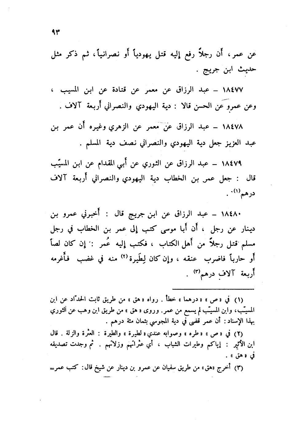 ١٨٤٧٩ - عَنِ الثَّوْرِيِّ , عَنِ أَبِي الْمِقْدَامِ , عَنِ ابْنِ الْمُسَيِّبِ , قَالَ: جَعَلَ عُمَرُ بْنُ الْخَطَّابِ: «دِيَةَ الْيَهُودِيِّ وَالنَّصْرَانِيِّ أَرْبَعَةَ آلَافِ دِرْهَمٍ»