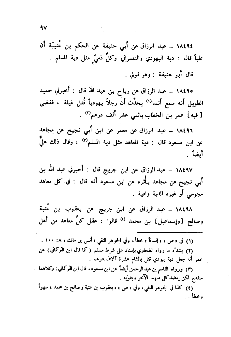 ١٨٤٩٨ - عَنِ ابْنِ جُرَيْجٍ , عَنْ يَعْقُوبَ بْنِ عُتْبَةَ , وَصَالِحٍ , وَإِسْمَاعِيلَ بْنِ مُحَمَّدٍ , قَالُوا: «عَقْلُ كُلِّ مُعَاهَدٍ مِنْ أَهْلِ الْكُفْرِ وَمُعَاهَدَةٍ كَعَقْلِ الْمُسْلِمِينَ ذُكْرَانِهِمْ وَإِنَاثِهِمْ , جَرَتْ بِذَلِكَ السُّنَّةُ فِي عَهْدِ رَسُولِ اللَّهِ صَلَّى اللهُ عَلَيْهِ وَسَلَّمَ»