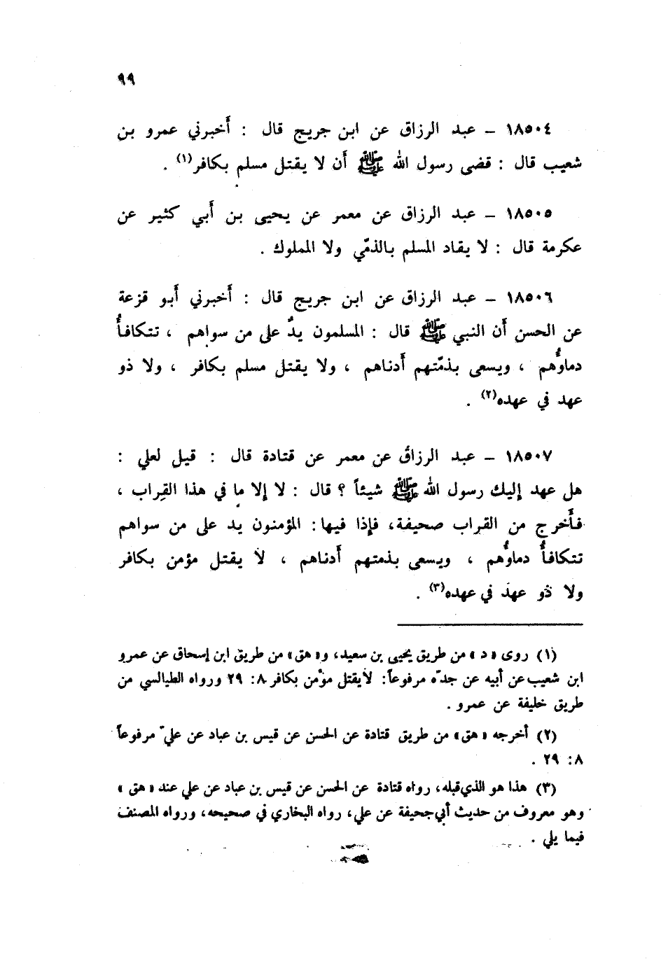 ١٨٥٠٧ - عَنْ مَعْمَرٍ , عَنْ قَتَادَةَ , قَالَ: قِيلَ لِعَلِيٍّ هَلْ عَهِدَ إِلَيْكَ رَسُولُ اللَّهِ صَلَّى اللهُ عَلَيْهِ وَسَلَّمَ شَيْئًا؟ قَالَ: لَا إِلَّا مَا فِي هَذَا الْقِرَابَ , فَأَخْرَجَ مِنَ الْقِرَابِ صَحِيفَةً , فَإِذَا فِيهَا: «الْمُؤْمِنُونَ يَدٌ عَلَى مَنْ سِوَاهُمْ تَتَكَافَأُ دِمَاؤُهُمْ وَيَسْعَى بِذِمَّتِهِمْ أَدْنَاهُمْ , لَا يُقْتَلُ مُؤْمِنٌ بِكَافِرٍ , وَلَا ذُو عَهْدٍ فِي عَهْدِهِ»