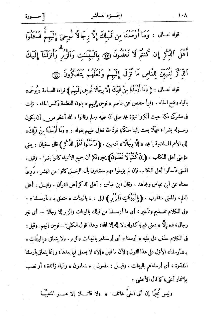 وَما أَرْسَلْنا مِنْ قَبْلِكَ إِلاَّ رِجالاً نُوحِي إِلَيْهِمْ فَسْئَلُوا أَهْلَ الذِّكْرِ إِنْ كُنْتُمْ لَا تَعْلَمُونَ (٤٣) بِالْبَيِّناتِ وَالزُّبُرِ وَأَنْزَلْنا إِلَيْكَ الذِّكْرَ لِتُبَيِّنَ لِلنَّاسِ مَا نُزِّلَ إِلَيْهِمْ وَلَعَلَّهُمْ يَتَفَكَّرُونَ (٤٤)