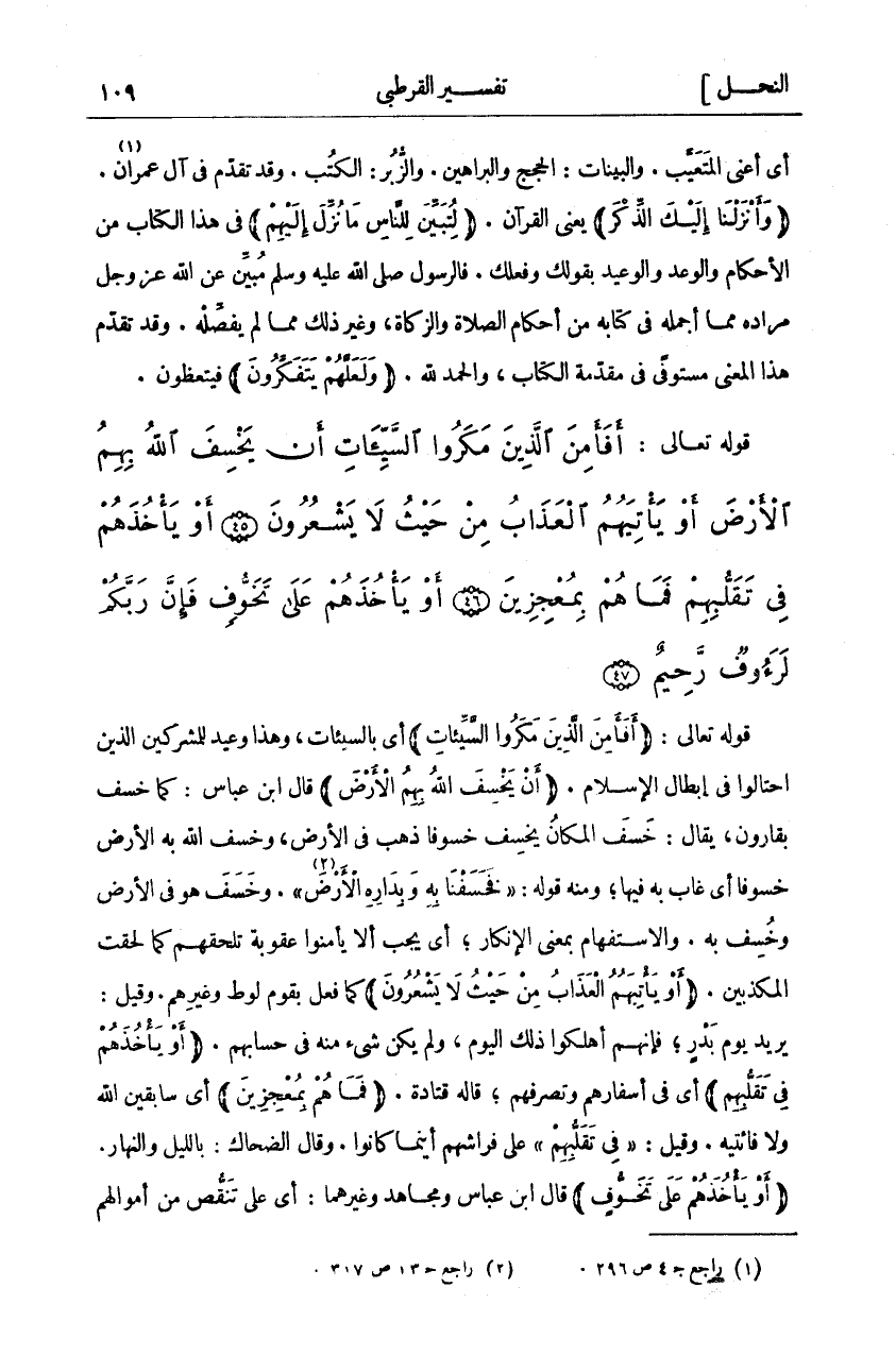 قَوْلُهُ تَعَالَى: (أَفَأَمِنَ الَّذِينَ مَكَرُوا السَّيِّئاتِ) أَيْ بِالسَّيِّئَاتِ، وَهَذَا وَعِيدٌ لِلْمُشْرِكِينَ الَّذِينَ احْتَالُوا فِي إِبْطَالِ الْإِسْلَامِ. (أَنْ يَخْسِفَ اللَّهُ بِهِمُ الْأَرْضَ) قَالَ ابْنُ عَبَّاسٍ: كَمَا خَسَفَ بِقَارُونَ، يُقَالُ: خَسَفَ الْمَكَانُ يَخْسِفُ خُسُوفًا ذَهَبَ فِي الْأَرْضِ، وَخَسَفَ اللَّهُ بِهِ الْأَرْضَ خُسُوفًا أَيْ غَابَ بِهِ فِيهَا، وَمِنْهُ قَوْلُهُ:" فَخَسَفْنا بِهِ وَبِدارِهِ الْأَرْضَ «٢» ". وَخَسَفَ هُوَ فِي الْأَرْضِ وَخُسِفَ بِهِ. وَالِاسْتِفْهَامُ بِمَعْنَى الْإِنْكَارِ، أَيْ يَجِبُ أَلَّا يَأْمَنُوا عُقُوبَةً تَلْحَقُهُمْ كَمَا لَحِقَتِ الْمُكَذِّبِينَ. (أَوْ يَأْتِيَهُمُ الْعَذابُ مِنْ حَيْثُ لَا يَشْعُرُونَ) كَمَا فُعِلَ بِقَوْمِ لُوطٍ وَغَيْرِهِمْ. وَقِيلَ: يُرِيدُ يَوْمَ بَدْرٍ، فَإِنَّهُمْ أُهْلِكُوا ذَلِكَ الْيَوْمَ، وَلَمْ يَكُنْ شي مِنْهُ فِي حِسَابِهِمْ. (أَوْ يَأْخُذَهُمْ فِي تَقَلُّبِهِمْ) أي في أسفارهم وتصرفهم، قاله قتادة. (فَما هُمْ بِمُعْجِزِينَ) أي سابقين لله ولا فائتيه. وَقِيلَ:" فِي تَقَلُّبِهِمْ" عَلَى فِرَاشِهِمْ أَيْنَمَا كَانُوا. وقال الضحاك: بالليل والنهار. (أَوْ يَأْخُذَهُمْ عَلى تَخَوُّفٍ) قَالَ ابْنُ عَبَّاسٍ ومجاهد وغيرهما: أي على تنقص من أموالهم