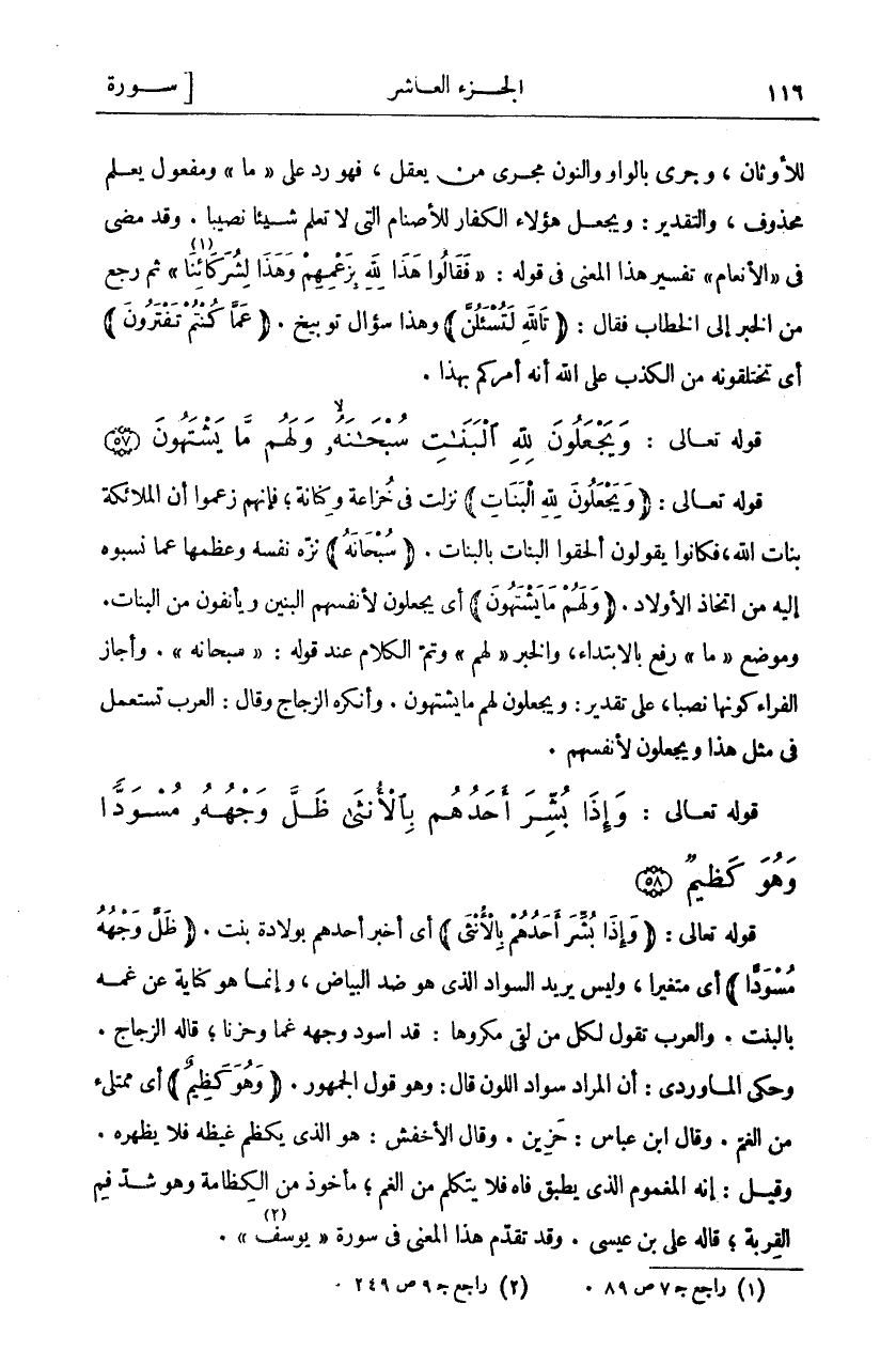 قَوْلُهُ تَعَالَى: (وَيَجْعَلُونَ لِلَّهِ الْبَناتِ) نَزَلَتْ فِي خُزَاعَةَ وَكِنَانَةَ، فَإِنَّهُمْ زَعَمُوا أَنَّ الْمَلَائِكَةَ بَنَاتُ اللَّهِ، فَكَانُوا يَقُولُونَ أَلْحِقُوا الْبَنَاتِ بِالْبَنَاتِ. (سُبْحانَهُ) نَزَّهَ نَفْسَهُ وَعَظَّمَهَا عَمَّا نَسَبُوهُ إِلَيْهِ مِنَ اتِّخَاذِ الْأَوْلَادِ. (وَلَهُمْ مَا يَشْتَهُونَ) أَيْ يَجْعَلُونَ لِأَنْفُسِهِمُ الْبَنِينَ وَيَأْنَفُونَ مِنَ الْبَنَاتِ. وَمَوْضِعُ" مَا" رَفْعٌ بِالِابْتِدَاءِ، وَالْخَبَرُ" لَهُمْ" وَتَمَّ الْكَلَامُ عِنْدَ قَوْلِهِ:" سُبْحانَهُ". وَأَجَازَ الْفَرَّاءُ كَوْنَهَا نَصْبًا، عَلَى تَقْدِيرِ: وَيَجْعَلُونَ لَهُمْ مَا يَشْتَهُونَ. وَأَنْكَرَهُ الزَّجَّاجُ وَقَالَ: الْعَرَبُ تَسْتَعْمِلُ فِي مِثْلِ هَذَا وَيَجْعَلُونَ لأنفسهم.