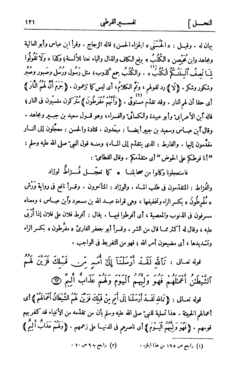 بيان له. وقيل:" الْحُسْنى " الجزاء الحسن، قال الزَّجَّاجُ. وَقَرَأَ ابْنُ عَبَّاسٍ وَأَبُو الْعَالِيَةِ وَمُجَاهِدٌ وَابْنُ مُحَيْصِنٍ" الْكَذِبَ" بِرَفْعِ الْكَافِ وَالذَّالِ وَالْبَاءِ نَعْتًا لِلْأَلْسِنَةِ، وَكَذَا" وَلا تَقُولُوا لِما تَصِفُ أَلْسِنَتُكُمُ الْكَذِبَ «١» ". وَالْكُذُبُ جَمْعُ كَذُوبٍ، مِثْلَ رَسُولٍ ورسل وصبور وصبر وشكور وشكر. (لا) رد لقولهم، وتم الكلام، أي ليس كما تزعمون. (جَرَمَ أَنَّ لَهُمُ النَّارَ) أي حقا أن لهم النار. وقد تقدم مستوفى «٢». (وَأَنَّهُمْ مُفْرَطُونَ) مُتْرَكُونَ مَنْسِيُّونَ فِي النَّارِ، قَالَهُ ابْنُ الْأَعْرَابِيِّ وَأَبُو عُبَيْدَةَ وَالْكِسَائِيُّ وَالْفَرَّاءُ، وَهُوَ قَوْلُ سَعِيدِ بْنِ جُبَيْرٍ وَمُجَاهِدٍ. وَقَالَ ابْنُ عَبَّاسٍ وَسَعِيدُ بْنُ جُبَيْرٍ أَيْضًا: مُبْعَدُونَ. قَتَادَةُ وَالْحَسَنُ: مُعَجَّلُونَ إِلَى النَّارِ مُقَدَّمُونَ إِلَيْهَا. وَالْفَارِطُ: الَّذِي يَتَقَدَّمُ إِلَى الْمَاءِ، وَمِنْهُ قَوْلُ النَّبِيِّ صَلَّى اللَّهُ عَلَيْهِ وَسَلَّمَ: (أَنَا فَرَطُكُمْ عَلَى الْحَوْضِ) أَيْ مُتَقَدِّمُكُمْ. وَقَالَ الْقُطَامِيُّ: