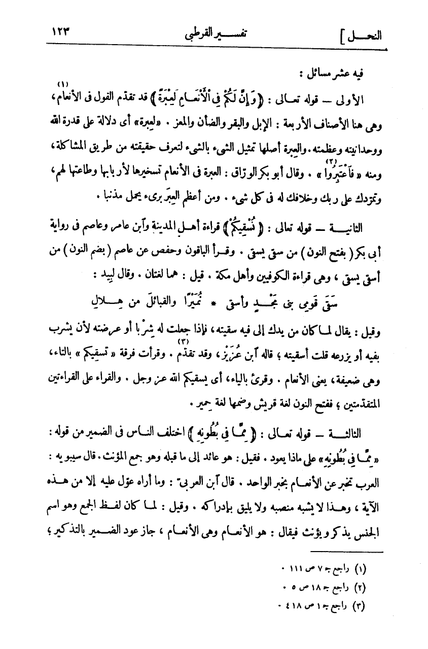فِيهِ عَشْرُ مَسَائِلَ: الْأُولَى- قَوْلُهُ تَعَالَى: (وَإِنَّ لَكُمْ فِي الْأَنْعامِ لَعِبْرَةً) قَدْ تَقَدَّمَ الْقَوْلُ فِي الْأَنْعَامِ «١»، وَهِيَ هُنَا الْأَصْنَافُ الْأَرْبَعَةُ: الْإِبِلُ وَالْبَقَرُ وَالضَّأْنُ وَالْمَعْزُ." لَعِبْرَةً" أَيْ دَلَالَةً عَلَى قُدْرَةِ اللَّهِ وَوَحْدَانِيَّتِهِ وَعَظَمَتِهِ. وَالْعِبْرَةُ أَصْلُهَا تَمْثِيلُ الشَّيْءِ بِالشَّيْءِ لِتُعْرَفَ حَقِيقَتُهُ مِنْ طَرِيقِ الْمُشَاكَلَةِ، وَمِنْهُ" فَاعْتَبِرُوا «٢» ". وَقَالَ أَبُو بَكْرٍ الْوَرَّاقُ: الْعِبْرَةُ فِي الْأَنْعَامِ تَسْخِيرُهَا لِأَرْبَابِهَا وَطَاعَتُهَا لَهُمْ، وَتَمَرُّدُكَ على ربك وخلافك له في كل شي. ومن أعظم العبر برئ يَحْمِلُ مُذْنِبًا. الثَّانِيَةُ- قَوْلُهُ تَعَالَى: (نُسْقِيكُمْ) قِرَاءَةُ أَهْلِ الْمَدِينَةِ وَابْنِ عَامِرٍ وَعَاصِمٍ فِي رِوَايَةِ أَبِي بَكْرٍ (بِفَتْحِ النُّونِ) مِنْ سَقَى يَسْقِي. وَقَرَأَ الْبَاقُونَ وَحَفْصٌ عَنْ عَاصِمٍ (بِضَمِّ النُّونِ) مِنْ أَسْقَى يُسْقِي، وَهِيَ قِرَاءَةُ الْكُوفِيِّينَ وَأَهْلِ مَكَّةَ. قِيلَ: هُمَا لُغَتَانِ. وَقَالَ لَبِيَدٌ: