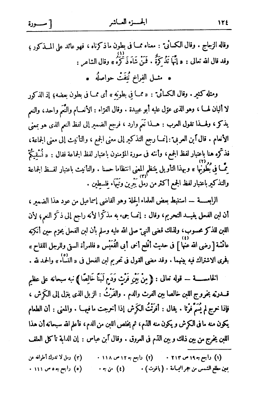 وَقَالَ الزَّجَّاجُ، وَقَالَ الْكِسَائِيُّ: مَعْنَاهُ مِمَّا فِي بُطُونِ مَا ذَكَرْنَاهُ، فَهُوَ عَائِدٌ عَلَى الْمَذْكُورِ، وَقَدْ قَالَ اللَّهُ تَعَالَى:" إِنَّها تَذْكِرَةٌ. فَمَنْ شاءَ ذَكَرَهُ «١» " وَقَالَ الشَّاعِرُ: