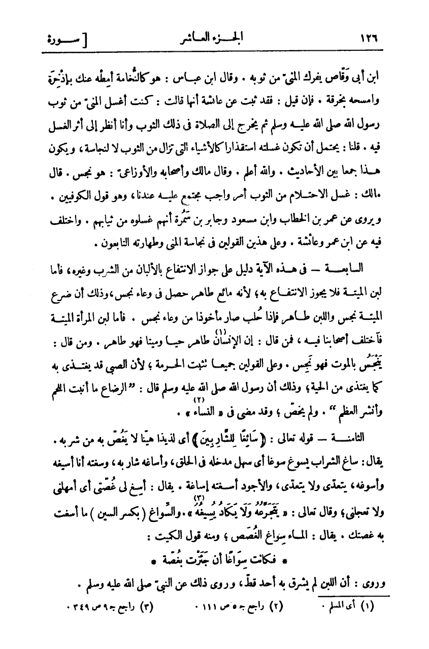 ابن أَبِي وَقَّاصٍ يَفْرُكُ الْمَنِيَّ مِنْ ثَوْبِهِ. وَقَالَ ابْنُ عَبَّاسٍ: هُوَ كَالنُّخَامَةِ أَمِطْهُ عَنْكَ بِإِذْخِرَةٍ وَامْسَحْهُ بِخِرْقَةٍ. فَإِنْ قِيلَ: فَقَدْ ثَبَتَ عَنْ عَائِشَةَ أَنَّهَا قَالَتْ: كُنْتُ أَغْسِلُ الْمَنِيَّ مِنْ ثَوْبِ رَسُولِ اللَّهِ صَلَّى اللَّهُ عَلَيْهِ وَسَلَّمَ ثُمَّ يَخْرُجُ إِلَى الصَّلَاةِ فِي ذَلِكَ الثَّوْبِ وَأَنَا أَنْظُرُ إِلَى أَثَرِ الْغَسْلِ فِيهِ. قُلْنَا: يَحْتَمِلُ أَنْ تَكُونَ غَسَلَتْهُ اسْتِقْذَارًا كَالْأَشْيَاءِ الَّتِي تزال من الثوب لا لنجاسة، وَيَكُونُ هَذَا جَمْعًا بَيْنَ الْأَحَادِيثِ. وَاللَّهُ أَعْلَمُ. وَقَالَ مَالِكٌ وَأَصْحَابُهُ وَالْأَوْزَاعِيُّ: هُوَ نَجِسٌ. قَالَ مَالِكٌ: غَسْلُ الِاحْتِلَامِ مِنَ الثَّوْبِ أَمْرٌ وَاجِبٌ مُجْتَمَعٌ عَلَيْهِ عِنْدَنَا، وَهُوَ قَوْلُ الْكُوفِيِّينَ. وَيُرْوَى عَنْ عُمَرَ بْنِ الْخَطَّابِ وَابْنِ مَسْعُودٍ وَجَابِرِ بْنِ سَمُرَةَ أَنَّهُمْ غَسَلُوهُ مِنْ ثِيَابِهِمْ. وَاخْتُلِفَ فِيهِ عَنِ ابْنِ عُمَرَ وَعَائِشَةَ. وَعَلَى هَذَيْنِ الْقَوْلَيْنِ فِي نَجَاسَةِ الْمَنِيِّ وَطَهَارَتِهِ التَّابِعُونَ. السَّابِعَةُ- فِي هَذِهِ الْآيَةِ دَلِيلٌ عَلَى جَوَازِ الِانْتِفَاعِ بِالْأَلْبَانِ مِنَ الشُّرْبِ وَغَيْرِهِ، فَأَمَّا لَبَنُ الْمَيْتَةِ فَلَا يَجُوزُ الِانْتِفَاعُ بِهِ، لِأَنَّهُ مَائِعٌ طَاهِرٌ حَصَلَ فِي وِعَاءٍ نَجِسٍ، وَذَلِكَ أَنَّ ضَرْعَ الْمَيْتَةِ نَجِسٌ وَاللَّبَنَ طَاهِرٌ فَإِذَا حُلِبَ صَارَ مَأْخُوذًا مِنْ وِعَاءٍ نَجِسٍ. فَأَمَّا لَبَنُ الْمَرْأَةِ الْمَيِّتَةِ فَاخْتَلَفَ أَصْحَابُنَا فِيهِ، فَمَنْ قَالَ: إِنَّ الْإِنْسَانَ «١» طَاهِرٌ حَيًّا وَمَيِّتًا فَهُوَ طَاهِرٌ. وَمَنْ قَالَ: يَنْجُسُ بِالْمَوْتِ فَهُوَ نَجِسٌ. وَعَلَى الْقَوْلَيْنِ جَمِيعًا تَثْبُتُ الْحُرْمَةُ، لِأَنَّ الصَّبِيَّ قَدْ يَغْتَذِي بِهِ كَمَا يَغْتَذِي مِنَ الْحَيَّةِ، وَذَلِكَ أَنَّ رَسُولَ اللَّهِ صَلَّى اللَّهُ عَلَيْهِ وَسَلَّمَ قال:" الرَّضَاعُ مَا أَنْبَتَ اللَّحْمَ وَأَنْشَزَ الْعَظْمَ". وَلَمْ يَخُصَّ، وَقَدْ مَضَى فِي:" النِّسَاءِ «٢» ". الثَّامِنَةُ- قَوْلُهُ تَعَالَى: (سائِغاً لِلشَّارِبِينَ) أَيْ لَذِيذًا هَيِّنًا لَا يُغَصُّ بِهِ مَنْ شَرِبَهُ. يُقَالُ: سَاغَ الشَّرَابُ يَسُوغُ سَوْغًا أَيْ سَهُلَ مَدْخَلُهُ فِي الْحَلْقِ، وَأَسَاغَهُ شَارَبُهُ، وَسُغْتُهُ أَنَا أُسِيغُهُ وَأَسُوغُهُ، يَتَعَدَّى، وَالْأَجْوَدُ أَسَغْتُهُ إِسَاغَةً. يُقَالُ: أَسِغْ لِي غُصَّتِي أَيْ أَمْهِلْنِي وَلَا تُعْجِلْنِي، وَقَالَ تَعَالَى:" يَتَجَرَّعُهُ وَلا يَكادُ يُسِيغُهُ «٣» ". وَالسِّوَاغُ (بِكَسْرِ السِّينِ) مَا أَسَغْتَ بِهِ غُصَّتَكَ. يُقَالُ: الْمَاءُ سِوَاغُ الْغُصَصِ، ومنه قول الكميت: