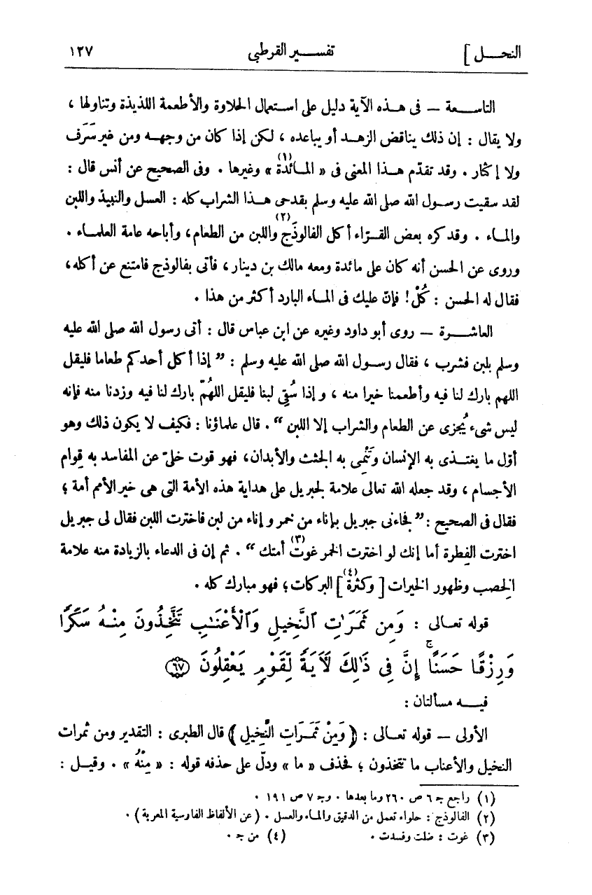 الْأُولَى- قَوْلُهُ تَعَالَى:" وَمِنْ ثَمَراتِ النَّخِيلِ" قَالَ الطَّبَرِيُّ: التَّقْدِيرُ وَمِنْ ثَمَرَاتِ النَّخِيلِ وَالْأَعْنَابِ مَا تَتَّخِذُونَ، فَحَذَفَ" مَا" وَدَلَّ عَلَى حَذْفِهِ قَوْلُهُ:" منه". وقيل: