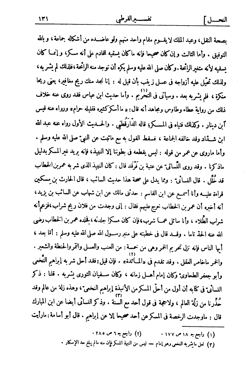 بِصِحَّةِ النَّقْلِ، وَعَبْدُ الْمَلِكِ لَا يَقُومُ مَقَامَ وَاحِدٍ مِنْهُمْ وَلَوْ عَاضَدَهُ مِنْ أَشْكَالِهِ جَمَاعَةٌ، وَبِاللَّهِ التَّوْفِيقُ. وَأَمَّا الثَّالِثُ وَإِنْ كَانَ صَحِيحًا فَإِنَّهُ مَا كَانَ يَسْقِيهِ لِلْخَادِمِ عَلَى أَنَّهُ مُسْكِرٌ، وَإِنَّمَا كَانَ يَسْقِيهِ لِأَنَّهُ مُتَغَيِّرُ الرَّائِحَةِ. وَكَانَ صَلَّى اللَّهُ عَلَيْهِ وَسَلَّمَ يَكْرَهُ أَنْ تُوجَدَ مِنْهُ الرَّائِحَةُ، فَلِذَلِكَ لَمْ يَشْرَبْهُ، وَلِذَلِكَ تحيل عليه أزواجه في عسل زبيب بِأَنْ قِيلَ لَهُ: إِنَّا نَجِدُ مِنْكَ رِيحَ مَغَافِيرَ، يَعْنِي رِيحًا مُنْكَرَةً، فَلَمْ يَشْرَبْهُ بَعْدُ. وَسَيَأْتِي فِي التَّحْرِيمِ «١». وَأَمَّا حَدِيثُ ابْنِ عَبَّاسٍ فَقَدْ رُوِيَ عَنْهُ خِلَافُ ذَلِكَ مِنْ رِوَايَةِ عَطَاءٍ وَطَاوُسٍ وَمُجَاهِدٍ أَنَّهُ قَالَ:" مَا أَسْكَرَ كَثِيرُهُ فَقَلِيلُهُ حَرَامٌ"، وَرَوَاهُ عَنْهُ قَيْسُ بْنُ دِينَارٍ. وَكَذَلِكَ فُتْيَاهُ فِي الْمُسْكِرِ، قَالَهُ الدَّارَقُطْنِيُّ. والحديث الأول رواه عنه عبد الله ابن شَدَّادٍ وَقَدْ خَالَفَهُ الْجَمَاعَةُ، فَسَقَطَ الْقَوْلُ بِهِ مَعَ مَا ثَبَتَ عَنِ النَّبِيِّ صَلَّى اللَّهُ عَلَيْهِ وَسَلَّمَ. وَأَمَّا مَا رُوِيَ عَنْ عُمَرَ مِنْ قَوْلِهِ: لَيْسَ يُقَطِّعُهُ فِي بُطُونِنَا إِلَّا النَّبِيذُ، فَإِنَّهُ يُرِيدُ غَيْرَ الْمُسْكِرِ بِدَلِيلِ مَا ذَكَرْنَا. وَقَدْ رَوَى النَّسَائِيُّ عَنْ عُتْبَةَ بْنِ فَرْقَدٍ قَالَ: كَانَ النَّبِيذُ الَّذِي شَرِبَهُ عُمَرُ بْنُ الْخَطَّابِ قَدْ خُلِّلَ. قَالَ النَّسَائِيُّ: وَمِمَّا يَدُلُّ عَلَى صِحَّةِ هَذَا حَدِيثُ السَّائِبِ، قَالَ الْحَارِثُ بْنُ مِسْكِينٍ قِرَاءَةً عَلَيْهِ وَأَنَا أَسْمَعُ عَنِ ابْنِ الْقَاسِمِ: حَدَّثَنِي مَالِكٌ عَنِ ابْنِ شِهَابٍ عَنِ السَّائِبِ بْنِ يَزِيدَ، أَنَّهُ أَخْبَرَهُ أَنَّ عُمَرَ بْنَ الْخَطَّابِ خَرَجَ عَلَيْهِمْ فَقَالَ: إِنِّي وَجَدْتُ مِنْ فُلَانٍ رِيحَ شَرَابٍ، فَزَعَمَ أَنَّهُ شَرَابَ الطِّلَاءِ، وَأَنَا سَائِلٌ عَمَّا شَرِبَ، فَإِنْ كَانَ مُسْكِرًا جَلَدْتُهُ، فَجَلَدَهُ عُمَرُ بْنُ الْخَطَّابِ رَضِيَ اللَّهُ عَنْهُ الْحَدَّ تَامًّا. وَقَدْ قَالَ فِي خُطْبَتِهِ عَلَى مِنْبَرِ رَسُولِ اللَّهِ صَلَّى اللَّهُ عَلَيْهِ وَسَلَّمَ: أَمَّا بَعْدُ، أَيُّهَا النَّاسُ فَإِنَّهُ نَزَلَ تَحْرِيمُ الْخَمْرِ وَهِيَ مِنْ خَمْسَةٍ: مِنَ الْعِنَبِ وَالْعَسَلِ وَالتَّمْرِ وَالْحِنْطَةِ وَالشَّعِيرِ. وَالْخَمْرُ مَا خَامَرَ الْعَقْلَ. وَقَدْ تَقَدَّمَ فِي" الْمَائِدَةِ «٢» ". فَإِنْ قِيلَ: فَقَدْ أَحَلَّ شُرْبَهُ إِبْرَاهِيمُ النَّخَعِيُّ وَأَبُو جَعْفَرٍ الطَّحَاوِيُّ وَكَانَ إِمَامَ أَهْلِ زَمَانِهِ، وَكَانَ سُفْيَانُ الثَّوْرِيُّ يَشْرَبُهُ. قُلْنَا: ذَكَرَ النَّسَائِيُّ فِي كِتَابِهِ أَنَّ أَوَّلَ مَنْ أَحَلَّ الْمُسْكِرَ مِنَ الْأَنْبِذَةِ إِبْرَاهِيمُ النَّخَعِيُّ، وَهَذِهِ زَلَّةٌ مِنْ عَالِمٍ وَقَدْ حَذَّرْنَا مِنْ زَلَّةِ الْعَالِمِ، وَلَا حُجَّةَ فِي قَوْلِ أَحَدٍ مَعَ السُّنَّةِ «٣». وَذَكَرَ النَّسَائِيُّ أَيْضًا عَنِ ابْنِ الْمُبَارَكِ قَالَ: مَا وَجَدْتُ الرُّخْصَةَ فِي الْمُسْكِرِ عَنْ أَحَدٍ صَحِيحًا إِلَّا عَنْ إِبْرَاهِيمَ. قَالَ أَبُو أُسَامَةَ: ما رأيت