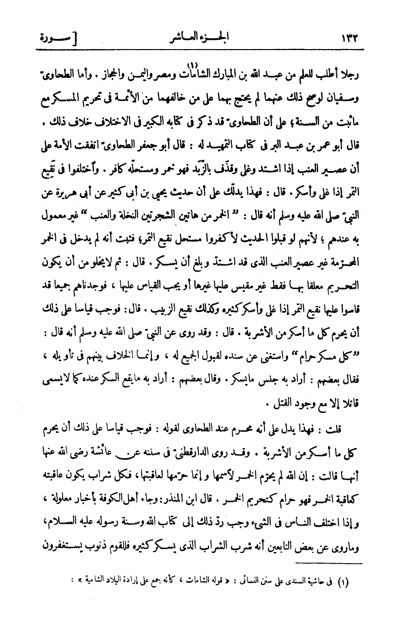 رَجُلًا أَطْلَبَ لِلْعِلْمِ مِنْ عَبْدِ اللَّهِ بْنِ الْمُبَارَكِ الشَّامَاتِ «١» وَمِصْرَ وَالْيَمَنَ وَالْحِجَازَ. وَأَمَّا الطَّحَاوِيُّ وَسُفْيَانُ لَوْ صَحَّ ذَلِكَ عَنْهُمَا لَمْ يُحْتَجَّ بِهِمَا عَلَى مَنْ خَالَفَهُمَا مِنَ الْأَئِمَّةِ فِي تَحْرِيمِ الْمُسْكِرِ مَعَ مَا ثَبَتَ مِنَ السُّنَّةِ، عَلَى أَنَّ الطَّحَاوِيَّ قَدْ ذَكَرَ فِي كِتَابِهِ الْكَبِيرِ فِي الِاخْتِلَافِ خِلَافَ ذَلِكَ. قَالَ أَبُو عُمَرَ بْنُ عَبْدِ الْبَرِّ فِي كِتَابِ التَّمْهِيدِ لَهُ: قَالَ أَبُو جَعْفَرٍ الطَّحَاوِيُّ اتَّفَقَتِ الْأُمَّةُ عَلَى أَنَّ عَصِيرَ الْعِنَبِ إِذَا اشْتَدَّ وَغَلَى وَقَذَفَ بِالزَّبَدَ فَهُوَ خَمْرٌ وَمُسْتَحِلُّهُ كَافِرٌ. وَاخْتَلَفُوا فِي نَقِيعِ التَّمْرِ إِذَا غَلَى وَأَسْكَرَ. قَالَ: فَهَذَا يَدُلُّكَ عَلَى أَنَّ حَدِيثَ يَحْيَى بْنِ أَبِي كَثِيرٍ عَنْ أَبِي هُرَيْرَةَ عَنِ النَّبِيِّ صَلَّى اللَّهُ عَلَيْهِ وَسَلَّمَ أَنَّهُ قَالَ:" الْخَمْرُ مِنْ هَاتَيْنِ الشَّجَرَتَيْنِ النَّخْلَةِ وَالْعِنَبِ" غَيْرُ مَعْمُولٍ بِهِ عِنْدَهُمْ، لِأَنَّهُمْ لَوْ قَبِلُوا الْحَدِيثَ لَأَكْفَرُوا مُسْتَحِلَّ نَقِيعِ التَّمْرِ، فَثَبَتَ أَنَّهُ لَمْ يَدْخُلْ فِي الْخَمْرِ الْمُحَرَّمَةِ غَيْرُ عَصِيرِ الْعِنَبِ الَّذِي قَدِ اشْتَدَّ وَبَلَغَ أَنْ يُسْكِرَ. قَالَ: ثُمَّ لَا يَخْلُوَ مِنْ أَنْ يَكُونَ التَّحْرِيمُ مُعَلَّقًا بِهَا فَقَطْ غَيْرَ مَقِيسٍ عَلَيْهَا غَيْرُهَا أَوْ يَجِبُ الْقِيَاسُ عَلَيْهَا، فَوَجَدْنَاهُمْ جَمِيعًا قَدْ قَاسُوا عَلَيْهَا نَقِيعَ التَّمْرِ إِذَا غَلَى وَأَسْكَرَ كَثِيرُهُ وَكَذَلِكَ نَقِيعُ الزَّبِيبِ. قَالَ: فَوَجَبَ قِيَاسًا عَلَى ذَلِكَ أَنْ يُحَرَّمَ كُلُّ مَا أَسْكَرَ مِنَ الْأَشْرِبَةِ. قَالَ: وَقَدْ رُوِيَ عَنِ النَّبِيِّ صَلَّى اللَّهُ عَلَيْهِ وَسَلَّمَ أَنَّهُ قَالَ:" كُلُّ مُسْكِرٍ حرام" واستغنى عن سنده لِقَبُولِ الْجَمِيعِ لَهُ، وَإِنَّمَا الْخِلَافُ بَيْنَهُمْ فِي تَأْوِيلِهِ، فَقَالَ بَعْضُهُمْ: أَرَادَ بِهِ جِنْسَ مَا يُسْكِرُ. وَقَالَ بَعْضُهُمْ: أَرَادَ بِهِ مَا يَقَعُ السُّكْرُ عِنْدَهُ كَمَا لَا يُسَمَّى قَاتِلًا إِلَّا مَعَ وُجُودِ الْقَتْلِ. قُلْتُ: فَهَذَا يَدُلُّ عَلَى أَنَّهُ مُحَرَّمٌ عِنْدَ الطَّحَاوِيِّ لِقَوْلِهِ، فَوَجَبَ قِيَاسًا عَلَى ذَلِكَ أَنْ يُحَرَّمَ كُلُّ مَا أَسْكَرَ مِنَ الْأَشْرِبَةِ. وَقَدْ رَوَى الدَّارَقُطْنِيُّ فِي سُنَنِهِ عَنْ عَائِشَةَ رَضِيَ اللَّهُ عَنْهَا أَنَّهَا قَالَتْ: إِنَّ اللَّهَ لَمْ يُحَرِّمِ الْخَمْرَ لِاسْمِهَا وَإِنَّمَا حَرَّمَهَا لِعَاقِبَتِهَا، فَكُلُّ شَرَابٍ يَكُونُ عَاقِبَتُهُ كَعَاقِبَةِ الْخَمْرِ فَهُوَ حَرَامٌ كَتَحْرِيمِ الْخَمْرِ. قَالَ ابْنُ الْمُنْذِرِ: وَجَاءَ أَهْلُ الْكُوفَةِ بِأَخْبَارٍ مَعْلُولَةٍ، وَإِذَا اخْتَلَفَ النَّاسُ فِي الشَّيْءِ وَجَبَ رَدُّ ذَلِكَ إِلَى كِتَابِ اللَّهِ وَسُنَّةِ رَسُولِهِ عَلَيْهِ السَّلَامُ، وَمَا رُوِيَ عَنْ بَعْضِ التَّابِعِينَ أَنَّهُ شَرِبَ الشَّرَابَ الَّذِي يُسْكِرُ كَثِيرُهُ فَلِلْقَوْمِ ذُنُوبٌ يَسْتَغْفِرُونَ