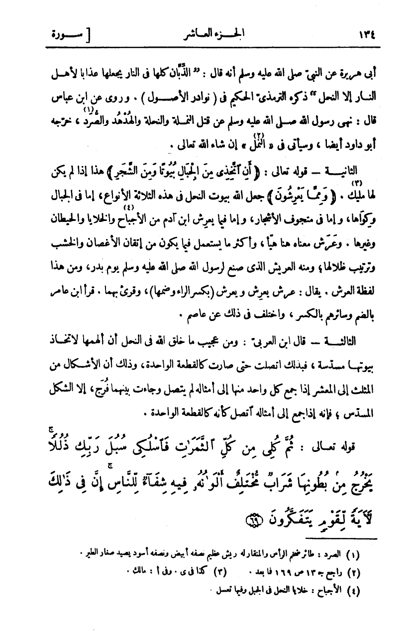 أَبِي هُرَيْرَةَ عَنِ النَّبِيِّ صَلَّى اللَّهُ عَلَيْهِ وَسَلَّمَ أَنَّهُ قَالَ:" الذِّبَّانُ كُلُّهَا فِي النَّارِ يَجْعَلُهَا عَذَابًا لِأَهْلِ النَّارِ إِلَّا النَّحْلَ" ذَكَرَهُ التِّرْمِذِيُّ الْحَكِيمُ فِي (نَوَادِرِ الْأُصُولِ). وَرُوِيَ عَنِ ابْنُ عَبَّاسٍ قَالَ: نَهَى رَسُولُ اللَّهِ صَلَّى اللَّهُ عَلَيْهِ وَسَلَّمَ عَنْ قَتْلِ النَّمْلَةِ وَالنَّحْلَةِ وَالْهُدْهُدِ وَالصُّرَدِ «١»، خَرَّجَهُ أَبُو دَاوُدَ أَيْضًا، وَسَيَأْتِي فِي" النَّمْلِ «٢» " إِنْ شَاءَ اللَّهُ تَعَالَى. الثَّانِيَةُ- قَوْلُهُ تَعَالَى: (أَنِ اتَّخِذِي مِنَ الْجِبالِ بُيُوتاً وَمِنَ الشَّجَرِ) هذا إذا لم يكن لها مليك «٣». (وَمِمَّا يَعْرِشُونَ) جعل اللَّهُ بُيُوتَ النَّحْلِ فِي هَذِهِ الثَّلَاثَةِ الْأَنْوَاعِ، إِمَّا فِي الْجِبَالِ وَكِوَاهَا، وَإِمَّا فِي مُتَجَوِّفِ الأشجار وام فِيمَا يَعْرِشُ ابْنُ آدَمَ مِنَ الْأَجْبَاحِ «٤» وَالْخَلَايَا وَالْحِيطَانِ وَغَيْرِهَا. وَعَرَشَ مَعْنَاهُ هُنَا هَيَّأَ، وَأَكْثَرُ مَا يُسْتَعْمَلُ فِيمَا يَكُونُ مِنْ إِتْقَانِ الْأَغْصَانِ وَالْخَشَبِ وَتَرْتِيبِ ظِلَالِهَا، وَمِنْهُ الْعَرِيشُ الَّذِي صُنِعَ لِرَسُولِ اللَّهِ صَلَّى اللَّهُ عَلَيْهِ وَسَلَّمَ يَوْمَ بَدْرٍ، وَمِنْ هَذَا لَفْظَةُ الْعَرْشِ. يُقَالُ: عَرَشَ يعرش ويعرش (بكسر الراء وضمها)، وقرى بِهِمَا. قَرَأَ ابْنُ عَامِرٍ بِالضَّمِّ وَسَائِرَهُمْ بِالْكَسْرِ، وَاخْتُلِفَ فِي ذَلِكَ عَنْ عَاصِمٍ. الثَّالِثَةُ- قَالَ ابْنُ الْعَرَبِيِّ: وَمِنْ عَجِيبِ مَا خَلَقَ اللَّهُ فِي النَّحْلِ أَنْ أَلْهَمَهَا لِاتِّخَاذِ بُيُوتِهَا مُسَدَّسَةً، فَبِذَلِكَ اتَّصَلَتْ حَتَّى صَارَتْ كَالْقِطْعَةِ الْوَاحِدَةِ، وَذَلِكَ أَنَّ الْأَشْكَالَ مِنَ الْمُثَلَّثِ إِلَى الْمُعَشَّرِ إِذَا جُمِعَ كُلُّ وَاحِدٍ مِنْهَا إِلَى أَمْثَالِهِ لَمْ يَتَّصِلْ وَجَاءَتْ بَيْنَهُمَا فُرَجٌ، إِلَّا الشَّكْلَ الْمُسَدَّسَ، فَإِنَّهُ إِذَا جُمِعَ إِلَى أَمْثَالِهِ اتَّصَلَ كَأَنَّهُ كالقطعة الواحدة.