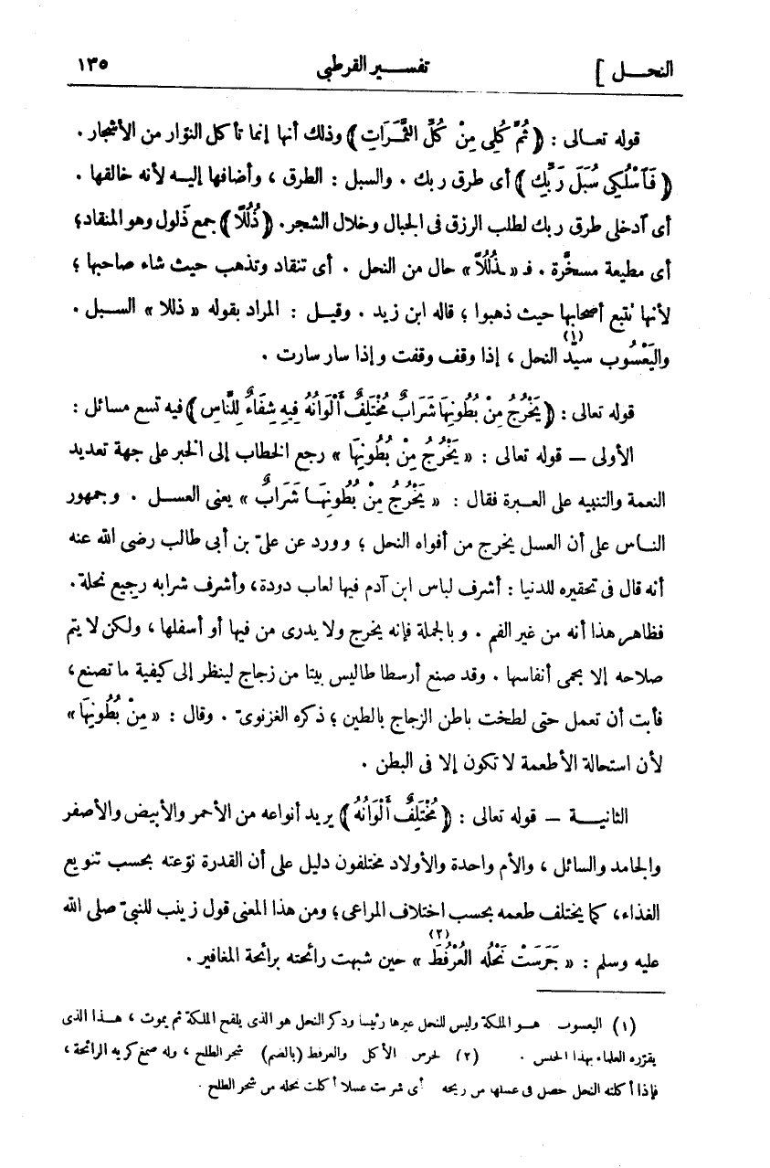 قَوْلُهُ تَعَالَى: (ثُمَّ كُلِي مِنْ كُلِّ الثَّمَراتِ) وَذَلِكَ أَنَّهَا إِنَّمَا تَأْكُلُ النُّوَّارَ مِنَ الْأَشْجَارِ. (فَاسْلُكِي سُبُلَ رَبِّكِ) أَيْ طُرُقَ رَبِّكِ. وَالسُّبُلُ: الطُّرُقُ، وَأَضَافَهَا إِلَيْهِ لِأَنَّهُ خَالِقُهَا. أَيِ ادْخُلِي طُرُقَ رَبِّكِ لِطَلَبِ الرِّزْقِ فِي الْجِبَالِ وَخِلَالِ الشَّجَرِ. (ذُلُلًا) جَمْعُ ذَلُولٍ وَهُوَ الْمُنْقَادُ، أَيْ مُطِيعَةً مُسَخَّرَةً. فَ" ذُلُلًا" حَالٌ مِنَ النَّحْلِ. أَيْ تَنْقَادُ وَتَذْهَبُ حَيْثُ شَاءَ صَاحِبُهَا، لِأَنَّهَا تَتْبَعُ أَصْحَابَهَا حَيْثُ ذَهَبُوا، قَالَهُ ابْنُ زَيْدٍ. وَقِيلَ: الْمُرَادُ بِقَوْلِهِ" ذُلُلًا" السُّبُلِ. وَالْيَعْسُوبُ سَيِّدُ «١» النَّحْلِ، إِذَا وَقَفَ وَقَفَتْ وَإِذَا سَارَ سَارَتْ. قَوْلُهُ تَعَالَى:" (يَخْرُجُ مِنْ بُطُونِها شَرابٌ مُخْتَلِفٌ أَلْوانُهُ فِيهِ شِفاءٌ لِلنَّاسِ) فِيهِ تِسْعُ مَسَائِلَ: الْأُولَى- قَوْلُهُ تَعَالَى: (يَخْرُجُ مِنْ بُطُونِها) رَجَعَ الْخِطَابُ إِلَى الْخَبَرِ عَلَى جِهَةِ تَعْدِيدِ النِّعْمَةِ وَالتَّنْبِيهِ عَلَى الْعِبْرَةِ فَقَالَ:" يَخْرُجُ مِنْ بُطُونِها شَرابٌ" يَعْنِي الْعَسَلَ. وَجُمْهُورُ النَّاسِ عَلَى أَنَّ الْعَسَلَ يَخْرُجُ مِنْ أَفْوَاهِ النَّحْلِ، وَوَرَدَ عَنْ عَلِيِّ بْنِ أَبِي طَالِبٍ رَضِيَ اللَّهُ عَنْهُ أَنَّهُ قَالَ فِي تَحْقِيرِهِ لِلدُّنْيَا: أَشْرَفُ لِبَاسِ ابْنِ آدَمَ فِيهَا لُعَابُ دُودَةٍ، وَأَشْرَفُ شَرَابِهِ رَجِيعُ نَحْلَةٍ. فَظَاهِرُ هَذَا أَنَّهُ مِنْ غَيْرِ الْفَمِ. وَبِالْجُمْلَةِ فَإِنَّهُ يَخْرُجُ وَلَا يُدْرَى مِنْ فِيهَا أَوْ أَسْفَلَهَا، وَلَكِنْ لَا يَتِمُّ صَلَاحُهُ إِلَّا بِحَمِيِّ أَنْفَاسِهَا. وَقَدْ صَنَعَ أَرِسْطَاطَالِيسُ بَيْتًا مِنْ زُجَاجٍ لِيَنْظُرَ إِلَى كَيْفِيَّةِ مَا تَصْنَعُ، فَأَبَتْ أَنْ تَعْمَلَ حَتَّى لَطَّخَتْ بَاطِنَ الزَّجَّاجِ بِالطِّينِ، ذَكَرَهُ الْغَزْنَوِيُّ. وَقَالَ:" مِنْ بُطُونِها" لِأَنَّ اسْتِحَالَةَ الْأَطْعِمَةِ لَا تَكُونُ إِلَّا فِي الْبَطْنِ. الثَّانِيَةُ- قَوْلُهُ تَعَالَى: (مُخْتَلِفٌ أَلْوانُهُ) يُرِيدُ أَنْوَاعَهُ مِنَ الْأَحْمَرِ وَالْأَبْيَضِ وَالْأَصْفَرِ وَالْجَامِدِ وَالسَّائِلِ، وَالْأُمَّ وَاحِدَةٌ وَالْأَوْلَادُ مُخْتَلِفُونَ دَلِيلٌ عَلَى أَنَّ الْقُدْرَةَ نَوَّعَتْهُ بِحَسَبِ تَنْوِيعِ الْغِذَاءِ، كَمَا يَخْتَلِفُ طَعْمُهُ بِحَسَبِ اخْتِلَافِ الْمَرَاعِي، وَمِنْ هَذَا الْمَعْنَى قَوْلُ زَيْنَبَ لِلنَّبِيِّ صَلَّى اللَّهُ عَلَيْهِ وَسَلَّمَ:" جَرَسَتْ نَحْلُهُ الْعُرْفُطَ «٢» " حِينَ شَبَّهَتْ رائحته برائحة المغافير.