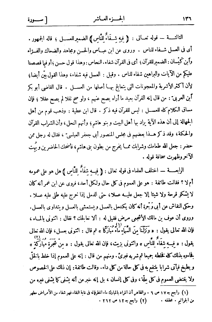 الثَّالِثَةُ- قَوْلُهُ تَعَالَى: (فِيهِ شِفاءٌ لِلنَّاسِ) الضَّمِيرُ لِلْعَسَلِ، قَالَ الْجُمْهُورُ. أَيْ فِي الْعَسَلِ شِفَاءٌ لِلنَّاسِ. وَرُوِيَ عَنِ ابْنِ عَبَّاسٍ وَالْحَسَنِ وَمُجَاهِدٍ وَالضَّحَّاكِ وَالْفَرَّاءِ وَابْنِ كَيْسَانَ: الضَّمِيرُ لِلْقُرْآنِ، أَيْ فِي الْقُرْآنِ شِفَاءٌ. النَّحَّاسُ: وَهَذَا قَوْلٌ حَسَنٌ، أَوْ فِيمَا قَصَصْنَا عَلَيْكُمْ مِنَ الْآيَاتِ وَالْبَرَاهِينِ شِفَاءٌ لِلنَّاسِ. وَقِيلَ: الْعَسَلُ فِيهِ شِفَاءٌ، وَهَذَا الْقَوْلُ بَيِّنٌ أَيْضًا، لِأَنَّ أَكْثَرَ الْأَشْرِبَةِ وَالْمَعْجُونَاتِ الَّتِي يُتَعَالَجُ بِهَا أَصْلُهَا مِنَ الْعَسَلِ. قَالَ القاضي أبو بكر ابن الْعَرَبِيِّ: مَنْ قَالَ إِنَّهُ الْقُرْآنُ بَعِيدٌ مَا أَرَاهُ يَصِحُّ عَنْهُمْ، وَلَوْ صَحَّ نَقْلًا لَمْ يَصِحَّ عَقْلًا، فَإِنَّ مَسَاقَ الْكَلَامِ كُلُّهُ لِلْعَسَلِ، لَيْسَ لِلْقُرْآنِ فِيهِ ذِكْرٌ. قَالَ ابْنُ عَطِيَّةَ: وَذَهَبَ قَوْمٌ مِنْ أَهْلِ الْجَهَالَةِ إِلَى أَنَّ هَذِهِ الْآيَةَ يُرَادُ بِهَا أَهْلُ الْبَيْتِ وَبَنُو هَاشِمٍ، وَأَنَّهُمُ النَّحْلُ، وَأَنَّ الشَّرَابَ الْقُرْآنُ وَالْحِكْمَةُ، وَقَدْ ذَكَرَ هَذَا بَعْضُهُمْ فِي مَجْلِسِ الْمَنْصُورِ أَبِي جَعْفَرٍ الْعَبَّاسِيِّ، فَقَالَ لَهُ رَجُلٌ مِمَّنْ حَضَرَ: جَعَلَ اللَّهُ طَعَامَكَ وَشَرَابَكَ مِمَّا يَخْرُجُ مِنْ بُطُونِ بَنِي هَاشِمٍ، فَأَضْحَكَ الْحَاضِرِينَ وَبُهِتَ الْآخَرُ وَظَهَرَتْ سَخَافَةُ قَوْلِهِ. الرَّابِعَةُ- اخْتَلَفَ الْعُلَمَاءُ فِي قَوْلِهِ تَعَالَى: فِيهِ شِفاءٌ لِلنَّاسِ هَلْ هُوَ عَلَى عُمُومِهِ أَمْ لَا، فَقَالَتْ طَائِفَةٌ: هُوَ عَلَى الْعُمُومِ فِي كُلِّ حَالٍ وَلِكُلِّ أَحَدٍ، فَرُوِيَ عَنِ ابْنِ عُمَرَ أَنَّهُ كَانَ لَا يَشْكُو قُرْحَةً وَلَا شَيْئًا إِلَّا جَعَلَ عَلَيْهِ عَسَلًا، حَتَّى الدُّمَّلَ إِذَا خَرَجَ عَلَيْهِ طَلَى عَلَيْهِ عَسَلًا. وَحَكَى النَّقَّاشُ عَنْ أَبِي وَجْرَةَ أَنَّهُ كَانَ يَكْتَحِلُ بِالْعَسَلِ وَيَسْتَمْشِي بِالْعَسَلِ وَيَتَدَاوَى بِالْعَسَلِ. وَرُوِيَ أَنَّ عَوْفَ بْنَ مَالِكٍ الْأَشْجَعِيَّ مَرِضَ فَقِيلَ لَهُ: أَلَا نُعَالِجُكَ؟ فَقَالَ: ائْتُونِي بِالْمَاءِ، فَإِنَّ اللَّهَ تَعَالَى يَقُولُ:" وَنَزَّلْنا مِنَ السَّماءِ مَاءً «١» مُبارَكاً" ثُمَّ قَالَ: ائْتُونِي بِعَسَلٍ، فَإِنَّ اللَّهَ تَعَالَى يَقُولُ:" فِيهِ شِفاءٌ لِلنَّاسِ" وَائْتُونِي بِزَيْتٍ، فَإِنَّ اللَّهَ تَعَالَى يَقُولُ:" مِنْ شَجَرَةٍ مُبارَكَةٍ «٢» " فَجَاءُوهُ بِذَلِكَ كُلِّهِ فَخَلَطَهُ جَمِيعًا ثُمَّ شَرِبَهُ فَبَرِئَ. وَمِنْهُمْ مَنْ قَالَ: إِنَّهُ عَلَى الْعُمُومِ إِذَا خُلِطَ بِالْخَلِّ وَيُطْبَخُ فَيَأْتِي شَرَابًا يُنْتَفَعُ بِهِ فِي كُلِّ حَالَةٍ مِنْ كُلِّ دَاءٍ. وَقَالَتْ طَائِفَةٌ: إِنَّ ذَلِكَ عَلَى الْخُصُوصِ وَلَا يَقْتَضِي الْعُمُومَ فِي كُلِّ عِلَّةٍ وَفِي كُلِّ إِنْسَانٍ، بَلْ إِنَّهُ خَبَرٌ عَنْ أَنَّهُ يَشْفِي كَمَا يَشْفِي غَيْرُهُ مِنَ