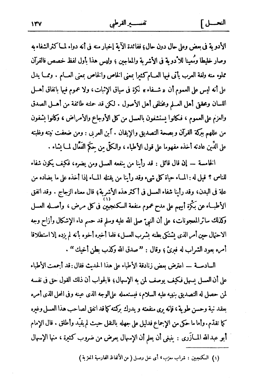 الْأَدْوِيَةِ فِي بَعْضٍ وَعَلَى حَالٍ دُونَ حَالٍ، فَفَائِدَةُ الْآيَةِ إِخْبَارٌ مِنْهُ فِي أَنَّهُ دَوَاءٌ لَمَّا كَثُرَ الشِّفَاءُ بِهِ وَصَارَ خَلِيطًا وَمُعِينًا لِلْأَدْوِيَةِ فِي الْأَشْرِبَةِ وَالْمَعَاجِينِ، وَلَيْسَ هَذَا بِأَوَّلِ لَفْظٍ خُصِّصَ فَالْقُرْآنُ مَمْلُوءٌ مِنْهُ وَلُغَةُ الْعَرَبِ يَأْتِي فِيهَا الْعَامُّ كَثِيرًا بِمَعْنَى الْخَاصِّ وَالْخَاصُّ بِمَعْنَى الْعَامِّ. وَمِمَّا يَدُلُّ عَلَى أَنَّهُ لَيْسَ عَلَى الْعُمُومِ أَنَّ" شِفاءٌ" نَكِرَةٌ فِي سِيَاقِ الْإِثْبَاتِ، وَلَا عُمُومَ فِيهَا بِاتِّفَاقِ أَهْلِ اللِّسَانِ وَمُحَقِّقِي أَهْلِ الْعِلْمِ وَمُخْتَلِفِي أَهْلِ الْأُصُولِ. لَكِنْ قَدْ حَمَلَتْهُ طَائِفَةٌ مِنْ أَهْلِ الصِّدْقِ وَالْعَزْمِ عَلَى الْعُمُومِ. فَكَانُوا يَسْتَشْفُونَ بِالْعَسَلِ مِنْ كُلِّ الْأَوْجَاعِ وَالْأَمْرَاضِ، وَكَانُوا يُشْفَوْنَ مِنْ عِلَلِهِمْ بِبَرَكَةِ الْقُرْآنِ وَبِصِحَّةِ التَّصْدِيقِ وَالْإِيقَانِ. ابْنُ الْعَرَبِيِّ: وَمَنْ ضَعُفَتْ نِيَّتُهُ وَغَلَبَتْهُ عَلَى الدِّينِ عَادَتُهُ أَخَذَهُ مَفْهُومًا عَلَى قَوْلِ الْأَطِبَّاءِ، وَالْكُلُّ مِنْ حِكَمِ الْفَعَّالِ لِمَا يَشَاءُ. الْخَامِسَةُ- إِنْ قَالَ قَائِلٌ: قَدْ رَأَيْنَا مَنْ يَنْفَعُهُ الْعَسَلُ وَمَنْ يَضُرُّهُ، فَكَيْفَ يَكُونُ شِفَاءً لِلنَّاسِ؟ قِيلَ لَهُ: الْمَاءُ حياة كل شي وَقَدْ رَأَيْنَا مَنْ يَقْتُلُهُ الْمَاءُ إِذَا أَخَذَهُ عَلَى مَا يُضَادُّهُ مِنْ عِلَّةٍ فِي الْبَدَنِ، وَقَدْ رَأَيْنَا شِفَاءَ الْعَسَلِ فِي أَكْثَرِ هَذِهِ الْأَشْرِبَةِ، قَالَ مَعْنَاهُ الزَّجَّاجُ. وَقَدِ اتَّفَقَ الْأَطِبَّاءُ عَنْ بَكْرَةِ أَبِيهِمْ عَلَى مَدْحِ عُمُومِ مَنْفَعَةِ السَّكَنْجَبِينِ «١» فِي كُلِّ مَرَضٍ، وَأَصْلُهُ الْعَسَلُ وَكَذَلِكَ سَائِرُ الْمَعْجُونَاتِ، عَلَى أَنَّ النَّبِيَّ صَلَّى اللَّهُ عَلَيْهِ وَسَلَّمَ قَدْ حَسَمَ دَاءَ الْإِشْكَالِ وَأَزَاحَ وَجْهَ الِاحْتِمَالِ حِينَ أَمَرَ الَّذِي يَشْتَكِي بَطْنَهُ بِشُرْبِ الْعَسَلِ، فَلَمَّا أَخْبَرَهُ أَخُوهُ بِأَنَّهُ لَمْ يَزِدْهُ إِلَّا اسْتِطْلَاقًا أَمَرَهُ بِعَوْدِ الشَّرَابِ لَهُ فَبَرِئَ، وَقَالَ:" صَدَقَ اللَّهُ وَكَذَبَ بَطْنُ أَخِيكَ". السَّادِسَةُ- اعْتَرَضَ بَعْضُ زَنَادِقَةِ الْأَطِبَّاءِ عَلَى هَذَا الْحَدِيثِ فَقَالَ: قَدْ أَجْمَعَتِ الْأَطِبَّاءُ عَلَى أَنَّ الْعَسَلَ يُسْهِلُ فَكَيْفَ يُوصَفُ لِمَنْ بِهِ الْإِسْهَالُ، فَالْجَوَابُ أَنَّ ذَلِكَ الْقَوْلَ حَقٌّ فِي نَفْسِهِ لِمَنْ حَصَلَ لَهُ التَّصْدِيقُ بِنَبِيِّهِ عَلَيْهِ السَّلَامُ، فَيَسْتَعْمِلُهُ عَلَى الْوَجْهِ الَّذِي عَيَّنَهُ وَفِي الْمَحَلِّ الَّذِي أَمَرَهُ بِعَقْدِ نِيَّةٍ وَحُسْنِ طَوِيَّةٍ، فَإِنَّهُ يَرَى مَنْفَعَتَهُ وَيُدْرِكُ بَرَكَتَهُ، كَمَا قَدِ اتَّفَقَ لِصَاحِبِ هَذَا الْعَسَلِ وَغَيْرِهِ كَمَا تَقَدَّمَ. وَأَمَّا مَا حُكِيَ مِنَ الْإِجْمَاعِ فَدَلِيلٌ عَلَى جَهْلِهِ بِالنَّقْلِ حَيْثُ لَمْ يُقَيِّدْ وَأَطْلَقَ. قَالَ الْإِمَامُ أَبُو عَبْدِ اللَّهِ الْمَازِرِيُّ: يَنْبَغِي أَنْ يَعْلَمَ أَنَّ الْإِسْهَالَ يَعْرِضُ مِنْ ضُرُوبٍ كَثِيرَةٍ، مِنْهَا الإسهال