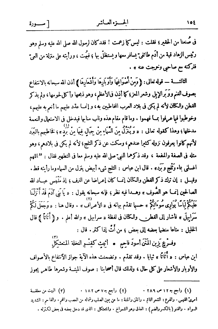 فِي صُنْعِنَا مِنَ الْحَقِيرِ، فَقُلْتُ: لَيْسَ كَمَا زَعَمْتَ فَقَدْ كَانَ لِرَسُولِ اللَّهِ صَلَّى اللَّهُ عَلَيْهِ وَسَلَّمَ وَهُوَ رَئِيسُ الزُّهَّادِ قُبَّةٌ مِنْ أَدَمٍ طَائِفِيٍّ يُسَافِرُ مَعَهَا وَيَسْتَظِلُّ بِهَا، فَبُهِتَ، وَرَأَيْتُهُ عَلَى مَنْزِلَةٍ مِنَ الْعِيِّ فَتَرَكْتُهُ مَعَ صاحبي وخرجت عنه. الثالثة-: (. مِنْ أَصْوافِها وَأَوْبارِها وَأَشْعارِها) أَذِنَ اللَّهُ سُبْحَانَهُ بِالِانْتِفَاعِ بِصُوفِ الْغَنَمِ وَوَبَرِ الْإِبِلِ وَشَعْرِ الْمَعْزِ، كَمَا أَذِنَ فِي الْأَعْظَمِ، وَهُوَ ذَبْحُهَا وَأَكْلُ لُحُومِهَا، وَلَمْ يَذْكُرِ الْقُطْنَ وَالْكَتَّانَ لِأَنَّهُ لَمْ يَكُنْ فِي بِلَادِ الْعَرَبِ الْمُخَاطَبِينَ بِهِ، وَإِنَّمَا عَدَّدَ عَلَيْهِمْ مَا أَنْعَمَ بِهِ عَلَيْهِمْ، وَخُوطِبُوا فِيمَا عَرَفُوا بِمَا فَهِمُوا. وَمَا قَامَ مَقَامَ هَذِهِ وَنَابَ مَنَابَهَا فَيَدْخُلُ فِي الِاسْتِعْمَالِ وَالنِّعْمَةِ مَدْخَلَهَا، وَهَذَا كَقَوْلِهِ تَعَالَى:" وَيُنَزِّلُ مِنَ السَّماءِ مِنْ جِبالٍ فِيها مِنْ بَرَدٍ «١» " فَخَاطَبَهُمْ بِالْبَرَدِ لِأَنَّهُمْ كَانُوا يَعْرِفُونَ نُزُولَهُ كَثِيرًا عِنْدَهُمْ، وَسَكَتَ عَنْ ذِكْرِ الثَّلْجِ، لِأَنَّهُ لَمْ يَكُنْ فِي بِلَادِهِمْ، وَهُوَ مِثْلُهُ فِي الصِّفَةِ وَالْمَنْفَعَةِ، وَقَدْ ذَكَرَهُمَا النَّبِيُّ صَلَّى اللَّهُ عَلَيْهِ وَسَلَّمَ مَعًا فِي التَّطْهِيرِ فَقَالَ:" اللَّهُمَّ اغْسِلْنِي بِمَاءٍ وَثَلْجٍ وَبَرَدٍ". قال ابن عباس: الثلج شي أَبْيَضُ يَنْزِلُ مِنَ السَّمَاءِ وَمَا رَأَيْتُهُ قَطُّ. وَقِيلَ: إِنَّ تَرْكَ ذِكْرِ الْقُطْنِ وَالْكَتَّانِ إِنَّمَا كَانَ إِعْرَاضًا عَنِ التَّرَفِ، إِذْ مَلْبَسُ عِبَادِ اللَّهِ الصَّالِحِينَ إِنَّمَا هُوَ الصُّوفُ" وَهَذَا فِيهِ نظر، فإنه سبحانه يقول:" يا بَنِي آدَمَ قَدْ أَنْزَلْنا عَلَيْكُمْ لِباساً يُوارِي سَوْآتِكُمْ" حَسْبَمَا تَقَدَّمَ بَيَانُهُ فِي" الْأَعْرَافِ «٢» " وَقَالَ هُنَا:" وَجَعَلَ لَكُمْ سَرابِيلَ" فَأَشَارَ إِلَى الْقُطْنِ وَالْكَتَّانِ فِي لَفْظَةِ" سَرابِيلَ" وَاللَّهُ أَعْلَمُ. وَ" أَثاثاً