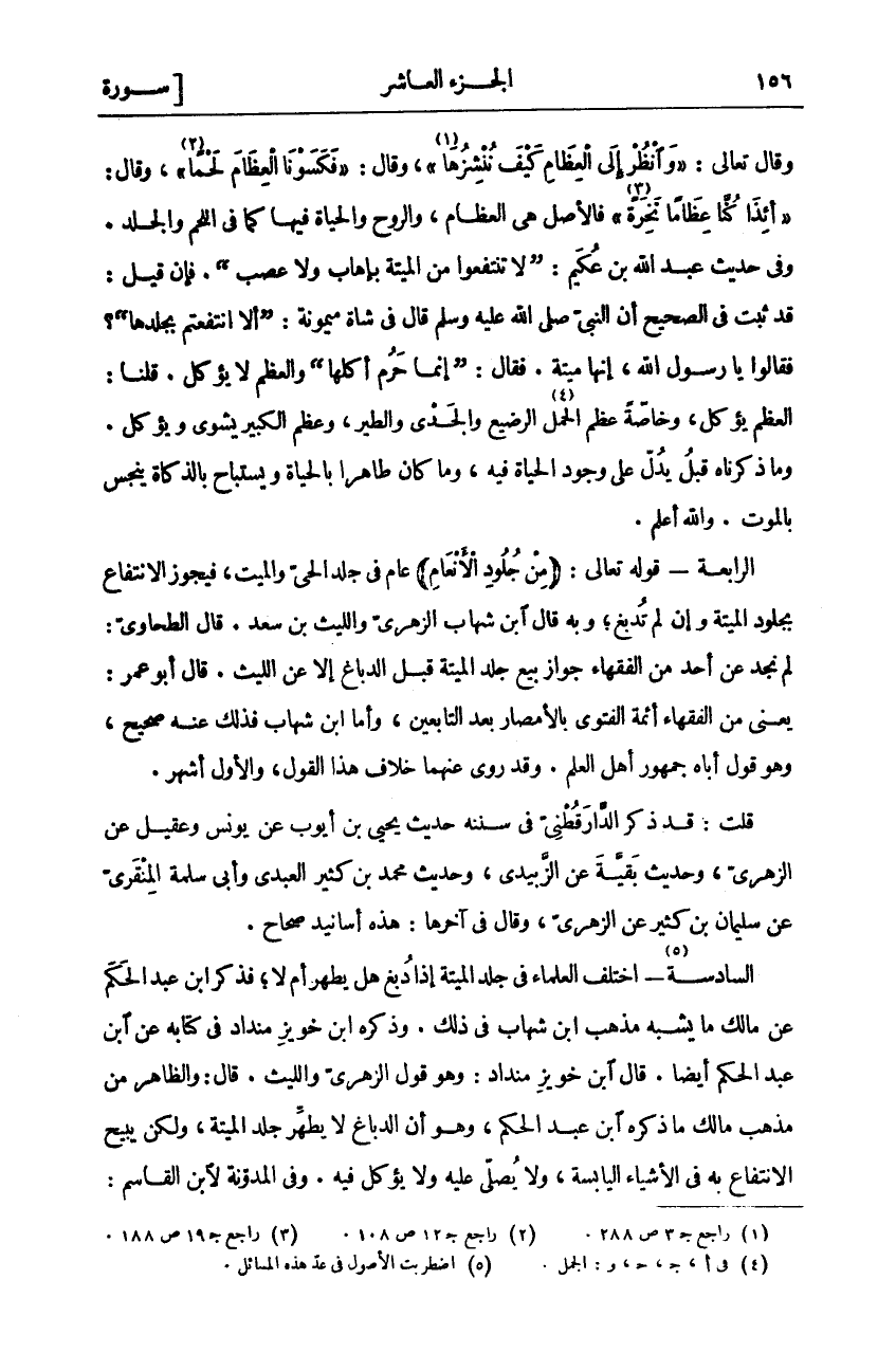 وَقَالَ تَعَالَى:" وَانْظُرْ إِلَى الْعِظامِ كَيْفَ نُنْشِزُها «١» "، وقال:" فَكَسَوْنَا الْعِظامَ لَحْماً «٢» "، وقال:" أَإِذا كُنَّا عِظاماً نَخِرَةً «٣» " فَالْأَصْلُ هِيَ الْعِظَامُ، وَالرُّوحُ وَالْحَيَاةُ فِيهَا كَمَا فِي اللَّحْمِ وَالْجِلْدِ. وَفِي حَدِيثِ عَبْدِ اللَّهِ بْنِ عُكَيْمٌ:" لَا تَنْتَفِعُوا مِنَ الْمَيْتَةِ بِإِهَابٍ وَلَا عَصَبٍ". فَإِنْ قِيلَ: قَدْ ثَبَتَ فِي الصَّحِيحِ أَنَّ النَّبِيَّ صَلَّى اله عَلَيْهِ وَسَلَّمَ قَالَ فِي شَاةِ مَيْمُونَةَ:" أَلَا انْتَفَعْتُمْ بِجِلْدِهَا"؟ فَقَالُوا: يَا رَسُولَ اللَّهِ، إِنَّهَا مَيْتَةٌ. فَقَالَ:" إِنَّمَا حَرُمَ أَكْلُهَا" وَالْعَظْمُ لَا يؤكل. قلنا: العظم يؤكل، وخاصة عظم الحمل «٤» الرَّضِيعِ وَالْجَدْيِ وَالطَّيْرِ، وَعَظْمُ الْكَبِيرِ يُشْوَى وَيُؤْكَلُ. وَمَا ذَكَرْنَاهُ قَبْلُ يَدُلُّ عَلَى وُجُودِ الْحَيَاةِ فِيهِ، وَمَا كَانَ طَاهِرًا بِالْحَيَاةِ وَيُسْتَبَاحُ بِالذَّكَاةِ يَنْجُسُ بِالْمَوْتِ. وَاللَّهُ أَعْلَمُ. الرَّابِعَةُ- قَوْلُهُ تَعَالَى- (مِنْ جُلُودِ الْأَنْعامِ) عَامٌّ فِي جِلْدِ الْحَيِّ وَالْمَيِّتِ، فَيَجُوزُ الِانْتِفَاعُ بِجُلُودِ الْمَيْتَةِ وَإِنْ لَمْ تُدْبَغْ، وَبِهِ قَالَ ابْنُ شِهَابٍ الزُّهْرِيُّ وَاللَّيْثُ بْنُ سَعْدٍ. قَالَ الطَّحَاوِيُّ: لَمْ نَجِدْ عَنْ أَحَدٍ مِنَ الْفُقَهَاءِ جَوَازُ بَيْعِ جِلْدِ الْمَيْتَةِ قَبْلَ الدِّبَاغِ إِلَّا عَنِ اللَّيْثِ. قَالَ أَبُو عُمَرَ: يَعْنِي مِنَ الْفُقَهَاءِ أَئِمَّةَ الْفَتْوَى بِالْأَمْصَارِ بَعْدَ التَّابِعِينَ، وَأَمَّا ابْنُ شِهَابٍ فَذَلِكَ عَنْهُ صَحِيحٌ، وَهُوَ قَوْلٌ أَبَاهُ جُمْهُورُ أَهْلِ الْعِلْمِ. وَقَدْ رُوِيَ عَنْهُمَا خِلَافُ هَذَا الْقَوْلِ، وَالْأَوَّلُ أَشْهَرُ. قُلْتُ: قَدْ ذَكَرَ الدَّارَقُطْنِيُّ فِي سُنَنِهِ حَدِيثَ يَحْيَى بْنِ أَيُّوبَ عَنْ يُونُسَ وَعُقَيْلٍ عَنِ الزُّهْرِيِّ، وَحَدِيثَ بَقِيَّةَ عَنِ الزُّبَيْدِيِّ، وَحَدِيثَ مُحَمَّدِ بْنِ كَثِيرٍ الْعَبْدِيِّ وَأَبِي سَلَمَةَ الْمِنْقَرِيِّ عَنْ سُلَيْمَانَ بْنِ كَثِيرٍ عَنِ الزُّهْرِيِّ، وَقَالَ فِي آخِرِهَا: هَذِهِ أَسَانِيدُ صِحَاحٌ. السَّادِسَةُ «٥» - اخْتَلَفَ الْعُلَمَاءُ فِي جِلْدِ الْمَيْتَةِ إِذَا دُبِغَ هَلْ يَطْهُرُ أَمْ لَا، فَذَكَرَ ابْنُ عَبْدِ الْحَكَمِ عَنْ مَالِكٍ مَا يُشْبِهُ مَذْهَبَ ابْنِ شِهَابٍ فِي ذَلِكَ. وَذَكَرَهُ ابْنُ خُوَيْزِ مَنْدَادَ فِي كِتَابِهِ عَنِ ابْنِ عَبْدِ الْحَكَمِ أَيْضًا. قَالَ ابْنُ خُوَيْزِ مَنْدَادَ: وَهُوَ قَوْلُ الزُّهْرِيِّ وَاللَّيْثِ. قَالَ: وَالظَّاهِرُ مِنْ مَذْهَبِ مَالِكٍ مَا ذَكَرَهُ ابْنُ عَبْدِ الْحَكَمِ، وَهُوَ أَنَّ الدِّبَاغَ لَا يُطَهِّرُ جِلْدَ الْمَيْتَةِ، وَلَكِنْ يُبِيحُ الِانْتِفَاعَ بِهِ فِي الْأَشْيَاءِ الْيَابِسَةِ، وَلَا يُصَلَّى عَلَيْهِ وَلَا يؤكل فيه. وفى المدونة لابن القاسم: