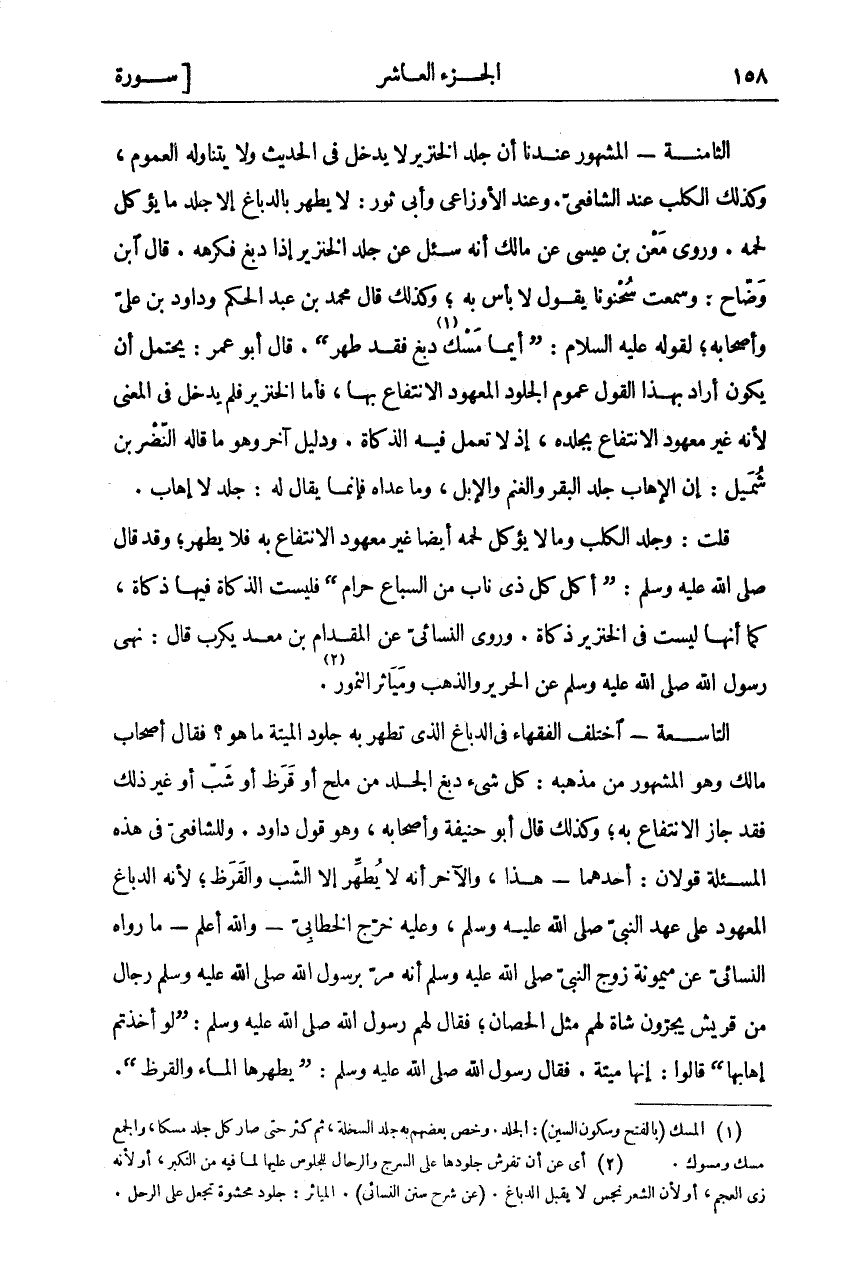 الثَّامِنَةُ- الْمَشْهُورُ عِنْدَنَا أَنَّ جِلْدَ الْخِنْزِيرِ لَا يَدْخُلُ فِي الْحَدِيثِ وَلَا يَتَنَاوَلُهُ الْعُمُومُ، وَكَذَلِكَ الْكَلْبُ عِنْدَ الشَّافِعِيِّ. وَعِنْدَ الْأَوْزَاعِيِّ وَأَبِي ثَوْرٍ: لَا يَطْهُرُ بِالدِّبَاغِ إِلَّا جِلْدُ مَا يُؤْكَلُ لَحْمُهُ. وَرَوَى مَعْنُ بْنُ عِيسَى عَنْ مَالِكٍ أَنَّهُ سُئِلَ عَنْ جِلْدِ الْخِنْزِيرِ إِذَا دُبِغَ فَكَرِهَهُ. قَالَ ابْنُ وَضَّاحٍ: وَسَمِعْتُ سُحْنُونًا يَقُولُ لَا بَأْسَ بِهِ، وَكَذَلِكَ قَالَ مُحَمَّدُ بْنُ عَبْدِ الْحَكَمِ وَدَاوُدُ بْنُ عَلِيٍّ وَأَصْحَابُهُ، لِقَوْلِهِ عَلَيْهِ السَّلَامُ:" أَيُّمَا مَسْكٍ «١» دُبِغَ فَقَدْ طَهُرَ". قَالَ أَبُو عُمَرَ: يَحْتَمِلُ أَنْ يَكُونَ أَرَادَ بِهَذَا الْقَوْلِ عُمُومَ الْجُلُودِ الْمَعْهُودِ الِانْتِفَاعُ بِهَا، فَأَمَّا الْخِنْزِيرُ فَلَمْ يَدْخُلْ فِي الْمَعْنَى لِأَنَّهُ غَيْرُ مَعْهُودٍ الِانْتِفَاعُ بِجِلْدِهِ، إِذْ لَا تَعْمَلُ فِيهِ الذَّكَاةُ. وَدَلِيلٌ آخَرُ وَهُوَ مَا قَالَهُ النَّضْرُ بْنُ شُمَيْلٍ: إِنَّ الْإِهَابَ جِلْدُ الْبَقَرِ وَالْغَنَمِ وَالْإِبِلِ، وَمَا عَدَاهُ فَإِنَّمَا يُقَالُ لَهُ: جِلْدٌ لَا إِهَابٌ. قُلْتُ: وَجِلْدُ الْكَلْبِ وَمَا لَا يُؤْكَلُ لَحْمُهُ أَيْضًا غَيْرُ مَعْهُودٍ الِانْتِفَاعُ بِهِ فَلَا يَطْهُرُ، وَقَدْ قَالَ صَلَّى اللَّهُ عَلَيْهِ وَسَلَّمَ:" أَكْلُ كُلِّ ذِي نَابٍ مِنَ السِّبَاعِ حَرَامٌ" فَلَيْسَتِ الذَّكَاةُ فِيهَا ذَكَاةٌ، كَمَا أَنَّهَا لَيْسَتْ فِي الْخِنْزِيرِ ذَكَاةٌ. وَرَوَى النَّسَائِيُّ عن المقدام بن معد يكرب قَالَ:" نَهَى رَسُولُ اللَّهِ صَلَّى اللَّهُ عَلَيْهِ وَسَلَّمَ عَنْ الْحَرِيرِ وَالذَّهَبِ وَمَيَاثِرِ النُّمُورِ «٢». التَّاسِعَةُ- اخْتَلَفَ الْفُقَهَاءُ فِي الدِّبَاغِ الَّتِي تَطْهُرُ بِهِ جُلُودُ الْمَيْتَةِ مَا هُوَ؟ فَقَالَ أَصْحَابُ مَالِكٍ وهو المشهور من مذهبه: كل شي دَبَغَ الْجِلْدَ مِنْ مِلْحٍ أَوْ قَرَظٍ أَوْ شَبٍّ أَوْ غَيْرِ ذَلِكَ فَقَدْ جَازَ الِانْتِفَاعُ بِهِ. وَكَذَلِكَ قَالَ أَبُو حَنِيفَةَ وَأَصْحَابُهُ، وَهُوَ قَوْلُ دَاوُدَ. وَلِلشَّافِعِيِّ فِي هَذِهِ الْمَسْأَلَةِ قَوْلَانِ: أَحَدُهُمَا- هَذَا، وَالْآخَرُ أَنَّهُ لَا يُطَهِّرُ إِلَّا الشَّبُّ وَالْقَرَظُ، لِأَنَّهُ الدِّبَاغُ الْمَعْهُودُ عَلَى عَهْدِ النبي صلى اله عَلَيْهِ وَسَلَّمَ، وَعَلَيْهِ خَرَّجَ الْخَطَّابِيُّ- وَاللَّهُ أَعْلَمُ- مَا رَوَاهُ النَّسَائِيُّ عَنْ مَيْمُونَةَ زَوْجِ النَّبِيِّ صَلَّى اللَّهُ عَلَيْهِ وَسَلَّمَ أَنَّهُ مَرَّ بِرَسُولِ اللَّهِ صَلَّى اللَّهُ عَلَيْهِ وَسَلَّمَ رِجَالٌ مِنْ قُرَيْشٍ يَجُرُّونَ شَاةً لَهُمْ مِثْلَ الْحِصَانِ، فَقَالَ لَهُمْ رَسُولُ اللَّهِ صَلَّى اللَّهُ عَلَيْهِ وَسَلَّمَ:" لَوْ أَخَذْتُمْ إِهَابَهَا" قَالُوا. إِنَّهَا مَيْتَةٌ، فَقَالَ رَسُولُ اللَّهِ صَلَّى اللَّهُ عَلَيْهِ وَسَلَّمَ:" يُطَهِّرُهَا الماء والقرظ".