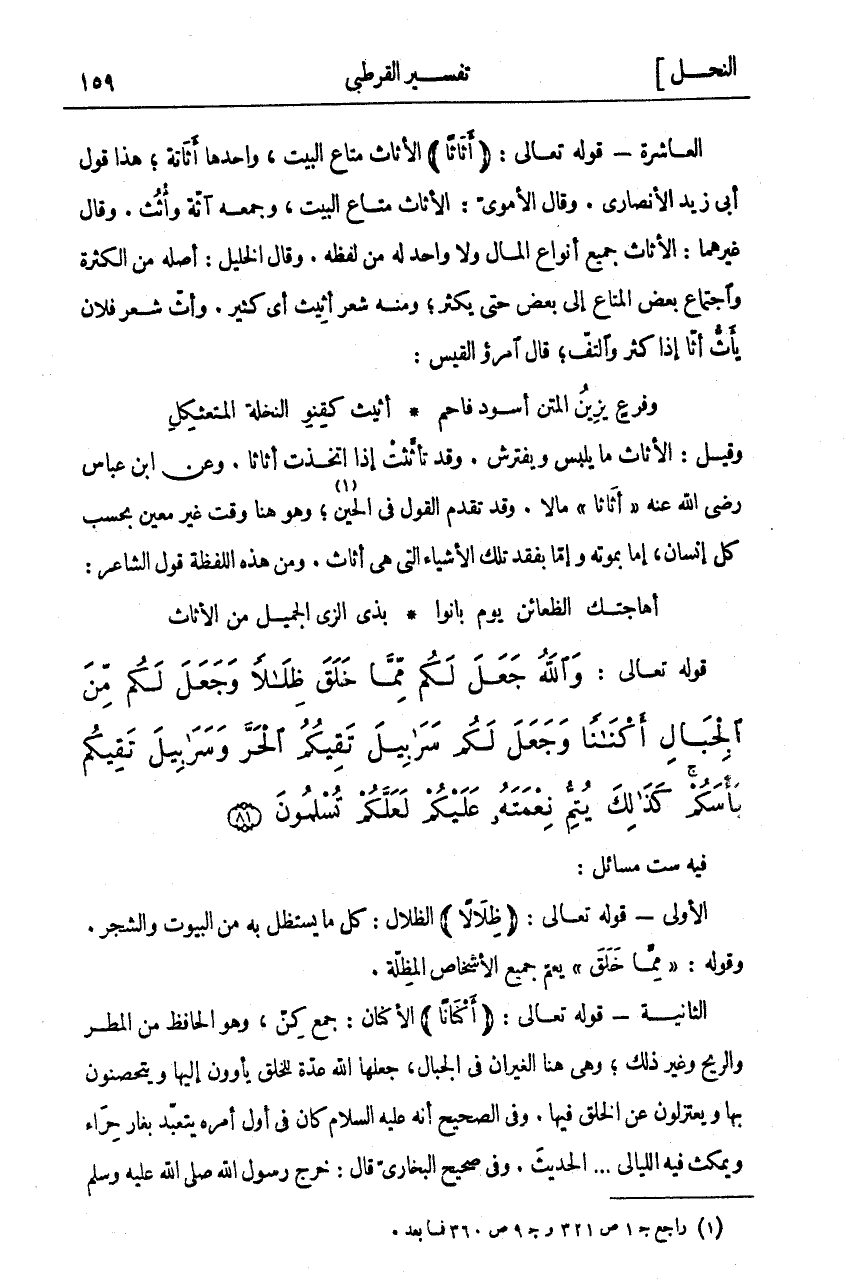 فِيهِ سِتُّ مَسَائِلَ: الْأُولَى- قَوْلُهُ تَعَالَى: (ظِلالًا) الظِّلَالُ: كُلُّ مَا يُسْتَظَلُّ بِهِ مِنَ الْبُيُوتِ وَالشَّجَرِ. وَقَوْلُهُ" مِمَّا خَلَقَ" يَعُمُّ جَمِيعَ الْأَشْخَاصِ الْمُظِلَّةِ. الثَّانِيَةُ- قَوْلُهُ تعالى: (أَكْناناً) الأكنان: جمح كِنٍّ، وَهُوَ الْحَافِظُ مِنَ الْمَطَرِ وَالرِّيحِ وَغَيْرِ ذَلِكَ، وَهِيَ هُنَا الْغِيرَانُ فِي الْجِبَالِ، جَعَلَهَا الله عدة للخلق يأوون إليها ويتحصنون بها ويعتزلون عَنِ الْخَلْقِ فِيهَا. وَفِي الصَّحِيحِ أَنَّهُ عَلَيْهِ السَّلَامُ كَانَ فِي أَوَّلِ أَمْرِهِ يَتَعَبَّدُ بِغَارِ حِرَاءٍ وَيَمْكُثُ فِيهِ اللَّيَالِي .. الْحَدِيثَ، وَفِي صَحِيحِ الْبُخَارِيِّ قَالَ: خَرَجَ رَسُولُ اللَّهِ صَلَّى اللَّهُ عَلَيْهِ وَسَلَّمَ