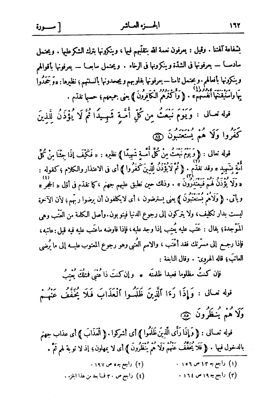 قَوْلُهُ تَعَالَى: (وَيَوْمَ نَبْعَثُ مِنْ كُلِّ أُمَّةٍ شَهِيداً) نَظِيرُهُ:" فَكَيْفَ إِذا جِئْنا مِنْ كُلِّ أُمَّةٍ بِشَهِيدٍ" وَقَدْ تَقَدَّمَ «٢». (ثُمَّ لَا يُؤْذَنُ لِلَّذِينَ كَفَرُوا) أَيْ فِي الِاعْتِذَارِ وَالْكَلَامِ، كَقَوْلِهِ: «وَلَا يُؤْذَنُ لَهُمْ فَيَعْتَذِرُونَ» «٣» وَذَلِكَ حِينَ تُطْبِقُ عَلَيْهِمْ جَهَنَّمُ، كَمَا تَقَدَّمَ فِي أَوَّلِ" الْحِجْرِ «٤» " وَيَأْتِي. (وَلا هُمْ يُسْتَعْتَبُونَ) يَعْنِي يُسْتَرْضَوْنَ، أَيْ لَا يُكَلَّفُونَ أَنْ يُرْضُوا رَبَّهُمْ، لِأَنَّ الْآخِرَةَ لَيْسَتْ بِدَارِ تَكْلِيفٍ، وَلَا يُتْرَكُونَ إِلَى رُجُوعِ الدُّنْيَا فَيَتُوبُونَ. وَأَصْلُ الْكَلِمَةِ مِنَ الْعَتْبِ وَهِيَ الْمَوْجِدَةُ، يُقَالُ: عَتَبَ عَلَيْهِ يَعْتِبُ إِذَا وَجَدَ عَلَيْهِ، فَإِذَا فَاوَضَهُ مَا عَتَبَ عَلَيْهِ فِيهِ قِيلَ عَاتَبَهُ، فَإِذَا رَجَعَ إِلَى مَسَرَّتِكَ فَقَدْ أَعْتَبَ، وَالِاسْمُ الْعُتْبَى وَهُوَ رُجُوعُ الْمَعْتُوبِ عَلَيْهِ إِلَى مَا يرضى العاتب، قال الْهَرَوِيُّ. وَقَالَ النَّابِغَةُ: