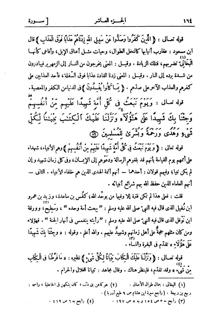 قَوْلُهُ تَعَالَى: (وَيَوْمَ نَبْعَثُ فِي كُلِّ أُمَّةٍ شَهِيداً عَلَيْهِمْ مِنْ أَنْفُسِهِمْ) وَهُمُ الْأَنْبِيَاءُ شُهَدَاءُ عَلَى أُمَمِهِمْ يَوْمَ الْقِيَامَةِ بِأَنَّهُمْ قَدْ بَلَّغُوا الرِّسَالَةَ وَدَعَوْهُمْ إِلَى الْإِيمَانِ، فِي كُلِّ زَمَانٍ شَهِيدٌ وَإِنْ لَمْ يَكُنْ نَبِيًّا، وَفِيهِمْ قَوْلَانِ: أَحَدُهُمَا- أَنَّهُمْ أَئِمَّةُ الْهُدَى الَّذِينَ هُمْ خُلَفَاءُ الْأَنْبِيَاءِ. الثَّانِي- أَنَّهُمُ الْعُلَمَاءُ الَّذِينَ حَفِظَ اللَّهُ بِهِمْ شَرَائِعَ أَنْبِيَائِهِ. قُلْتُ: فَعَلَى هَذَا لَمْ تَكُنْ فَتْرَةً إِلَّا وَفِيهَا مَنْ يُوَحِّدُ اللَّهَ، كَقُسِّ بْنِ سَاعِدَةَ، وَزَيْدِ بن عمرو ابن نُفَيْلٍ الَّذِي قَالَ فِيهِ النَّبِيُّ صَلَّى اللَّهُ عَلَيْهِ وَسَلَّمَ:" يُبْعَثُ أُمَّةً وَحْدَهُ"، وَسَطِيحٍ «٢»، وَوَرَقَةَ ابن نَوْفَلٍ الَّذِي قَالَ فِيهِ النَّبِيُّ صَلَّى اللَّهُ عَلَيْهِ وَسَلَّمَ:" رَأَيْتُهُ يَنْغَمِسُ فِي أَنْهَارِ الْجَنَّةِ". فَهَؤُلَاءِ وَمَنْ كَانَ مِثْلُهُمْ حُجَّةٌ عَلَى أَهْلِ زمانهم وشهيد عليهم. والله أعلم. وقوله:" وَجِئْنا بِكَ شَهِيداً عَلى هؤُلاءِ" تقدم في البقرة والنساء «٣». قَوْلُهُ تَعَالَى: (وَنَزَّلْنا عَلَيْكَ الْكِتابَ تِبْياناً لِكُلِّ شَيْءٍ) نَظِيرُهُ:" مَا فَرَّطْنا فِي الْكِتابِ مِنْ شَيْءٍ «٤» " وَقَدْ تَقَدَّمَ، فَلْيُنْظَرْ هُنَاكَ. وَقَالَ مُجَاهِدٌ: تبيانا للحلال والحرام.