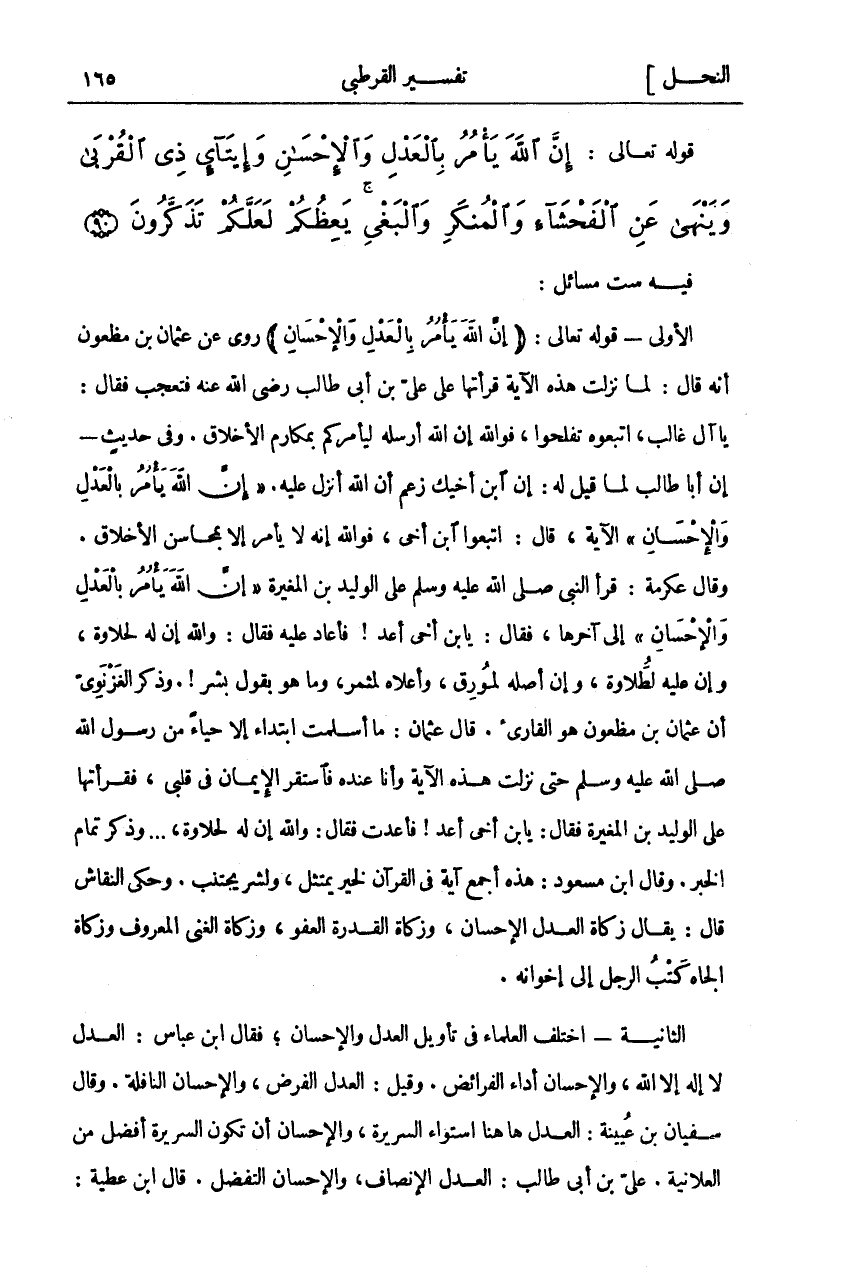 فِيهِ سِتُّ مَسَائِلَ: الْأُولَى- قَوْلُهُ تَعَالَى: (إِنَّ اللَّهَ يَأْمُرُ بِالْعَدْلِ وَالْإِحْسانِ) رُوِيَ عَنْ عُثْمَانَ بْنِ مَظْعُونٍ أَنَّهُ قَالَ: لَمَّا نَزَلَتْ هَذِهِ الْآيَةُ قَرَأْتُهَا عَلَى عَلِيِّ بْنِ أَبِي طَالِبٍ رَضِيَ اللَّهُ عَنْهُ فَتَعَجَّبَ فَقَالَ: يا آل غالب، اتبعوه تفلحوا، فو الله إِنَّ اللَّهَ أَرْسَلَهُ لِيَأْمُرَكُمْ بِمَكَارِمِ الْأَخْلَاقِ. وَفِي حَدِيثٍ- إِنَّ أَبَا طَالِبٍ لَمَّا قِيلَ لَهُ: إِنَّ ابْنَ أَخِيكَ زَعَمَ أَنَّ اللَّهَ أَنْزَلَ عَلَيْهِ" إِنَّ اللَّهَ يَأْمُرُ بِالْعَدْلِ وَالْإِحْسانِ" الْآيَةَ، قال: اتبعوا ابن أخى، فو الله إِنَّهُ لَا يَأْمُرُ إِلَّا بِمَحَاسِنِ الْأَخْلَاقِ. وَقَالَ عِكْرِمَةُ: قَرَأَ النَّبِيُّ صَلَّى اللَّهُ عَلَيْهِ وَسَلَّمَ عَلَى الْوَلِيدِ بْنِ الْمُغِيرَةِ" إِنَّ اللَّهَ يَأْمُرُ بِالْعَدْلِ وَالْإِحْسانِ" إلى آخرها، فقال: يا بن أَخِي أَعِدْ! فَأَعَادَ عَلَيْهِ فَقَالَ: وَاللَّهِ إِنَّ لَهُ لَحَلَاوَةٌ، وَإِنَّ عَلَيْهِ لَطَلَاوَةٌ، وَإِنَّ أَصْلَهُ لَمُورِقٌ، وَأَعْلَاهُ لَمُثْمِرٌ، وَمَا هُوَ بِقَوْلِ بَشَرَ!. وَذَكَرَ الْغَزْنَوِيُّ أَنَّ عُثْمَانَ بْنَ مَظْعُونٍ هُوَ الْقَارِئُ. قَالَ عُثْمَانُ: مَا أَسْلَمْتُ ابْتِدَاءً إِلَّا حَيَاءً مِنْ رَسُولِ اللَّهِ صَلَّى اللَّهُ عَلَيْهِ وَسَلَّمَ حَتَّى نَزَلَتْ هَذِهِ الْآيَةُ وَأَنَا عِنْدَهُ فَاسْتَقَرَّ الْإِيمَانُ فِي قَلْبِي، فَقَرَأَتْهَا عَلَى الْوَلِيدِ بن المغيرة فقال: يا بن أَخِي أَعِدْ! فَأَعَدْتُ فَقَالَ: وَاللَّهِ إِنَّ لَهُ لَحَلَاوَةٌ، ... وَذَكَرَ تَمَامَ الْخَبَرِ. وَقَالَ ابْنُ مَسْعُودٍ: هَذِهِ أَجْمَعُ آيَةٍ فِي الْقُرْآنِ لِخَيْرٍ يُمْتَثَلُ، وَلِشَرٍّ يُجْتَنَبُ. وَحَكَى النَّقَّاشُ قَالَ: يُقَالُ زَكَاةُ الْعَدْلِ الْإِحْسَانُ، وَزَكَاةُ الْقُدْرَةِ الْعَفْوُ، وَزَكَاةُ الْغِنَى الْمَعْرُوفُ، وَزَكَاةُ الْجَاهِ كَتْبُ الرَّجُلِ إِلَى إِخْوَانِهِ. الثَّانِيَةُ- اخْتَلَفَ الْعُلَمَاءُ فِي تَأْوِيلِ الْعَدْلِ وَالْإِحْسَانِ، فَقَالَ ابْنُ عَبَّاسٍ: الْعَدْلُ لَا إِلَهَ إِلَّا اللَّهُ، وَالْإِحْسَانُ أَدَاءُ الْفَرَائِضِ. وَقِيلَ: الْعَدْلُ الْفَرْضُ، وَالْإِحْسَانُ النَّافِلَةُ. وَقَالَ سُفْيَانُ بْنُ عُيَيْنَةَ: الْعَدْلُ ها هنا اسْتِوَاءُ السَّرِيرَةِ، وَالْإِحْسَانُ أَنْ تَكُونَ السَّرِيرَةُ أَفْضَلُ مِنَ الْعَلَانِيَةِ. عَلِيُّ بْنُ أَبِي طَالِبٍ: الْعَدْلُ الْإِنْصَافُ، وَالْإِحْسَانُ التَّفَضُّلُ. قَالَ ابْنُ عَطِيَّةَ: