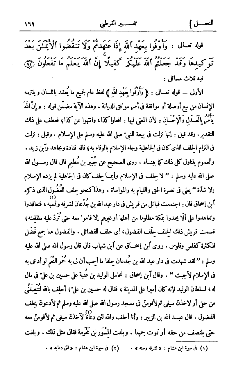 فِيهِ ثَلَاثُ مَسَائِلَ: الْأُولَى: قَوْلُهُ تَعَالَى: (وَأَوْفُوا بِعَهْدِ اللَّهِ) لَفْظٌ عَامٌّ لِجَمِيعِ مَا يُعْقَدُ بِاللِّسَانِ ويلتزمه الإنسان من بيع أو صلة أو مواثقة في أمر موافق للديانة. وهذه الآية مضمن قوله:" إِنَّ اللَّهَ يَأْمُرُ بِالْعَدْلِ وَالْإِحْسانِ" لِأَنَّ الْمَعْنَى فِيهَا: افْعَلُوا كَذَا، وَانْتَهُوا عَنْ كَذَا، فَعَطَفَ عَلَى ذَلِكَ التَّقْدِيرِ. وَقَدْ قِيلَ: إِنَّهَا نَزَلَتْ فِي بَيْعَةِ النَّبِيِّ صَلَّى اللَّهُ عَلَيْهِ وَسَلَّمَ عَلَى الْإِسْلَامِ. وَقِيلَ: نَزَلَتْ فِي الْتِزَامِ الْحِلْفِ الَّذِي كَانَ فِي الْجَاهِلِيَّةِ وَجَاءَ الْإِسْلَامُ بِالْوَفَاءِ، قَالَهُ قَتَادَةُ وَمُجَاهِدٌ وَابْنُ زَيْدٍ. وَالْعُمُومُ يَتَنَاوَلُ كُلَّ ذَلِكَ كَمَا بَيَّنَّاهُ. رَوَى الصَّحِيحُ عَنْ جُبَيْرِ بْنِ مُطْعِمٍ قَالَ قَالَ رَسُولُ اللَّهِ صَلَّى اللَّهُ عَلَيْهِ وَسَلَّمَ:" لَا حِلْفَ فِي الْإِسْلَامِ وَأَيُّمَا حِلْفٍ كَانَ فِي الْجَاهِلِيَّةِ لَمْ يَزِدْهُ الْإِسْلَامُ إِلَّا شِدَّةً" يَعْنِي فِي نُصْرَةِ الْحَقِّ وَالْقِيَامِ بِهِ وَالْمُوَاسَاةِ. وَهَذَا كَنَحْوِ حِلْفِ الْفُضُولِ الَّذِي ذَكَرَهُ ابْنُ إِسْحَاقَ قَالَ: اجْتَمَعَتْ قَبَائِلُ مِنْ قُرَيْشٍ فِي دَارِ عَبْدِ اللَّهِ بْنِ جُدْعَانَ لِشَرَفِهِ وَنَسَبِهِ «١»، فَتَعَاقَدُوا وَتَعَاهَدُوا عَلَى أَلَّا يَجِدُوا بِمَكَّةَ مَظْلُومًا مِنْ أَهْلِهَا أَوْ غَيْرِهِمْ إِلَّا قَامُوا مَعَهُ حَتَّى تُرَدَّ عَلَيْهِ مَظْلَمَتُهُ، فَسَمَّتْ قُرَيْشٌ ذَلِكَ الْحِلْفَ حِلْفَ الْفُضُولِ، أَيْ حِلْفَ الْفَضَائِلِ. وَالْفُضُولُ هُنَا جَمْعُ فَضْلٍ لِلْكَثْرَةِ كَفَلْسٍ وَفُلُوسٍ. رَوَى ابْنُ إِسْحَاقَ عَنِ ابْنِ شِهَابٍ قَالَ قَالَ رَسُولُ اللَّهِ صَلَّى اللَّهُ عَلَيْهِ وَسَلَّمَ:" لَقَدْ شَهِدْتُ فِي دَارِ عَبْدِ اللَّهِ بْنِ جُدْعَانَ حِلْفًا مَا أُحِبُّ أَنَّ لِي بِهِ حُمْرُ النَّعَمِ لَوْ أُدْعَى بِهِ فِي الْإِسْلَامِ لا جبت". وَقَالَ ابْنُ إِسْحَاقَ: تَحَامَلَ الْوَلِيدُ بْنُ عُتْبَةَ عَلَى حُسَيْنِ بْنِ عَلِيٍّ فِي مَالٍ لَهُ، لِسُلْطَانِ الْوَلِيدِ فَإِنَّهُ كَانَ أَمِيرًا عَلَى الْمَدِينَةِ، فَقَالَ لَهُ حُسَيْنُ بْنُ عَلِيٍّ: أَحْلِفُ بِاللَّهِ لَتُنْصِفَنِّي مِنْ حَقِّي أَوْ لَآخُذَنَّ سَيْفِي ثُمَّ لَأَقُومَنَّ فِي مَسْجِدِ رَسُولِ اللَّهِ صَلَّى اللَّهُ عَلَيْهِ وَسَلَّمَ ثُمَّ لَأَدْعُوَنَّ بِحِلْفِ الْفُضُولِ. قَالَ عَبْدُ اللَّهِ بْنُ الزُّبَيْرِ: وَأَنَا أَحْلِفُ وَاللَّهِ لَئِنْ دَعَانَا «٢» لَآخُذَنَّ سَيْفِي ثُمَّ لَأَقُومَنَّ مَعَهُ حَتَّى يَنْتَصِفَ مِنْ حَقِّهِ أَوْ نَمُوتَ جَمِيعًا. وَبَلَغَتِ الْمِسْوَرَ بْنَ مَخْرَمَةَ فَقَالَ مِثْلَ ذَلِكَ. وبلغت