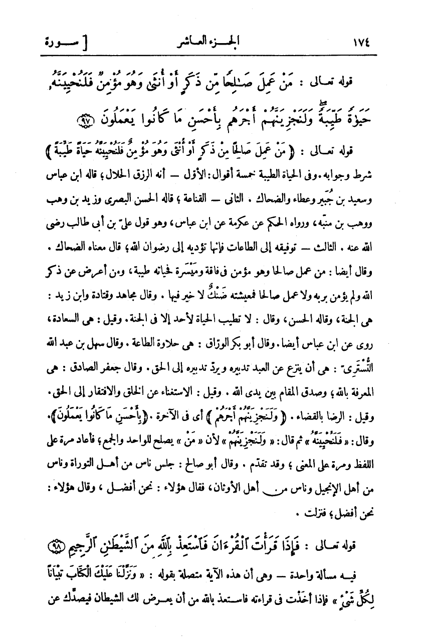 قَوْلُهُ تَعَالَى: (مَنْ عَمِلَ صالِحاً مِنْ ذَكَرٍ أَوْ أُنْثى وَهُوَ مُؤْمِنٌ فَلَنُحْيِيَنَّهُ حَياةً طَيِّبَةً) شَرْطٌ وَجَوَابُهُ. وَفِي الْحَيَاةِ الطَّيِّبَةِ خَمْسَةُ أَقْوَالٍ: الْأَوَّلُ- أَنَّهُ الرِّزْقُ الْحَلَالُ، قَالَهُ ابْنُ عَبَّاسٍ وَسَعِيدُ بْنُ جُبَيْرٍ وَعَطَاءٌ وَالضَّحَّاكُ. الثَّانِي- الْقَنَاعَةُ، قَالَهُ الْحَسَنُ الْبَصْرِيُّ وَزَيْدُ بْنُ وَهْبٍ وَوَهْبُ بْنُ مُنَبِّهٍ، وَرَوَاهُ الْحَكَمُ عَنْ عِكْرِمَةَ عَنِ ابْنِ عَبَّاسٍ، وَهُوَ قَوْلُ عَلِيِّ بْنِ أَبِي طَالِبٍ رَضِيَ اللَّهُ عَنْهُ. الثَّالِثُ- تَوْفِيقُهُ إِلَى الطَّاعَاتِ فَإِنَّهَا تُؤَدِّيهِ إِلَى رِضْوَانِ اللَّهِ، قَالَ مَعْنَاهُ الضَّحَّاكُ. وَقَالَ أَيْضًا: مَنْ عَمِلَ صَالِحًا وَهُوَ مُؤْمِنٌ فِي فَاقَةٍ وَمَيْسَرَةٍ فَحَيَاتُهُ طَيِّبَةٌ، وَمَنْ أَعْرَضَ عَنْ ذِكْرِ اللَّهِ وَلَمْ يُؤْمِنْ بِرَبِّهِ وَلَا عَمِلَ صَالِحًا فَمَعِيشَتُهُ ضَنْكٌ لَا خَيْرَ فِيهَا. وَقَالَ مُجَاهِدٌ وَقَتَادَةُ وَابْنُ زَيْدٍ: هِيَ الْجَنَّةُ، وَقَالَهُ الْحَسَنُ، وَقَالَ: لَا تَطِيبُ الْحَيَاةُ لِأَحَدٍ إِلَّا فِي الْجَنَّةِ. وَقِيلَ: هِيَ السَّعَادَةُ، رُوِيَ عَنِ ابْنِ عَبَّاسٍ أَيْضًا. وَقَالَ أَبُو بَكْرٍ الْوَرَّاقُ: هِيَ حَلَاوَةُ الطَّاعَةِ. وَقَالَ سَهْلُ بْنُ عَبْدِ اللَّهِ التُّسْتَرِيُّ: هِيَ أَنْ يُنْزَعَ عَنِ الْعَبْدِ تَدْبِيرُهُ وَيُرَدُّ تَدْبِيرُهُ إِلَى الْحَقِّ. وَقَالَ جَعْفَرٌ الصَّادِقُ: هِيَ الْمَعْرِفَةُ بِاللَّهِ، وَصِدْقُ الْمُقَامِ بَيْنَ يَدَيِ اللَّهِ. وَقِيلَ: الِاسْتِغْنَاءُ عَنِ الْخَلْقِ وَالِافْتِقَارُ إِلَى الْحَقِّ. وَقِيلَ: الرِّضَا بِالْقَضَاءِ. (وَلَنَجْزِيَنَّهُمْ أَجْرَهُمْ) أَيْ فِي الْآخِرَةِ. (بِأَحْسَنِ مَا كانُوا يَعْمَلُونَ). وَقَالَ:" فَلَنُحْيِيَنَّهُ" ثُمَّ قَالَ:" وَلَنَجْزِيَنَّهُمْ" لِأَنَّ" مَنْ" يَصْلُحُ لِلْوَاحِدِ وَالْجَمْعِ، فَأَعَادَ مَرَّةً عَلَى اللَّفْظِ ومرة على المعنى. وقد تقدم. وَقَالَ أَبُو صَالِحٍ: جَلَسَ نَاسٌ مِنْ أَهْلِ التَّوْرَاةِ وَنَاسٌ مِنْ أَهْلِ الْإِنْجِيلِ وَنَاسٌ مِنْ أَهْلِ الْأَوْثَانِ، فَقَالَ هَؤُلَاءِ: نَحْنُ أَفْضَلُ، وَقَالَ هؤلاء: نحن أفضل، فنزلت.