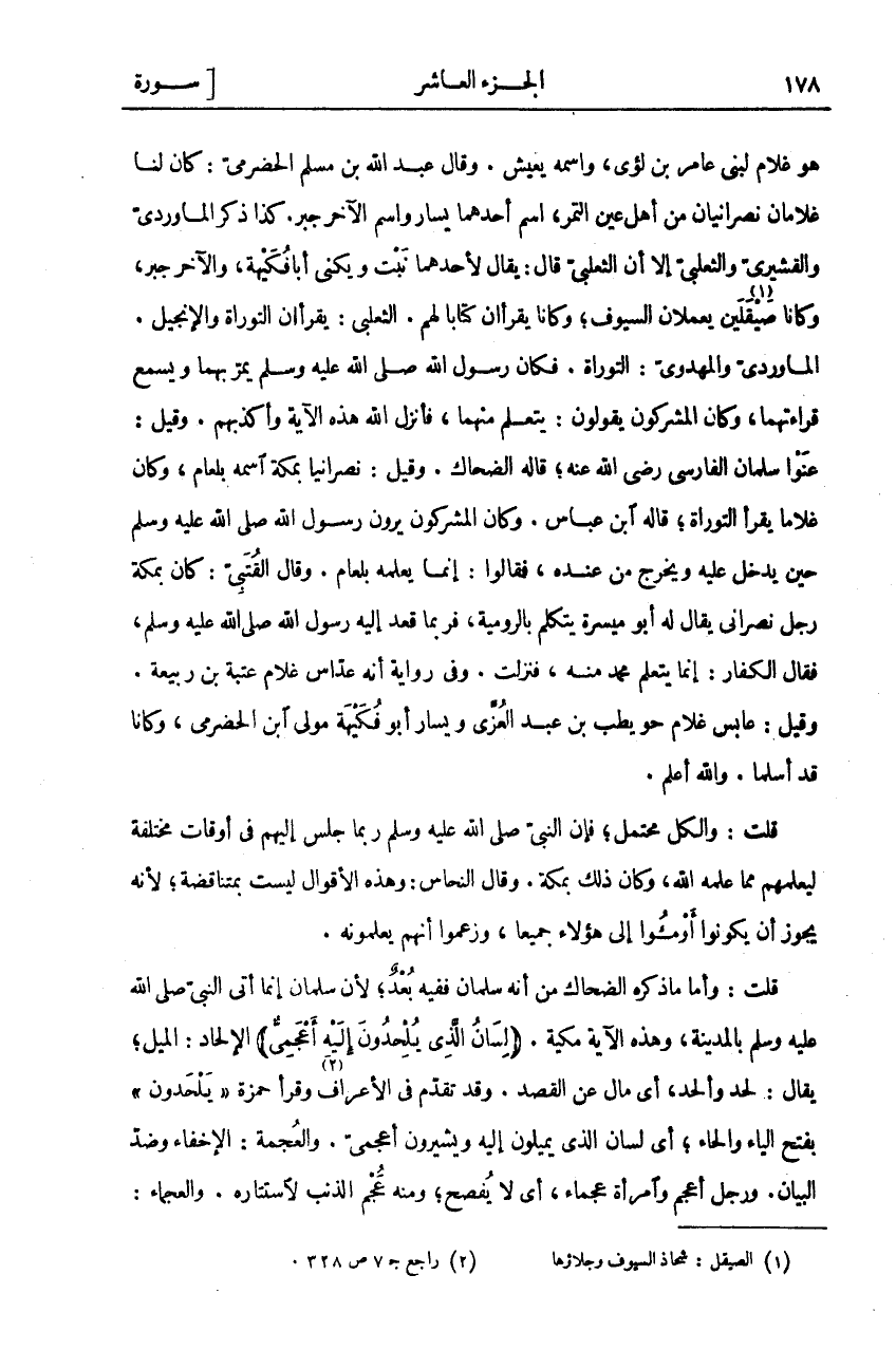 هُوَ غُلَامٌ لِبَنِي عَامِرِ بْنِ لُؤَيٍّ، وَاسْمُهُ يَعِيشُ. وَقَالَ عَبْدُ اللَّهِ بْنُ مُسْلِمٍ الْحَضْرَمِيُّ: كَانَ لَنَا غُلَامَانِ نَصْرَانِيَّانِ مِنْ أَهْلِ عَيْنِ التَّمْرِ، اسْمُ أَحَدِهِمَا يَسَارٌ وَاسْمُ الْآخَرِ جَبْرٌ. كَذَا ذَكَرَ الْمَاوَرْدِيُّ وَالْقُشَيْرِيُّ وَالثَّعْلَبِيُّ، إِلَّا أَنَّ الثَّعْلَبِيَّ قَالَ: يُقَالُ لِأَحَدِهِمَا نَبْتٌ وَيُكْنَى أَبَا فُكَيْهَةَ، وَالْآخَرُ جَبْرٌ، وَكَانَا صَيْقَلَيْنِ «١» يَعْمَلَانِ السُّيُوفَ، وَكَانَا يَقْرَآنِ كِتَابًا لَهُمْ. الثَّعْلَبِيُّ: يَقْرَآنِ التَّوْرَاةَ وَالْإِنْجِيلَ. الْمَاوَرْدِيُّ وَالْمَهْدَوِيُّ: التَّوْرَاةَ. فَكَانَ رَسُولُ اللَّهِ صَلَّى اللَّهُ عَلَيْهِ وَسَلَّمَ يَمُرُّ بِهِمَا وَيَسْمَعُ قِرَاءَتَهُمَا، وَكَانَ الْمُشْرِكُونَ يَقُولُونَ: يَتَعَلَّمُ مِنْهُمَا، فَأَنْزَلَ اللَّهُ هَذِهِ الْآيَةَ وَأَكْذَبَهُمْ. وَقِيلَ: عَنَوْا سَلْمَانَ الْفَارِسِيَّ رَضِيَ اللَّهُ عَنْهُ، قَالَهُ الضَّحَّاكُ. وَقِيلَ: نَصْرَانِيًّا بِمَكَّةَ اسْمُهُ بَلْعَامُ، وَكَانَ غُلَامًا يَقْرَأُ التوراة، قاله ابن عباس. وكان المشركون يرون رَسُولُ اللَّهِ صَلَّى اللَّهُ عَلَيْهِ وَسَلَّمَ حِينَ يدخل عليه ويخرج من عنده، فقالوا: إنما يعلمه بلعام. وَقَالَ الْقُتَبِيُّ: كَانَ بِمَكَّةَ رَجُلٌ نَصْرَانِيٌّ يُقَالُ لَهُ أَبُو مَيْسَرَةَ يَتَكَلَّمُ بِالرُّومِيَّةِ، فَرُبَّمَا قَعَدَ إِلَيْهِ رَسُولُ اللَّهِ صَلَّى اللَّهُ عَلَيْهِ وَسَلَّمَ، فَقَالَ الْكُفَّارُ: إِنَّمَا يَتَعَلَّمُ مُحَمَّدٌ مِنْهُ، فَنَزَلَتْ. وَفِي رِوَايَةٍ أَنَّهُ عَدَّاسٌ غُلَامُ عُتْبَةَ بْنِ رَبِيعَةَ. وَقِيلَ: عَابِسٌ غُلَامُ حُوَيْطِبِ بْنِ عَبْدِ الْعُزَّى وَيَسَارٌ أَبُو فَكِيهَةَ مَوْلَى ابْنِ الْحَضْرَمِيِّ، وَكَانَا قَدْ أَسْلَمَا. وَاللَّهُ أَعْلَمُ. قُلْتُ: وَالْكُلُّ مُحْتَمَلٌ، فَإِنَّ النَّبِيَّ صَلَّى اللَّهُ عَلَيْهِ وَسَلَّمَ رُبَّمَا جَلَسَ إِلَيْهِمْ فِي أَوْقَاتٍ مُخْتَلِفَةٍ لِيُعَلِّمَهُمْ مِمَّا عَلَّمَهُ اللَّهُ، وَكَانَ ذَلِكَ بِمَكَّةَ. وَقَالَ النَّحَّاسُ: وَهَذِهِ الْأَقْوَالُ لَيْسَتْ بِمُتَنَاقِضَةٍ، لِأَنَّهُ يَجُوزُ أن يكونوا أومئوا إِلَى هَؤُلَاءِ جَمِيعًا، وَزَعَمُوا أَنَّهُمْ يُعَلِّمُونَهُ. قُلْتُ: وَأَمَّا مَا ذَكَرَهُ الضَّحَّاكُ مِنْ أَنَّهُ سَلْمَانُ فَفِيهِ بُعْدٌ، لِأَنَّ سَلْمَانَ إِنَّمَا أَتَى النَّبِيَّ صَلَّى اللَّهُ عَلَيْهِ وَسَلَّمَ بِالْمَدِينَةِ، وَهَذِهِ الْآيَةُ مَكِّيَّةٌ. (لِسانُ الَّذِي يُلْحِدُونَ إِلَيْهِ أَعْجَمِيٌّ) الْإِلْحَادُ: الْمَيْلُ، يُقَالُ: لَحَدَ وَأَلْحَدَ، أَيْ مَالَ عَنِ الْقَصْدِ وَقَدْ تَقَدَّمَ فِي الْأَعْرَافِ «٢». وَقَرَأَ حَمْزَةُ" يَلْحَدُونَ" بِفَتْحِ الْيَاءِ وَالْحَاءِ، أَيْ لِسَانُ الَّذِي يَمِيلُونَ إِلَيْهِ وَيُشِيرُونَ أَعْجَمِيٌّ. وَالْعُجْمَةُ: الْإِخْفَاءُ وَضِدُّ البيان. ورجل أعجم وامرأة عجم، أَيْ لَا يُفْصِحُ، وَمِنْهُ عُجْمُ الذَّنَبِ لِاسْتِتَارِهِ. والعجماء:
