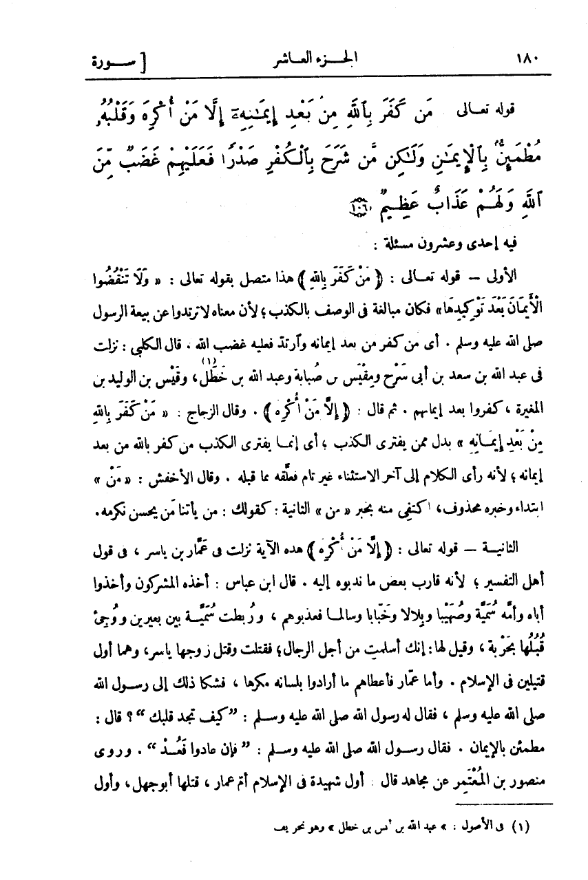مَنْ كَفَرَ بِاللَّهِ مِنْ بَعْدِ إِيمانِهِ إِلاَّ مَنْ أُكْرِهَ وَقَلْبُهُ مُطْمَئِنٌّ بِالْإِيمانِ وَلكِنْ مَنْ شَرَحَ بِالْكُفْرِ صَدْراً فَعَلَيْهِمْ غَضَبٌ مِنَ اللَّهِ وَلَهُمْ عَذابٌ عَظِيمٌ (١٠٦)