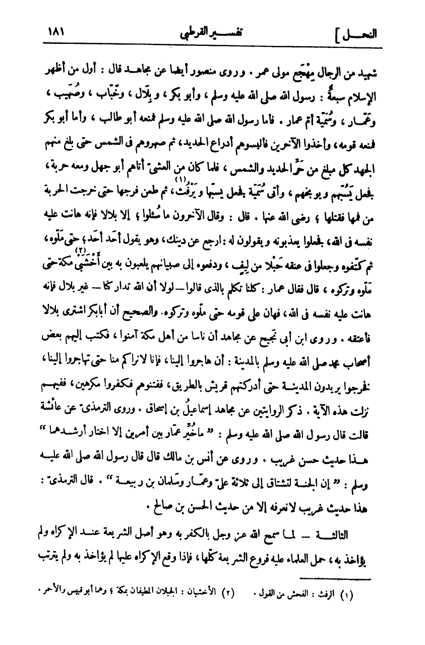 شَهِيدٍ مِنَ الرِّجَالِ مِهْجَعٌ مَوْلَى عُمَرَ. وَرَوَى مَنْصُورٌ أَيْضًا عَنْ مُجَاهِدٍ قَالَ: أَوَّلُ مَنْ أَظْهَرَ الْإِسْلَامَ سَبْعَةٌ: رَسُولُ اللَّهِ صَلَّى اللَّهُ عَلَيْهِ وَسَلَّمَ وَأَبُو بَكْرٍ، وَبِلَالٌ، وَخَبَّابٌ، وَصُهَيْبٌ، وَعَمَّارٌ، وَسُمَيَّةُ أُمُّ عَمَّارٍ. فَأَمَّا رَسُولُ اللَّهِ صَلَّى اللَّهُ عَلَيْهِ وَسَلَّمَ فَمَنَعَهُ أَبُو طَالِبٍ، وَأَمَّا أَبُو بَكْرٍ فَمَنَعَهُ قَوْمُهُ، وَأَخَذُوا الْآخَرِينَ فَأَلْبَسُوهُمْ أَدْرُعَ الْحَدِيدِ، ثُمَّ صَهَرُوهُمْ فِي الشَّمْسِ حَتَّى بَلَغَ مِنْهُمُ الْجَهْدُ كُلَّ مَبْلَغٍ مِنْ حَرِّ الْحَدِيدِ وَالشَّمْسِ، فَلَمَّا كَانَ مِنَ الْعَشِيِّ أَتَاهُمْ أَبُو جَهْلٍ وَمَعَهُ حَرْبَةٌ، فَجَعَلَ يَسُبُّهُمْ وَيُوَبِّخُهُمْ، وَأَتَى سُمَيَّةَ فَجَعَلَ يَسُبَّهَا وَيَرْفُثُ «١»، ثُمَّ طَعَنَ فَرْجَهَا حَتَّى خَرَجَتِ الْحَرْبَةُ مِنْ فَمِهَا فَقَتَلَهَا، رَضِيَ اللَّهُ عَنْهَا. قَالَ: وَقَالَ الْآخَرُونَ مَا سُئِلُوا، إِلَّا بِلَالًا فَإِنَّهُ هَانَتْ عَلَيْهِ نَفْسُهُ فِي اللَّهِ، فَجَعَلُوا يُعَذِّبُونَهُ وَيَقُولُونَ لَهُ: ارْجِعْ عَنْ دِينِكَ، وَهُوَ يَقُولُ أَحَدٌ أَحَدٌ، حَتَّى مَلُّوهُ، ثُمَّ كَتَّفُوهُ وَجَعَلُوا فِي عُنُقِهِ حَبْلًا مِنْ لِيفٍ، وَدَفَعُوهُ إِلَى صِبْيَانِهِمْ يَلْعَبُونَ بِهِ بَيْنَ أَخْشَبَيْ «٢» مَكَّةَ حَتَّى مَلُّوهُ وَتَرَكُوهُ، قَالَ فَقَالَ عَمَّارٌ: كُلُّنَا تَكَلَّمَ بِالَّذِي قَالُوا- لَوْلَا أَنَّ اللَّهَ تَدَارَكَنَا- غَيْرَ بِلَالٍ فَإِنَّهُ هَانَتْ عَلَيْهِ نَفْسُهُ فِي اللَّهِ، فَهَانَ عَلَى قَوْمِهِ حَتَّى مَلُّوهُ وَتَرَكُوهُ. وَالصَّحِيحُ أَنَّ أَبَا بَكْرٍ اشْتَرَى بِلَالًا فَأَعْتَقَهُ. وَرَوَى ابْنُ أَبِي نَجِيحٍ عَنْ مُجَاهِدٍ أَنَّ نَاسًا مِنْ أَهْلِ مَكَّةَ آمَنُوا، فَكَتَبَ إِلَيْهِمْ بَعْضُ أَصْحَابِ مُحَمَّدٍ صَلَّى اللَّهُ عَلَيْهِ وَسَلَّمَ بِالْمَدِينَةِ: أَنْ هَاجِرُوا إِلَيْنَا، فَإِنَّا لَا نَرَاكُمْ مِنَّا حَتَّى تُهَاجِرُوا إِلَيْنَا، فَخَرَجُوا يُرِيدُونَ الْمَدِينَةَ حَتَّى أَدْرَكَتْهُمْ قُرَيْشٌ بِالطَّرِيقِ، فَفَتَنُوهُمْ فَكَفَرُوا مُكْرَهِينَ، فَفِيهِمْ نَزَلَتْ هَذِهِ الْآيَةُ. ذَكَرَ الرِّوَايَتَيْنِ عَنْ مُجَاهِدٍ إِسْمَاعِيلُ بْنُ إِسْحَاقَ. وَرَوَى التِّرْمِذِيُّ عَنْ عَائِشَةَ قَالَتْ قَالَ رَسُولُ اللَّهِ صَلَّى اللَّهُ عَلَيْهِ وَسَلَّمَ:" ما خُيِّرَ عَمَّارٌ بَيْنَ أَمْرَيْنِ إِلَّا اخْتَارَ أَرْشَدَهُمَا" هَذَا حَدِيثٌ حَسَنٌ غَرِيبٌ. وَرُوِيَ عَنْ أَنَسِ بْنِ مَالِكٍ قَالَ قَالَ رَسُولُ الله صَلَّى اللَّهُ عَلَيْهِ وَسَلَّمَ:" إِنَّ الْجَنَّةَ تَشْتَاقُ إِلَى ثلاثة علي وعمار وسلمان بْنِ رَبِيعَةَ". قَالَ التِّرْمِذِيُّ: هَذَا حَدِيثٌ غَرِيبٌ لَا نَعْرِفُهُ إِلَّا مِنْ حَدِيثِ الْحَسَنِ بْنِ صالح. الثانية- لَمَّا سَمَحَ اللَّهُ عَزَّ وَجَلَّ بِالْكُفْرِ بِهِ وَهُوَ أَصْلُ الشَّرِيعَةِ عِنْدَ الْإِكْرَاهِ وَلَمْ يُؤَاخِذْ بِهِ، حَمَلَ الْعُلَمَاءُ عَلَيْهِ فُرُوعَ الشَّرِيعَةِ كُلَّهَا، فَإِذَا وَقَعَ الْإِكْرَاهُ عَلَيْهَا لَمْ يُؤَاخَذْ بِهِ ولم يترتب