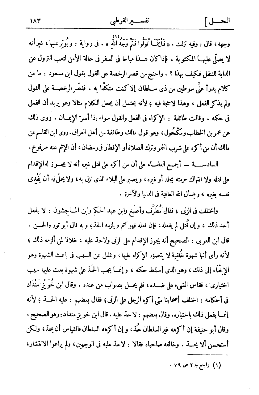 وَجْهُهُ، قَالَ: وَفِيهِ نَزَلَتْ" فَأَيْنَما تُوَلُّوا فَثَمَّ وَجْهُ اللَّهِ «١» " فِي رِوَايَةٍ: وَيُوتِرُ عَلَيْهَا، غَيْرَ أَنَّهُ لَا يُصَلِّي عَلَيْهَا الْمَكْتُوبَةَ. فَإِذَا كَانَ هَذَا مُبَاحًا فِي السَّفَرِ فِي حَالَةِ الْأَمْنِ لِتَعَبِ النُّزُولِ عَنِ الدَّابَّةِ لِلتَّنَفُّلِ فَكَيْفَ بِهَذَا. وَاحْتَجَّ مَنْ قَصَرَ الرُّخْصَةَ عَلَى الْقَوْلِ بِقَوْلِ ابْنِ مَسْعُودٍ: مَا مِنْ كَلَامٍ يَدْرَأُ عَنِّي سَوْطَيْنِ مِنْ ذِي سُلْطَانٍ إِلَّا كُنْتُ مُتَكَلِّمًا بِهِ. فَقَصَرَ الرُّخْصَةَ عَلَى الْقَوْلِ وَلَمْ يَذْكُرِ الْفِعْلَ، وَهَذَا لَا حُجَّةَ فِيهِ، لِأَنَّهُ يَحْتَمِلُ أن يجعل الكلام مِثَالًا وَهُوَ يُرِيدُ أَنَّ الْفِعْلَ فِي حُكْمِهِ. وَقَالَتْ طَائِفَةٌ: الْإِكْرَاهُ فِي الْفِعْلِ وَالْقَوْلِ سَوَاءٌ إِذَا أَسَرَّ الْإِيمَانَ. رُوِيَ ذَلِكَ عَنْ عُمَرَ بْنِ الْخَطَّابِ وَمَكْحُولٍ، وَهُوَ قَوْلُ مَالِكٍ وَطَائِفَةٍ مِنْ أَهْلِ الْعِرَاقِ. رَوَى ابْنُ الْقَاسِمِ عَنْ مَالِكٍ أَنَّ مَنْ أُكْرِهَ عَلَى شُرْبِ الْخَمْرِ وَتَرْكِ الصَّلَاةِ أَوِ الْإِفْطَارِ فِي رَمَضَانَ، أَنَّ الْإِثْمَ عَنْهُ مَرْفُوعٌ. السَّادِسَةُ- أَجْمَعَ الْعُلَمَاءُ عَلَى أَنَّ مَنْ أُكْرِهَ عَلَى قَتْلِ غَيْرِهِ أَنَّهُ لَا يَجُوزُ لَهُ الْإِقْدَامُ عَلَى قَتْلِهِ وَلَا انْتَهَاكُ حُرْمَتِهِ بِجَلْدٍ أَوْ غَيْرِهِ، وَيَصْبِرُ عَلَى الْبَلَاءِ الَّذِي نَزَلَ بِهِ، وَلَا يَحِلُّ لَهُ أَنْ يَفْدِيَ نَفْسَهُ بِغَيْرِهِ، وَيَسْأَلُ اللَّهُ الْعَافِيَةَ في الدنيا والآخرة. واختلف في الزنى، فَقَالَ مُطَرِّفٌ وَأَصْبَغُ وَابْنُ عَبْدِ الْحَكَمِ وَابْنُ الْمَاجِشُونِ: لَا يَفْعَلُ أَحَدٌ ذَلِكَ، وَإِنْ قُتِلَ لَمْ يَفْعَلْهُ، فَإِنْ فَعَلَهُ فَهُوَ آثِمٌ وَيَلْزَمُهُ الْحَدُّ، وَبِهِ قَالَ أَبُو ثَوْرٍ وَالْحَسَنُ. قَالَ ابْنُ الْعَرَبِيِّ: الصَّحِيحُ أَنَّهُ يَجُوزُ الْإِقْدَامُ عَلَى الزنى وَلَا حَدَّ عَلَيْهِ، خِلَافًا لِمَنْ أَلْزَمَهُ ذَلِكَ، لِأَنَّهُ رَأَى أَنَّهَا شَهْوَةٌ خَلْقِيَّةٌ لَا يُتَصَوَّرُ الْإِكْرَاهُ عَلَيْهَا، وَغَفَلَ عَنِ السَّبَبِ فِي بَاعِثِ الشَّهْوَةِ وَهُوَ الْإِلْجَاءُ إِلَى ذَلِكَ، وَهُوَ الَّذِي أَسْقَطَ حُكْمَهُ، وَإِنَّمَا يَجِبُ الْحَدُّ عَلَى شَهْوَةٍ بَعَثَ عَلَيْهَا سَبَبٌ اخْتِيَارِيٌّ، فَقَاسَ الشَّيْءَ عَلَى ضِدِّهِ، فَلَمْ يَحِلَّ بِصَوَابٍ مِنْ عِنْدِهِ. وَقَالَ ابْنُ خُوَيْزِ مَنْدَادَ فِي أَحْكَامِهِ: اخْتَلَفَ أَصْحَابُنَا متى أكره الرجل على الزنى، فَقَالَ بَعْضُهُمْ: عَلَيْهِ الْحَدُّ، لِأَنَّهُ إِنَّمَا يَفْعَلُ ذَلِكَ بِاخْتِيَارِهِ. وَقَالَ بَعْضُهُمْ: لَا حَدَّ عَلَيْهِ. قَالَ ابْنُ خُوَيْزِ مَنْدَادَ: وَهُوَ الصَّحِيحُ. وَقَالَ أَبُو حَنِيفَةَ: إِنْ أَكْرَهَهُ غَيْرُ السُّلْطَانِ حُدَّ، وَإِنْ أَكْرَهَهُ السُّلْطَانُ فَالْقِيَاسُ أَنْ يُحَدَّ، وَلَكِنْ أَسْتَحْسِنُ أَلَّا يُحَدَّ. وَخَالَفَهُ صَاحِبَاهُ فَقَالَا: لَا حَدَّ عَلَيْهِ فِي الْوَجْهَيْنِ، وَلَمْ يُرَاعُوا الِانْتِشَارَ،