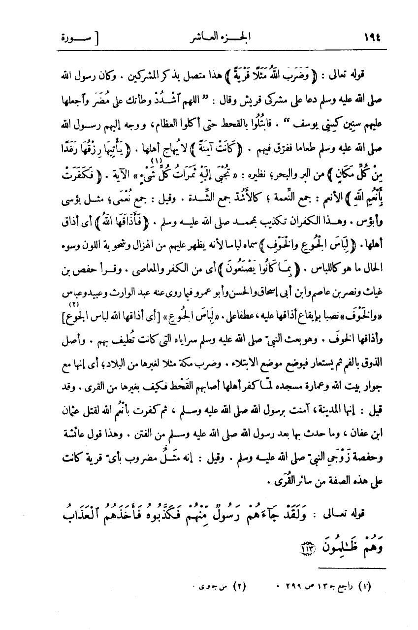 قَوْلُهُ تَعَالَى: (وَضَرَبَ اللَّهُ مَثَلًا قَرْيَةً) هَذَا مُتَّصِلٌ بِذِكْرِ الْمُشْرِكِينَ. وَكَانَ رَسُولُ اللَّهِ صَلَّى اللَّهُ عَلَيْهِ وَسَلَّمَ دَعَا عَلَى مُشْرِكِي قُرَيْشٍ وَقَالَ:" اللَّهُمَّ اشْدُدْ وَطْأَتَكَ عَلَى مُضَرٍ وَاجْعَلْهَا عَلَيْهِمْ سِنِينَ كَسِنِي يُوسُفَ". فَابْتُلُوا بِالْقَحْطِ حَتَّى أَكَلُوا الْعِظَامَ، وَوَجَّهَ إِلَيْهِمْ رَسُولُ اللَّهِ صَلَّى اللَّهُ عَلَيْهِ وَسَلَّمَ طَعَامًا فَفُرِّقَ فِيهِمْ. (كانَتْ آمِنَةً) لا يهاج أهلها. (يَأْتِيها رِزْقُها رَغَداً مِنْ كُلِّ مَكانٍ) مِنَ الْبَرِّ وَالْبَحْرِ، نَظِيرُهُ" يُجْبى إِلَيْهِ ثَمَراتُ كُلِّ شَيْءٍ «١» " الْآيَةَ. (فَكَفَرَتْ بِأَنْعُمِ اللَّهِ) الْأَنْعُمُ: جَمْعُ النِّعْمَةِ، كَالْأَشُدِّ جَمْعُ الشِّدَّةِ. وَقِيلَ: جَمْعُ نُعْمَى، مِثْلَ بُؤْسَى وَأَبْؤُسٍ. وَهَذَا الْكُفْرَانُ تَكْذِيبٌ بِمُحَمَّدٍ صَلَّى اللَّهُ عَلَيْهِ وَسَلَّمَ. (فَأَذاقَهَا اللَّهُ) أَيْ أَذَاقَ أَهْلَهَا. (لِباسَ الْجُوعِ وَالْخَوْفِ) سَمَّاهُ لِبَاسًا لِأَنَّهُ يَظْهَرُ عَلَيْهِمْ مِنَ الْهُزَالِ وَشُحُوبَةِ اللَّوْنِ وَسُوءِ الْحَالِ مَا هُوَ كَاللِّبَاسِ. (بِما كانُوا يَصْنَعُونَ) أي من الكفر والمعاصي. وقرا حَفْصُ بْنُ غِيَاثٍ وَنَصْرُ بْنُ عَاصِمٍ وَابْنُ أَبِي إِسْحَاقَ وَالْحَسَنُ وَأَبُو عَمْرٍو فِيمَا رَوَى عَنْهُ عَبْدُ الْوَارِثِ وَعُبَيْدٌ وَعَبَّاسٌ" وَالْخَوْفُ" نَصْبًا بِإِيقَاعِ أَذَاقَهَا عَلَيْهِ، عَطْفًا عَلَى." لِباسَ الْجُوعِ" [أي أذاقها الله لِبَاسَ الْجُوعِ «٢»] " وَأَذَاقَهَا الْخَوْفَ. وَهُوَ بَعْثُ النَّبِيِّ صَلَّى اللَّهُ عَلَيْهِ وَسَلَّمَ سَرَايَاهُ الَّتِي كَانَتْ تَطِيفُ بِهِمْ. وَأَصْلُ الذَّوْقِ بِالْفَمِ ثُمَّ يُسْتَعَارُ فَيُوضَعُ مَوْضِعَ الِابْتِلَاءِ. وَضَرَبَ مَكَّةَ مَثَلًا لِغَيْرِهَا مِنَ الْبِلَادِ، أَيْ أَنَّهَا مَعَ جِوَارِ بَيْتِ اللَّهِ وَعِمَارَةِ مَسْجِدِهِ لَمَّا كَفَرَ أَهْلُهَا أَصَابَهُمُ الْقَحْطُ فَكَيْفَ بِغَيْرِهَا مِنَ الْقُرَى. وَقَدْ قِيلَ: إِنَّهَا الْمَدِينَةُ، آمَنَتْ بِرَسُولِ اللَّهِ صَلَّى اللَّهُ عَلَيْهِ وَسَلَّمَ، ثُمَّ كَفَرَتْ بِأَنْعُمِ اللَّهِ لِقَتْلِ عثمان ابن عَفَّانَ، وَمَا حَدَثَ بِهَا بَعْدَ رَسُولِ اللَّهِ صَلَّى اللَّهُ عَلَيْهِ وَسَلَّمَ مِنَ الْفِتَنِ. وَهَذَا قَوْلُ عَائِشَةَ وَحَفْصَةَ زَوْجَيِ النَّبِيِّ صَلَّى اللَّهُ عَلَيْهِ وَسَلَّمَ. قيل: إِنَّهُ مَثَلٌ مَضْرُوبٌ بِأَيِّ قَرْيَةٍ كَانَتْ عَلَى هذه الصفة من سائر القرى.