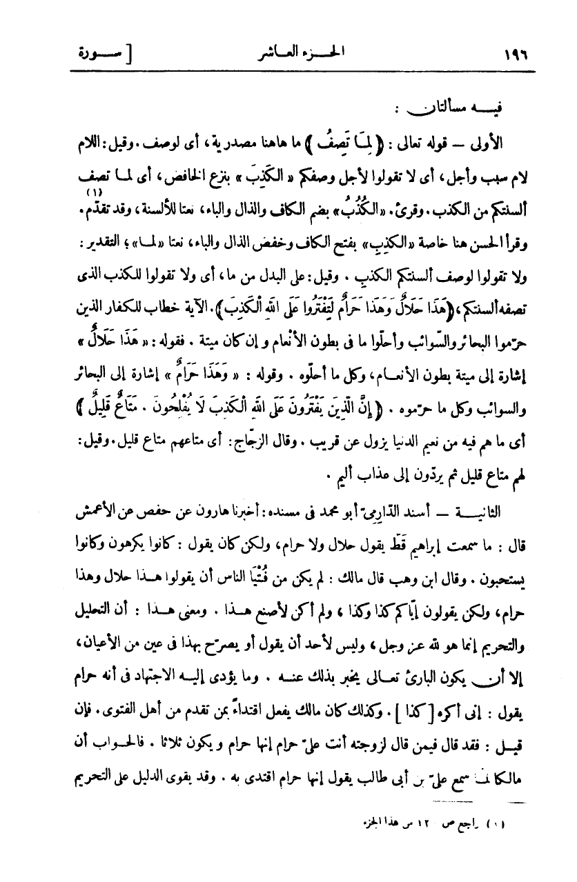 فِيهِ مَسْأَلَتَانِ: الْأُولَى- قَوْلُهُ تَعَالَى: (لِما تَصِفُ) ما هاهنا مَصْدَرِيَّةٌ، أَيْ لِوَصْفِ. وَقِيلَ: اللَّامُ لَامُ سَبَبٍ وأجل، أي لا تقولوا لِأَجْلِ وَصْفِكُمُ" الْكَذِبَ" بِنَزْعِ الْخَافِضِ، أَيْ لِمَا تصف ألسنتكم من الكذب. وقرى." الكذب" بضم الكاف والذال والياء، نَعْتًا لِلْأَلْسِنَةِ، وَقَدْ تَقَدَّمَ «١». وَقَرَأَ الْحَسَنُ هُنَا خَاصَّةً «الْكَذِبَ» بِفَتْحِ الْكَافِ وَخَفْضِ الذَّالِ وَالْبَاءِ، نعتا" لما"، التقدير: وَلَا تَقُولُوا لِلْكَذِبِ الَّذِي تَصِفُهُ أَلْسِنَتُكُمْ، (هَذَا حَلالٌ وَهذا حَرامٌ لِتَفْتَرُوا عَلَى اللَّهِ الْكَذِبَ). الْآيَةُ خِطَابٌ لِلْكُفَّارِ الَّذِينَ حَرَّمُوا الْبَحَائِرَ وَالسَّوَائِبَ وَأَحَلُّوا مَا فِي بُطُونِ الْأَنْعَامِ وَإِنْ كَانَ ميتة. فقوله:" هَذَا حَلالٌ" إِشَارَةً إِلَى مَيْتَةِ بُطُونِ الْأَنْعَامِ، وكل ما أحلوه. وقوله:" وَهذا حَرامٌ" إِشَارَةً إِلَى الْبَحَائِرِ وَالسَّوَائِبِ وَكُلِّ مَا حَرَّمُوهُ. (إِنَّ الَّذِينَ يَفْتَرُونَ عَلَى اللَّهِ الْكَذِبَ لَا يُفْلِحُونَ. مَتاعٌ قَلِيلٌ) أَيْ مَا هُمْ فِيهِ مِنْ نَعِيمِ الدُّنْيَا يَزُولُ عَنْ قَرِيبٍ. وَقَالَ الزَّجَّاجُ: أَيْ مَتَاعُهُمْ مَتَاعٌ قَلِيلٌ. وَقِيلَ: لَهُمْ مَتَاعٌ قَلِيلٌ ثُمَّ يُرَدُّونَ إِلَى عذاب أليم. الثانية- أسند الدرامى أبو محمد في مسنده: أخبارنا هَارُونُ عَنْ حَفْصٍ عَنِ الْأَعْمَشِ قَالَ: مَا سَمِعْتُ إِبْرَاهِيمَ قَطُّ يَقُولُ حَلَالٌ وَلَا حَرَامٌ، وَلَكِنْ كَانَ يَقُولُ: كَانُوا يَكْرَهُونَ وَكَانُوا يَسْتَحِبُّونَ. قال ابْنُ وَهْبٍ قَالَ مَالِكٌ: لَمْ يَكُنْ مِنْ فُتْيَا النَّاسِ أَنْ يَقُولُوا هَذَا حَلَالٌ وَهَذَا حرام، ولكن يقولون إِيَّاكُمْ كَذَا وَكَذَا، وَلَمْ أَكُنْ لِأَصْنَعَ هَذَا. ومعنى هذا: ان التحليل وتحريم إِنَّمَا هُوَ لِلَّهِ عَزَّ وَجَلَّ، وَلَيْسَ لِأَحَدٍ أَنْ يَقُولَ أَوْ يُصَرِّحَ بِهَذَا فِي عَيْنٍ من الأعيان، الا ان يكون الباري تَعَالَى يُخْبِرُ بِذَلِكَ عَنْهُ. وَمَا يُؤَدِّي إِلَيْهِ الِاجْتِهَادُ فِي أَنَّهُ حَرَامٌ يَقُولُ: إِنِّي أَكْرَهُ [كَذَا]. وَكَذَلِكَ كَانَ مَالِكٌ يَفْعَلُ اقْتِدَاءً بِمَنْ تقدم من اهل التقوى. فَإِنْ قِيلَ: فَقَدْ قَالَ فِيمَنْ قَالَ لِزَوْجَتِهِ أَنْتِ عَلَيَّ حَرَامٌ إِنَّهَا حَرَامٌ وَيَكُونُ ثَلَاثًا. فَالْجَوَابُ أَنَّ مَالِكًا لَمَّا سَمِعَ عَلِيَّ بْنَ ابى طالب يقول انها اقْتَدَى بِهِ. وَقَدْ يَقْوَى الدَّلِيلُ عَلَى التَّحْرِيمِ