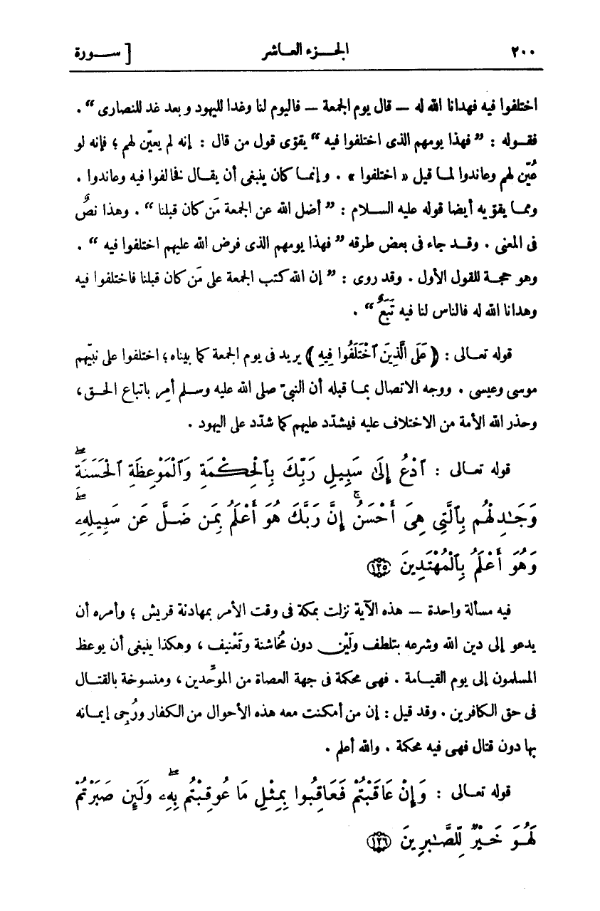 اخْتَلَفُوا فِيهِ فَهَدَانَا اللَّهُ لَهُ- قَالَ يَوْمُ الْجُمْعَةِ- فَالْيَوْمُ لَنَا وَغَدًا لِلْيَهُودِ وَبَعْدَ غَدٍ لِلنَّصَارَى" فَقَوْلُهُ:" فَهَذَا يَوْمُهُمُ الَّذِي اخْتَلَفُوا فِيهِ" يُقَوِّي قَوْلَ مَنْ قَالَ: إِنَّهُ لَمْ يُعَيِّنْ لَهُمْ، فَإِنَّهُ لَوْ عَيَّنَ لَهُمْ وَعَانَدُوا لَمَا قِيلَ" اخْتَلَفُوا". وَإِنَّمَا كَانَ يَنْبَغِي أَنْ يُقَالَ فَخَالَفُوا فِيهِ وَعَانَدُوا. وَمِمَّا يُقَوِّيهِ أَيْضًا قَوْلُهُ عَلَيْهِ السَّلَامُ:" أَضَلَّ اللَّهُ عَنِ الْجُمْعَةِ مَنْ كَانَ قَبْلَنَا". وَهَذَا نَصٌّ فِي الْمَعْنَى. وَقَدْ جَاءَ فِي بَعْضِ طُرُقِهِ" فَهَذَا يَوْمُهُمُ الَّذِي فَرَضَ اللَّهُ عَلَيْهِمُ اخْتَلَفُوا فِيهِ". وَهُوَ حُجَّةٌ لِلْقَوْلِ الْأَوَّلِ. وَقَدْ رُوِيَ:" إِنَّ اللَّهَ كَتَبَ الْجُمْعَةَ عَلَى مَنْ كَانَ قَبْلنَا فَاخْتَلَفُوا فِيهِ وهدانا الله له فالناس لنا تَبَعٌ". قَوْلُهُ تَعَالَى: (عَلَى الَّذِينَ اخْتَلَفُوا فِيهِ) يُرِيدُ فِي يَوْمِ الْجُمْعَةِ كَمَا بَيَّنَّاهُ، اخْتَلَفُوا عَلَى نَبِيِّهِمْ مُوسَى وَعِيسَى. وَوَجْهُ الِاتِّصَالِ بِمَا قَبْلَهُ أَنَّ النَّبِيَّ صَلَّى اللَّهُ عَلَيْهِ وَسَلَّمَ أَمَرَ بِاتِّبَاعِ الْحَقِّ، وَحَذَّرَ اللَّهُ الْأُمَّةَ مِنْ الِاخْتِلَافِ عَلَيْهِ فَيُشَدِّدُ عَلَيْهِمْ كَمَا شَدَّدَ عَلَى اليهود.