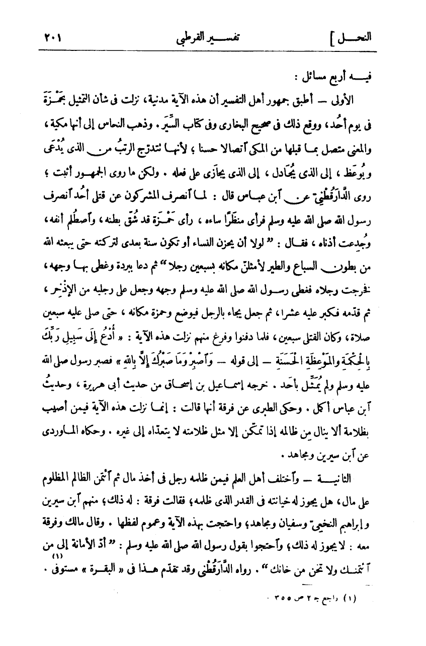 فِيهِ أَرْبَعُ مَسَائِلَ: الْأُولَى- أَطْبَقَ جُمْهُورُ أَهْلِ التَّفْسِيرِ أَنَّ هَذِهِ الْآيَةَ مَدَنِيَّةٌ، نَزَلَتْ فِي شَأْنِ التَّمْثِيلِ بِحَمْزَةَ فِي يَوْمِ أُحُدٍ، وَوَقَعَ ذَلِكَ فِي صَحِيحِ الْبُخَارِيِّ وَفِي كِتَابِ السِّيَرِ. وَذَهَبَ النَّحَّاسُ إِلَى أَنَّهَا مَكِّيَّةٌ، وَالْمَعْنَى مُتَّصِلٌ بِمَا قَبْلَهَا مِنَ الْمَكِّيِّ اتِّصَالًا حَسَنًا، لِأَنَّهَا تَتَدَرَّجُ الرُّتَبُ مِنَ الَّذِي يُدْعَى وَيُوعَظُ، إِلَى الَّذِي يُجَادِلُ، إِلَى الَّذِي يُجَازَى عَلَى فِعْلِهِ. وَلَكِنْ مَا رَوَى الْجُمْهُورُ أَثْبَتُ، رَوَى الدَّارَقُطْنِيُّ عَنِ ابْنِ عَبَّاسٍ قَالَ: لَمَّا انْصَرَفَ الْمُشْرِكُونَ عَنْ قَتْلَى أُحُدٍ انْصَرَفَ رَسُولُ اللَّهِ صَلَّى اللَّهُ عَلَيْهِ وَسَلَّمَ فَرَأَى مَنْظَرًا سَاءَهُ، رَأَى حَمْزَةَ قَدْ شُقَّ بَطْنُهُ، وَاصْطُلِمَ أَنْفُهُ، وَجُدِعَتْ أُذُنَاهُ، فَقَالَ:" لَوْلَا أَنْ يَحْزَنَ النِّسَاءُ أَوْ تَكُونُ سُنَّةً بَعْدِي لَتَرَكْتُهُ حَتَّى يَبْعَثَهُ اللَّهُ مِنْ بُطُونِ السِّبَاعِ وَالطَّيْرِ لَأُمَثِّلَنَّ مَكَانَهُ بِسَبْعِينَ رَجُلًا" ثُمَّ دَعَا بِبُرْدَةٍ وَغَطَّى بِهَا وَجْهَهُ، فَخَرَجَتْ رِجْلَاهُ فَغَطَّى رَسُولُ اللَّهِ صَلَّى اللَّهُ عَلَيْهِ وَسَلَّمَ وَجْهَهُ وَجَعَلَ عَلَى رِجْلَيْهِ مِنَ الْإِذْخِرِ، ثُمَّ قَدَّمَهُ فَكَبَّرَ عَلَيْهِ عَشْرًا، ثُمَّ جَعَلَ يُجَاءُ بِالرَّجُلِ فَيُوضَعُ وَحَمْزَةُ مَكَانَهُ، حَتَّى صَلَّى عَلَيْهِ سَبْعِينَ صَلَاةً، وَكَانَ الْقَتْلَى سَبْعِينَ، فَلَمَّا دُفِنُوا وَفَرَغَ مِنْهُمْ نَزَلَتْ هَذِهِ الْآيَةُ:" ادْعُ إِلى سَبِيلِ رَبِّكَ بِالْحِكْمَةِ وَالْمَوْعِظَةِ الْحَسَنَةِ- إِلَى قَوْلِهِ- وَاصْبِرْ وَما صَبْرُكَ إِلَّا بِاللَّهِ" فَصَبَرَ. رَسُولُ اللَّهِ صَلَّى اللَّهُ عَلَيْهِ وَسَلَّمَ وَلَمْ يُمَثِّلْ بِأَحَدٍ. خَرَّجَهُ إِسْمَاعِيلُ بْنُ إِسْحَاقَ مِنْ حَدِيثِ أَبِي هُرَيْرَةَ، وَحَدِيثُ ابْنِ عَبَّاسٍ أَكْمَلُ. وَحَكَى الطَّبَرِيُّ عَنْ فِرْقَةٍ أَنَّهَا قَالَتْ: إِنَّمَا نَزَلَتْ هَذِهِ الْآيَةُ فِيمَنْ أُصِيبَ بِظُلَامَةٍ أَلَّا يَنَالَ مِنْ ظَالِمِهِ إِذَا تَمَكَّنَ إِلَّا مِثْلَ ظُلَامَتِهِ لَا يَتَعَدَّاهُ إِلَى غَيْرِهِ. وَحَكَاهُ الْمَاوَرْدِيُّ عَنِ ابْنِ سِيرِينَ وَمُجَاهِدٍ. الثَّانِيَةُ- وَاخْتَلَفَ أَهْلُ الْعِلْمِ فِيمَنْ ظَلَمَهُ رَجُلٌ فِي أَخْذِ مَالٍ ثُمَّ ائْتَمَنَ الظَّالِمُ الْمَظْلُومَ عَلَى مَالٍ، هَلْ يَجُوزُ لَهُ خِيَانَتَهُ فِي الْقَدْرِ الَّذِي ظَلَمَهُ، فَقَالَتْ فِرْقَةٌ: لَهُ ذَلِكَ، مِنْهُمُ ابْنُ سِيرِينَ وَإِبْرَاهِيمُ النَّخَعِيُّ وَسُفْيَانُ وَمُجَاهِدٌ، وَاحْتَجَّتْ بِهَذِهِ الْآيَةِ وَعُمُومِ لَفْظِهَا. وَقَالَ مَالِكٌ وَفِرْقَةٌ مَعَهُ: لَا يَجُوزُ لَهُ ذَلِكَ، وَاحْتَجُّوا بِقَوْلِ رَسُولِ اللَّهِ صَلَّى اللَّهُ عَلَيْهِ وَسَلَّمَ:" أَدِّ الْأَمَانَةَ إِلَى مَنِ ائْتَمَنَكَ وَلَا تَخُنْ مَنْ خَانَكَ". رَوَاهُ الدَّارَقُطْنِيُّ. وَقَدْ تَقَدَّمَ هَذَا فِي" الْبَقَرَةِ" مستوفى «١»