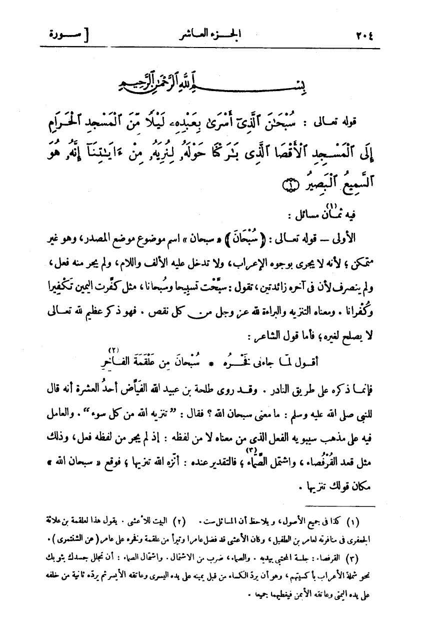 سُبْحانَ الَّذِي أَسْرى بِعَبْدِهِ لَيْلاً مِنَ الْمَسْجِدِ الْحَرامِ إِلَى الْمَسْجِدِ الْأَقْصَى الَّذِي بارَكْنا حَوْلَهُ لِنُرِيَهُ مِنْ آياتِنا إِنَّهُ هُوَ السَّمِيعُ الْبَصِيرُ (١)