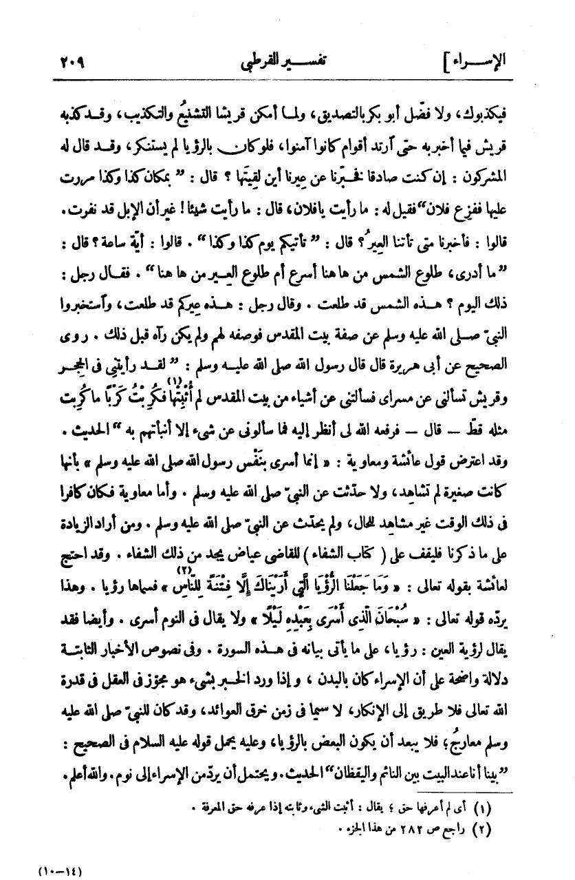 فيكذبوك، والأفضل أَبُو بَكْرٍ بِالتَّصْدِيقِ، وَلَمَا أَمْكَنَ قُرَيْشًا التَّشْنِيعُ وَالتَّكْذِيبُ، وَقَدْ كَذَّبَهُ قُرَيْشٌ فِيمَا أَخْبَرَ بِهِ حَتَّى ارْتَدَّ أَقْوَامٌ كَانُوا آمَنُوا، فَلَوْ كَانَ بِالرُّؤْيَا لَمْ يُسْتَنْكَرْ، وَقَدْ قَالَ لَهُ الْمُشْرِكُونَ: إن كنت صادقا فخبرنا عن عيرنا ابن لَقِيتَهَا؟ قَالَ:" بِمَكَانِ كَذَا وَكَذَا مَرَرْتُ عَلَيْهَا فَفَزِعَ فُلَانٌ" فَقِيلَ لَهُ: مَا رَأَيْتَ يَا فُلَانُ، قَالَ: مَا رَأَيْتُ شَيْئًا! غَيْرَ أَنَّ الْإِبِلَ قَدْ نَفَرَتْ. قَالُوا: فَأَخْبِرْنَا مَتَى تَأْتِينَا الْعِيرُ؟ قَالَ:" تَأْتِيكُمْ يَوْمَ كَذَا وَكَذَا". قَالُوا: أَيَّةَ سَاعَةٍ؟ قَالَ:" مَا أَدْرِي، طُلُوعَ الشَّمْسِ من ها هنا أسرع أم طلوع العير من ها هنا". فَقَالَ رَجُلٌ: ذَلِكَ الْيَوْمُ؟ هَذِهِ الشَّمْسُ قَدْ طَلَعَتْ. وَقَالَ رَجُلٌ: هَذِهِ عِيرُكُمْ قَدْ طَلَعَتْ، وَاسْتَخْبَرُوا النَّبِيَّ صَلَّى اللَّهُ عَلَيْهِ وَسَلَّمَ عَنْ صِفَةِ بَيْتِ الْمَقْدِسِ فَوَصَفَهُ لَهُمْ وَلَمْ يَكُنْ رَآهُ قَبْلَ ذَلِكَ. رَوَى الصَّحِيحُ عَنْ أَبِي هُرَيْرَةَ قَالَ قَالَ رَسُولُ اللَّهِ صَلَّى اللَّهُ عَلَيْهِ وَسَلَّمَ:" لَقَدْ رَأَيْتُنِي فِي الْحِجْرِ وَقُرَيْشٌ تَسْأَلُنِي عَنْ مَسْرَايَ فَسَأَلَتْنِي عَنْ أَشْيَاءَ مِنْ بَيْتِ الْمَقْدِسِ لَمْ أُثْبِتْهَا «١» فَكُرِبْتُ كَرْبًا مَا كُرِبْتُ مِثْلَهُ قَطُّ- قَالَ- فَرَفَعَهُ اللَّهُ لِي أنظر إليه فما سألوني عن شي إِلَّا أَنْبَأْتُهُمْ بِهِ" الْحَدِيثَ. وَقَدِ اعْتُرِضَ قَوْلُ عَائِشَةَ وَمُعَاوِيَةَ" إِنَّمَا أُسْرِيَ بِنَفْسِ رَسُولِ اللَّهِ صَلَّى اللَّهُ عَلَيْهِ وَسَلَّمَ" بِأَنَّهَا كَانَتْ صَغِيرَةً لَمْ تُشَاهِدْ، وَلَا حَدِّثَتْ عَنِ النَّبِيِّ صَلَّى اللَّهُ عَلَيْهِ وَسَلَّمَ. وَأَمَّا مُعَاوِيَةُ فَكَانَ كَافِرًا في ذلك الوقت غير مستشهد لِلْحَالِ، وَلَمْ يُحَدِّثْ عَنِ النَّبِيِّ صَلَّى اللَّهُ عَلَيْهِ وَسَلَّمَ. وَمَنْ أَرَادَ الزِّيَادَةَ عَلَى مَا ذَكَرْنَا فَلْيَقِفْ عَلَى" كِتَابِ الشِّفَاءِ" لِلْقَاضِي عِيَاضٍ يَجِدُ مِنْ ذَلِكَ الشِّفَاءَ. وَقَدِ احْتَجَّ لِعَائِشَةَ بِقَوْلِهِ تَعَالَى:" وَما جَعَلْنَا الرُّؤْيَا الَّتِي أَرَيْناكَ إِلَّا فِتْنَةً لِلنَّاسِ «٢» " فَسَمَّاهَا رُؤْيَا. وَهَذَا يَرُدُّهُ قوله تعالى:" سُبْحانَ الَّذِي أَسْرى بِعَبْدِهِ لَيْلًا" وَلَا يُقَالُ فِي النَّوْمِ أَسْرَى. وَأَيْضًا فَقَدْ يُقَالُ لِرُؤْيَةِ الْعَيْنِ: رُؤْيَا، عَلَى مَا يَأْتِي بَيَانُهُ فِي هَذِهِ السُّورَةِ. وَفِي نُصُوصِ الْأَخْبَارِ الثَّابِتَةِ دَلَالَةٌ وَاضِحَةٌ عَلَى أَنَّ الْإِسْرَاءَ كَانَ بِالْبَدَنِ، وَإِذَا وَرَدَ الْخَبَرُ بِشَيْءٍ هُوَ مُجَوَّزٌ فِي الْعَقْلِ فِي قُدْرَةِ اللَّهِ تَعَالَى فَلَا طَرِيقَ إِلَى الْإِنْكَارِ، لَا سِيَّمَا فِي زَمَنِ خَرْقِ الْعَوَائِدِ، وَقَدْ كَانَ لِلنَّبِيِّ صَلَّى اللَّهُ عَلَيْهِ وَسَلَّمَ مَعَارِجُ، فَلَا يَبْعُدُ أَنْ يَكُونَ الْبَعْضُ بِالرُّؤْيَا، وَعَلَيْهِ يُحْمَلُ قَوْلُهُ عَلَيْهِ السَّلَام فِي الصَّحِيحِ:" بَيْنَا أَنَا عِنْدَ الْبَيْتِ بَيْنَ النَّائِمِ وَالْيَقْظَانِ" الْحَدِيثَ. وَيَحْتَمِلُ أَنْ يُرَدَّ مِنَ الاسراء إلى نوم. والله أعلم.