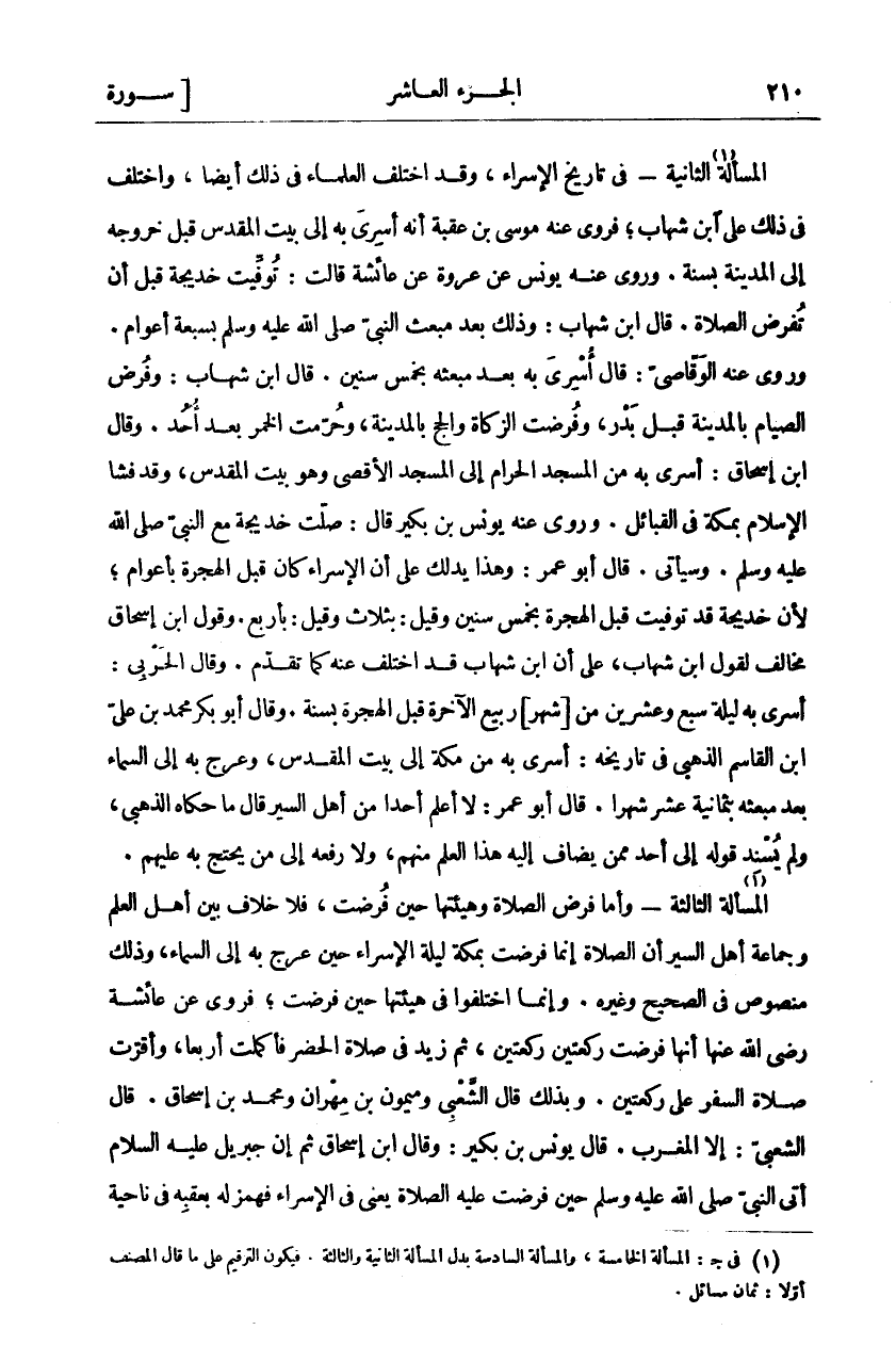الْمَسْأَلَةُ الثَّانِيَةُ «١» - فِي تَارِيخِ الْإِسْرَاءِ، وَقَدِ اخْتَلَفَ الْعُلَمَاءُ فِي ذَلِكَ أَيْضًا، وَاخْتُلِفَ فِي ذَلِكَ عَلَى ابْنِ شِهَابٍ، فَرَوَى عَنْهُ مُوسَى بْنُ عُقْبَةَ أَنَّهُ أُسْرِيَ بِهِ إِلَى بَيْتِ الْمَقْدِسِ قَبْلَ خُرُوجِهِ إِلَى الْمَدِينَةِ بِسَنَةٍ. وَرَوَى عَنْهُ يُونُسُ عَنْ عُرْوَةَ عَنْ عَائِشَةَ قَالَتْ: تُوُفِّيَتْ خَدِيجَةُ قَبْلَ أَنْ تُفْرَضَ الصَّلَاةُ. قَالَ ابْنُ شِهَابٍ: وَذَلِكَ بَعْدَ مَبْعَثِ النَّبِيِّ صَلَّى اللَّهُ عَلَيْهِ وَسَلَّمَ بِسَبْعَةِ أَعْوَامٍ. وَرُوِيَ عَنِ الْوَقَّاصِيِّ قَالَ: أُسْرِيَ بِهِ بَعْدَ مَبْعَثِهِ بِخَمْسِ سِنِينَ. قَالَ ابْنُ شِهَابٍ: وَفُرِضَ الصِّيَامُ بِالْمَدِينَةِ قَبْلَ بَدْرٍ، وَفُرِضَتِ الزَّكَاةُ وَالْحَجُّ بِالْمَدِينَةِ، وَحُرِّمَتِ الْخَمْرُ بَعْدَ أُحُدٍ. وَقَالَ ابْنُ إِسْحَاقَ: أُسْرِيَ بِهِ مِنَ الْمَسْجِدِ الْحَرَامِ إِلَى الْمَسْجِدِ الْأَقْصَى وَهُوَ بَيْتُ الْمَقْدِسِ، وَقَدْ فَشَا الْإِسْلَامُ بِمَكَّةَ فِي الْقَبَائِلِ. وَرَوَى عَنْهُ يُونُسُ بْنُ بُكَيْرٍ قَالَ: صَلَّتْ خَدِيجَةُ مَعَ النَّبِيِّ صَلَّى اللَّهُ عَلَيْهِ وَسَلَّمَ. وَسَيَأْتِي. قَالَ أَبُو عُمَرَ: وَهَذَا يَدُلُّكَ عَلَى أَنَّ الْإِسْرَاءَ كَانَ قَبْلَ الْهِجْرَةِ بِأَعْوَامٍ، لِأَنَّ خَدِيجَةَ قَدْ تُوُفِّيَتْ قَبْلَ الْهِجْرَةِ بِخَمْسِ سِنِينَ وَقِيلَ بِثَلَاثٍ وَقِيلَ بِأَرْبَعٍ. وَقَوْلُ ابْنِ إِسْحَاقَ مُخَالِفٌ لِقَوْلِ ابْنِ شِهَابٍ، عَلَى أَنَّ ابْنَ شِهَابٍ قَدِ اخْتُلِفَ عَنْهُ كَمَا تَقَدَّمَ. وَقَالَ الْحَرْبِيُّ: أُسْرِيَ بِهِ لَيْلَةَ سَبْعٍ وَعِشْرِينَ مِنْ شَهْرِ رَبِيعٍ الْآخِرِ قَبْلَ الْهِجْرَةِ بِسَنَةٍ. وقال أبو بكر محمد بن على ابن الْقَاسِمِ الذَّهَبِيُّ فِي تَارِيخِهِ: أُسْرِيَ بِهِ مِنْ مَكَّةَ إِلَى بَيْتِ الْمَقْدِسِ، وَعُرِجَ بِهِ إِلَى السَّمَاءِ بَعْدَ مَبْعَثِهِ بِثَمَانِيَةَ عَشَرَ شَهْرًا. قَالَ أَبُو عُمَرَ: لَا أَعْلَمُ أَحَدًا مِنْ أَهْلِ السِّيَرِ قَالَ مَا حَكَاهُ الذَّهَبِيُّ، وَلَمْ يُسْنِدْ قول إِلَى أَحَدٍ مِمَّنْ يُضَافُ إِلَيْهِ هَذَا الْعِلْمُ مِنْهُمْ، وَلَا رَفَعَهُ إِلَى مَنْ يُحْتَجُّ بِهِ عَلَيْهِمْ. الْمَسْأَلَةُ الثَّالِثَةُ «٢» - وَأَمَّا فَرْضُ الصَّلَاةِ وَهَيْئَتُهَا حِينَ فُرِضَتْ، فَلَا خِلَافَ بَيْنَ أَهْلِ الْعِلْمِ وَجَمَاعَةِ أَهْلِ السِّيَرِ أَنَّ الصَّلَاةَ إِنَّمَا فُرِضَتْ بِمَكَّةَ لَيْلَةَ الْإِسْرَاءِ حِينَ عُرِجَ بِهِ إِلَى السَّمَاءِ، وَذَلِكَ مَنْصُوصٌ فِي الصَّحِيحِ وَغَيْرِهِ. وَإِنَّمَا اخْتَلَفُوا فِي هَيْئَتِهَا حِينَ فُرِضَتْ، فَرُوِيَ عَنْ عَائِشَةَ رَضِيَ اللَّهُ عَنْهَا أَنَّهَا فُرِضَتْ رَكْعَتَيْنِ رَكْعَتَيْنِ، ثُمَّ زِيدَ فِي صَلَاةِ الْحَضَرِ فَأُكْمِلَتْ أَرْبَعًا، وَأُقِرَّتْ صَلَاةُ السَّفَرِ عَلَى رَكْعَتَيْنِ. وَبِذَلِكَ قَالَ الشَّعْبِيُّ وَمَيْمُونُ بْنُ مِهْرَانَ وَمُحَمَّدُ بْنُ إِسْحَاقَ. قَالَ الشَّعْبِيُّ: إِلَّا الْمَغْرِبَ. قَالَ يُونُسُ بْنُ بُكَيْرٍ: وَقَالَ ابْنُ إِسْحَاقَ ثُمَّ إِنَّ جِبْرِيلَ عَلَيْهِ السَّلَامُ أَتَى النَّبِيَّ صَلَّى اللَّهُ عَلَيْهِ وَسَلَّمَ حِينَ فُرِضَتْ عَلَيْهِ الصَّلَاةُ يَعْنِي فِي الْإِسْرَاءِ فَهَمَزَ لَهُ بِعَقِبِهِ فِي نَاحِيَةِ