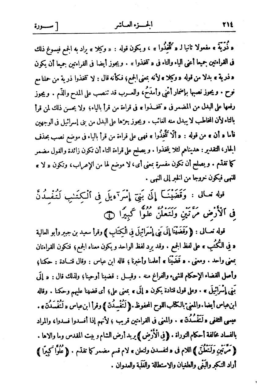 قَوْلُهُ تَعَالَى: (وَقَضَيْنا إِلى بَنِي إِسْرائِيلَ فِي الْكِتابِ) وَقَرَأَ سَعِيدُ بْنُ جُبَيْرٍ وَأَبُو الْعَالِيَةِ" فِي الْكُتُبِ" عَلَى لَفْظِ الْجَمْعِ. وَقَدْ يَرِدُ لَفْظُ الْوَاحِدِ وَيَكُونُ مَعْنَاهُ الْجَمْعُ، فَتَكُونُ الْقِرَاءَتَانِ بِمَعْنًى وَاحِدٍ. وَمَعْنَى" قَضَيْنا" أَعْلَمْنَا وَأَخْبَرْنَا، قَالَهُ ابْنُ عَبَّاسٍ: وَقَالَ قَتَادَةُ: حَكَمْنَا، وَأَصْلُ الْقَضَاءِ الْإِحْكَامُ لِلشَّيْءِ وَالْفَرَاغُ مِنْهُ، وَقِيلَ: قَضَيْنَا أَوْحَيْنَا، وَلِذَلِكَ قَالَ:" إِلى بَنِي إِسْرائِيلَ". وَعَلَى قَوْلِ قَتَادَةَ يَكُونُ" إِلى " بِمَعْنَى عَلَى، أَيْ قَضَيْنَا عَلَيْهِمْ وَحَكَمْنَا. وَقَالَهُ ابْنُ عَبَّاسٍ أَيْضًا. وَالْمَعْنِيُّ بِالْكِتَابِ اللَّوْحُ الْمَحْفُوظُ. (لَتُفْسِدُنَّ) وَقَرَأَ ابْنُ عَبَّاسٍ" لَتُفْسِدُنَّ". عِيسَى الثَّقَفِيُّ" لَتُفْسِدُنَّ". وَالْمَعْنَى فِي الْقِرَاءَتَيْنِ قَرِيبٌ، لِأَنَّهُمْ إِذَا أَفْسَدُوا فَسَدُوا، وَالْمُرَادُ بِالْفَسَادِ مُخَالَفَةُ أَحْكَامِ التَّوْرَاةِ. (فِي الْأَرْضِ) يُرِيدُ أَرْضَ الشَّامِ وبئت المقدس وما والاها. (مَرَّتَيْنِ وَلَتَعْلُنَّ) اللام في" لَتُفْسِدُنَّ ولَتَعْلُنَّ" لَامُ قَسَمٍ مُضْمَرٍ كَمَا تَقَدَّمَ. (عُلُوًّا كَبِيراً) أَرَادَ التَّكَبُّرَ وَالْبَغْيَ وَالطُّغْيَانَ وَالِاسْتِطَالَةَ وَالْغَلَبَةَ والعدوان.