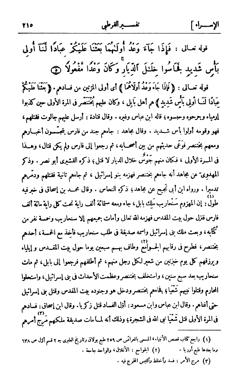 قَوْلُهُ تَعَالَى: (فَإِذا جاءَ وَعْدُ أُولاهُما) أَيْ أُولَى الْمَرَّتَيْنِ مِنْ فَسَادِهِمْ. (بَعَثْنا عَلَيْكُمْ عِباداً لَنا أُولِي بَأْسٍ شَدِيدٍ) هم أهل بابل، وكان عليهم بخت نصر في المرة الاولى حين كذبوا إرميا وَجَرَحُوهُ وَحَبَسُوهُ، قَالَهُ ابْنُ عَبَّاسٍ وَغَيْرُهُ. وَقَالَ قَتَادَةُ: أَرْسَلَ عَلَيْهِمْ جَالُوتَ فَقَتَلَهُمْ، فَهُوَ وَقَوْمُهُ أُولُو بَأْسٍ شَدِيدٍ. وَقَالَ مُجَاهِدٌ: جَاءَهُمْ جُنْدٌ من فارس يتجسسون أخبارهم ومعهم بخت نصر فَوَعَى حَدِيثَهُمْ مِنْ بَيْنِ أَصْحَابِهِ، ثُمَّ رَجَعُوا إِلَى فَارِسَ وَلَمْ يَكُنْ قِتَالٌ، وَهَذَا فِي الْمَرَّةِ الْأُولَى، فَكَانَ مِنْهُمْ جَوْسٌ خِلَالَ الدِّيَارِ لَا قَتْلَ، ذَكَرَهُ الْقُشَيْرِيُّ أَبُو نَصْرٍ. وَذَكَرَ المهدوي عن مجاهد أنه جاءهم بخت نصر فَهَزَمَهُ بَنُو إِسْرَائِيلَ، ثُمَّ جَاءَهُمْ ثَانِيَةً فَقَتَلَهُمْ وَدَمَّرَهُمْ تَدْمِيرًا. وَرَوَاهُ ابْنُ أَبِي نَجِيحٍ عَنْ مُجَاهِدٍ، ذَكَرَهُ النَّحَّاسُ. وَقَالَ مُحَمَّدُ بْنُ إِسْحَاقَ فِي خَبَرٍ فِيهِ طُولٌ «١»: إِنَّ الْمَهْزُومَ سَنْحَارِيبُ مَلِكُ بَابِلَ، جَاءَ وَمَعَهُ سِتُّمِائَةِ أَلْفَ رَايَةٍ تَحْتَ كُلِّ رَايَةٍ مِائَةُ أَلْفِ فَارِسٍ فَنَزَلَ حَوْلَ بَيْتِ الْمَقْدِسِ فَهَزَمَهُ اللَّهُ تَعَالَى وَأَمَاتَ جَمِيعَهُمْ إِلَّا سَنْحَارِيبَ وَخَمْسَةَ نَفَرٍ مِنْ كُتَّابِهِ، وَبَعَثَ مَلِكُ بَنِي إِسْرَائِيلَ وَاسْمُهُ صديقَةُ فِي طلب سنحاريب فأخذ مع الخمسة، أحدهم بخت نصر، فَطَرَحَ فِي رِقَابِهِمُ الْجَوَامِعَ «٢» وَطَافَ بِهِمْ سَبْعِينَ يَوْمًا حَوْلَ بَيْتِ الْمَقْدِسِ وَإِيلِيَاءَ وَيَرْزُقُهُمْ كُلَّ يَوْمٍ خُبْزَتَيْنِ مِنْ شَعِيرٍ لِكُلِّ رَجُلٍ مِنْهُمْ، ثُمَّ أَطْلَقَهُمْ فَرَجَعُوا إِلَى بَابِلَ، ثُمَّ مَاتَ سنحاريب بعد سبع سنين، واستخلف بخت نصر وَعَظُمَتِ الْأَحْدَاثُ فِي بَنِي إِسْرَائِيلَ، وَاسْتَحَلُّوا الْمَحَارِمَ وقتلوا نبيهم شعيا، فجاءهم بخت نصر وَدَخَلَ هُوَ وَجُنُودُهُ بَيْتَ الْمَقْدِسِ وَقَتَلَ بَنِي إِسْرَائِيلَ حَتَّى أَفْنَاهُمْ. وَقَالَ ابْنُ عَبَّاسٍ وَابْنُ مَسْعُودٍ: أَوَّلُ الْفَسَادِ قَتْلُ زَكَرِيَّا. وَقَالَ ابْنُ إِسْحَاقَ: فَسَادُهُمْ فِي الْمَرَّةِ الْأُولَى قَتْلُ شَعْيَا نَبِيِّ اللَّهِ فِي الشَّجَرَةِ، وَذَلِكَ أَنَّهُ لَمَّا مات صديقة ملكهم مرج «٣» أمرهم