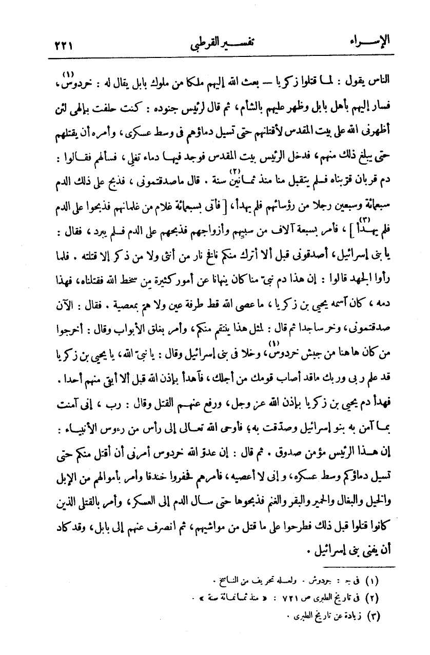 النَّاسِ يَقُولُ: لَمَّا قَتَلُوا زَكَرِيَّا- بَعَثَ اللَّهُ إِلَيْهِمْ مَلِكًا مِنْ مُلُوكِ بَابِلَ يُقَالُ لَهُ: خَردُوسُ «١»، فَسَارَ إِلَيْهِمْ بِأَهْلِ بَابِلَ وَظَهَرَ عَلَيْهِمْ بِالشَّأْمِ، ثُمَّ قَالَ لِرَئِيسِ جُنُودِهِ: كُنْتُ حَلَفْتُ بِإِلَهِي لَئِنْ أَظْهَرَنِي اللَّهُ عَلَى بَيْتِ الْمَقْدِسِ لَأَقْتُلَنَّهُمْ حَتَّى تَسِيلَ دِمَاؤُهُمْ فِي وَسَطِ عَسْكَرِي، وَأَمَرَ أَنْ يَقْتُلَهُمْ حَتَّى يَبْلُغَ ذَلِكَ مِنْهُمْ، فَدَخَلَ الرَّئِيسُ بَيْتَ الْمَقْدِسِ فَوَجَدَ فِيهَا دِمَاءً تَغْلِي، فَسَأَلَهُمْ فَقَالُوا: دَمُ قُرْبَانٍ قَرَّبْنَاهُ فَلَمْ يُتَقَبَّلْ مِنَّا مُنْذُ ثَمَانِينَ «٢» سَنَةً. قَالَ مَا صَدَقْتُمُونِي، فَذَبَحَ عَلَى ذَلِكَ الدَّمِ سَبْعَمِائَةٍ وَسَبْعِينَ رَجُلًا مِنْ رُؤَسَائِهِمْ فَلَمْ يَهْدَأْ، فَأَتَى بِسَبْعِمِائَةِ غُلَامٍ مِنْ غِلْمَانِهِمْ فَذُبِحُوا عَلَى الدَّمِ فَلَمْ يَهْدَأْ «٣»، فَأَمَرَ بِسَبْعَةِ آلَافٍ مِنْ سَبْيِهِمْ وَأَزْوَاجِهِمْ فَذَبَحَهُمْ عَلَى الدَّمِ فَلَمْ يَبْرُدْ، فَقَالَ: يَا بَنِي إِسْرَائِيلَ، اصْدُقُونِي قَبْلَ أَلَّا أَتْرُكَ مِنْكُمْ نَافِخُ نَارٍ مِنْ أُنْثَى وَلَا مِنْ ذَكَرٍ إِلَّا قَتَلْتُهُ. فَلَمَّا رَأَوُا الْجَهْدَ قَالُوا: إِنَّ هَذَا دَمُ نَبِيٍّ مِنَّا كَانَ يَنْهَانَا عَنْ أُمُورٍ كَثِيرَةٍ مِنْ سُخْطِ اللَّهِ فَقَتَلْنَاهُ، فَهَذَا دَمُهُ، كَانَ اسْمُهُ يَحْيَى بْنُ زَكَرِيَّا، مَا عَصَى اللَّهَ قَطُّ طَرْفَةَ عَيْنٍ وَلَا هَمَّ بِمَعْصِيَةٍ. فَقَالَ: الْآنَ صَدَقْتُمُونِي، وَخَرَّ سَاجِدًا ثُمَّ قَالَ: لِمِثْلِ هَذَا يُنْتَقَمُ مِنْكُمْ، وَأَمَرَ بِغَلْقِ الْأَبْوَابِ وَقَالَ: أَخْرِجُوا مَنْ كَانَ هَاهُنَا مِنْ جَيْشِ خَردُوسَ «٤»، وَخَلَا فِي بَنِي إِسْرَائِيلَ وَقَالَ: يَا نَبِيَّ اللَّهِ يَا يَحْيَى بْنَ زَكَرِيَّا قَدْ عَلِمَ رَبِّي وَرَبُّكَ مَا قَدْ أَصَابَ قَوْمَكَ مِنْ أَجْلِكَ، فَاهْدَأْ بِإِذْنِ اللَّهِ قَبْلَ أَلَّا أُبْقِيَ مِنْهُمْ أَحَدًا. فَهَدَأَ دَمُ يَحْيَى بْنِ زَكَرِيَّا بِإِذْنِ اللَّهِ عَزَّ وَجَلَّ، وَرَفَعَ عَنْهُمُ الْقَتْلَ وَقَالَ: رَبِّ إِنِّي آمَنْتُ بِمَا آمَنَ بِهِ بَنُو إِسْرَائِيلَ وَصَدَّقْتُ بِهِ، فَأَوْحَى اللَّهُ تَعَالَى إِلَى رَأْسٍ مِنْ رُءُوسِ الْأَنْبِيَاءِ: إِنَّ هَذَا الرَّئِيسَ مُؤْمِنٌ صَدُوقٌ. ثُمَّ قَالَ: إِنَّ عَدُوَّ اللَّهِ خَرْدُوسَ أَمَرَنِي أَنْ أَقْتُلَ مِنْكُمْ حَتَّى تَسِيلَ دِمَاؤُكُمْ وَسَطَ عَسْكَرِهِ، وَإِنِّي لَا أَعْصِيهِ، فَأَمَرَهُمْ فَحَفَرُوا خَنْدَقًا وَأَمَرَ بِأَمْوَالِهِمْ مِنَ الْإِبِلِ وَالْخَيْلِ وَالْبِغَالِ وَالْحَمِيرِ وَالْبَقَرِ وَالْغَنَمِ فَذَبَحُوهَا حَتَّى سَالَ الدَّمُ إِلَى الْعَسْكَرِ، وَأَمَرَ بِالْقَتْلَى الَّذِينَ كَانُوا قُتِلُوا قَبْلَ ذَلِكَ فَطُرِحُوا عَلَى مَا قُتِلَ مِنْ مَوَاشِيهِمْ، ثُمَّ انْصَرَفَ عَنْهُمْ إِلَى بَابِلَ، وَقَدْ كَادَ أَنْ يُفْنِيَ بنى إسرائيل.