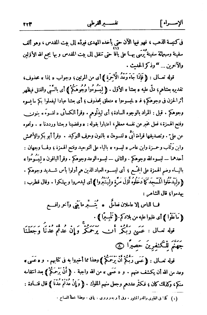 فِي كَنِيسَةِ الذَّهَبَ، فَهُوَ فِيهَا الْآنَ حَتَّى يَأْخُذَهُ الْمَهْدِيُّ فَيَرُدَّهُ إِلَى بَيْتِ الْمَقْدِسِ، وَهُوَ أَلْفُ سَفِينَةٍ وَسَبْعُمِائَةِ سَفِينَةٍ يُرْسَى بِهَا عَلَى يَافَا «١» حَتَّى تُنْقَلَ إِلَى بَيْتِ الْمَقْدِسِ وَبِهَا يَجْمَعُ اللَّهُ الْأَوَّلِينَ وَالْآخِرِينَ ... " وَذَكَرَ الْحَدِيثَ. قَوْلُهُ تَعَالَى: (فَإِذا جاءَ وَعْدُ الْآخِرَةِ) أَيْ مِنَ الْمَرَّتَيْنِ، وَجَوَابُ" إِذَا" مَحْذُوفٌ، تَقْدِيرُهُ بَعَثْنَاهُمْ، دَلَّ عليه" بَعَثْنا" الأول. (لِيَسُوؤُا وُجُوهَكُمْ) أَيْ بِالسَّبْيِ وَالْقَتْلِ فَيَظْهَرُ أَثَرُ الْحُزْنِ في وجوهكم، ف" لِيَسُوؤُا" مُتَعَلِّقٌ بِمَحْذُوفٍ، أَيْ بَعَثْنَا عِبَادًا لِيَفْعَلُوا بِكُمْ مَا يَسُوءُ وُجُوهَكُمْ. قِيلَ: الْمُرَادُ بِالْوُجُوهِ السَّادَةُ، أَيْ لِيُذِلُّوهُمْ. وَقَرَأَ الْكِسَائِيُّ" لِنَسُوءَ" بِنُونٍ وَفَتْحِ الْهَمْزَةِ، فِعْلُ مُخْبِرٍ عَنْ نَفْسِهِ مُعَظَّمٍ، اعْتِبَارًا بِقَوْلِهِ: وَقَضَيْنَا وَبَعَثْنَا وَرَدَدْنَا". وَنَحْوُهُ عَنْ عَلِيٍّ. وتصديقها قراءة أبى" لنسوأن" بِالنُّونِ وَحَرْفِ التَّوْكِيدِ. وَقَرَأَ أَبُو بَكْرٍ وَالْأَعْمَشُ وَابْنُ وَثَّابٍ وَحَمْزَةُ وَابْنُ عَامِرٍ" لِيَسُوءَ" بِالْيَاءِ عَلَى التَّوْحِيدِ وَفَتْحِ الْهَمْزَةِ، وَلَهَا وَجْهَانِ: أَحَدُهُمَا- لِيَسُوءَ اللَّهُ وُجُوهَكُمْ. وَالثَّانِي- لِيَسُوءَ الْوَعْدُ وُجُوهَكُمْ. وقرا الباقون" لِيَسُوؤُا" بِالْيَاءِ وَضَمِّ الْهَمْزَةِ عَلَى الْجَمْعِ، أَيْ لِيَسُوءَ الْعِبَادُ الَّذِينَ هُمْ أُولُو بَأْسٍ شَدِيدٍ وُجُوهَكُمْ. (وَلِيَدْخُلُوا الْمَسْجِدَ كَما دَخَلُوهُ أَوَّلَ مَرَّةٍ وَلِيُتَبِّرُوا) أَيْ لِيُدَمِّرُوا وَيُهْلِكُوا. وَقَالَ قُطْرُبٌ: يَهْدِمُوا، قَالَ الشَّاعِرُ: