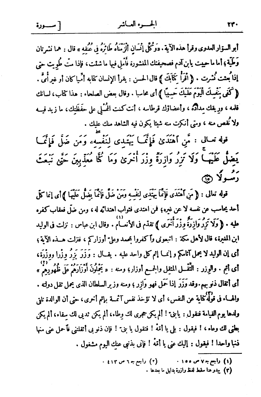 قَوْلُهُ تَعَالَى: (مَنِ اهْتَدى فَإِنَّما يَهْتَدِي لِنَفْسِهِ وَمَنْ ضَلَّ فَإِنَّما يَضِلُّ عَلَيْها) أَيْ إِنَّمَا كُلُّ أَحَدٍ يُحَاسَبُ عَنْ نَفْسِهِ لَا عَنْ غَيْرِهِ، فَمَنِ اهْتَدَى فَثَوَابُ اهْتِدَائِهِ لَهُ، وَمَنْ ضَلَّ فَعِقَابُ كُفْرِهِ عَلَيْهِ. (وَلا تَزِرُ وازِرَةٌ وِزْرَ أُخْرى) تقدم في الانعام «١». وقا ابْنُ عَبَّاسٍ: نَزَلَتْ فِي الْوَلِيدِ بْنِ الْمُغِيرَةِ، قَالَ لِأَهْلِ مَكَّةَ: اتَّبِعُونِ وَاكْفُرُوا بِمُحَمَّدٍ وَعَلَيَّ أو زاركم، فَنَزَلَتْ هَذِهِ الْآيَةُ، أَيْ إِنَّ الْوَلِيدَ لَا يَحْمِلُ آثَامَكُمْ وَإِنَّمَا إِثْمُ كُلِّ وَاحِدٍ عَلَيْهِ. يُقَالُ: وَزَرَ يَزِرُ وِزْرًا، وَوِزْرَةً، أَيْ أَثِمَ. وَالْوِزْرُ: الثِّقَلُ الْمُثَقَّلُ وَالْجَمْعُ أَوْزَارٌ، وَمِنْهُ" يَحْمِلُونَ أَوْزارَهُمْ عَلى ظُهُورِهِمْ «٢» " أَيْ أَثْقَالَ ذُنُوبِهِمْ. وَقَدْ وَزَرَ إِذَا حَمَلَ فَهُوَ وَازِرٌ، وَمِنْهُ وَزِيرُ السُّلْطَانِ الَّذِي يَحْمِلُ ثِقَلَ دَوْلَتِهِ. وَالْهَاءُ فِي قَوْلِهِ «٣» كِنَايَةٌ عَنِ النَّفْسِ، أَيْ لَا تُؤْخَذُ نَفْسٌ آثِمَةٌ بِإِثْمِ أُخْرَى، حَتَّى أَنَّ الْوَالِدَةَ تَلْقَى وَلَدَهَا يَوْمَ الْقِيَامَةِ فَتَقُولُ: يَا بُنَيَّ أَلَمْ يَكُنْ حِجْرِي لَكَ وِطَاءٌ، أَلَمْ يَكُنْ ثَدْيِي لَكَ سِقَاءٌ، أَلَمْ يَكُنْ بَطْنِي لَكَ وِعَاءٌ،! فَيَقُولُ: بَلَى يَا! أُمَّهْ فَتَقُولُ يَا بُنَيَّ! فَإِنَّ ذُنُوبِي أَثْقَلَتْنِي فَاحْمِلْ عَنِّي مِنْهَا ذَنْبًا وَاحِدًا! فَيَقُولُ: إِلَيْكَ عَنِّي يَا أُمَّهْ! فإنى بذنبي عنك اليوم مشغول.