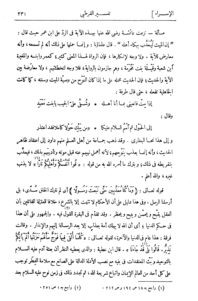وَإِلَى هَذَا نَحَا الْبُخَارِيُّ. وَقَدْ ذَهَبَ جَمَاعَةٌ مِنْ أَهْلِ الْعِلْمِ مِنْهُمْ دَاوُدُ إِلَى اعْتِقَادِ ظَاهِرِ الْحَدِيثِ، وَأَنَّهُ إِنَّمَا يُعَذَّبُ بِنَوْحِهِمْ، لِأَنَّهُ أَهْمَلَ نَهْيَهُمْ عَنْهُ قَبْلَ مَوْتِهِ وَتَأْدِيبِهِمْ بِذَلِكَ، فَيُعَذَّبُ بِتَفْرِيطِهِ فِي ذَلِكَ، وَبِتَرْكِ مَا أَمَرَهُ اللَّهُ بِهِ مِنْ قَوْلِهِ:" قُوا أَنْفُسَكُمْ وَأَهْلِيكُمْ نَارًا «١» " لَا بِذَنْبِ غَيْرِهِ، وَاللَّهُ أَعْلَمُ. قَوْلُهُ تَعَالَى: (وَما كُنَّا مُعَذِّبِينَ حَتَّى نَبْعَثَ رَسُولًا)